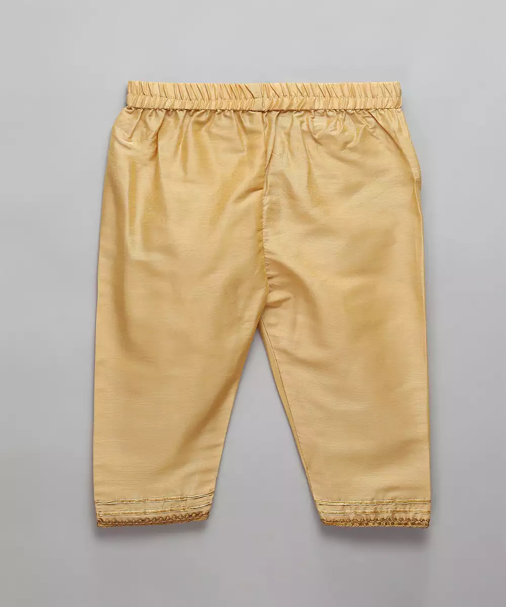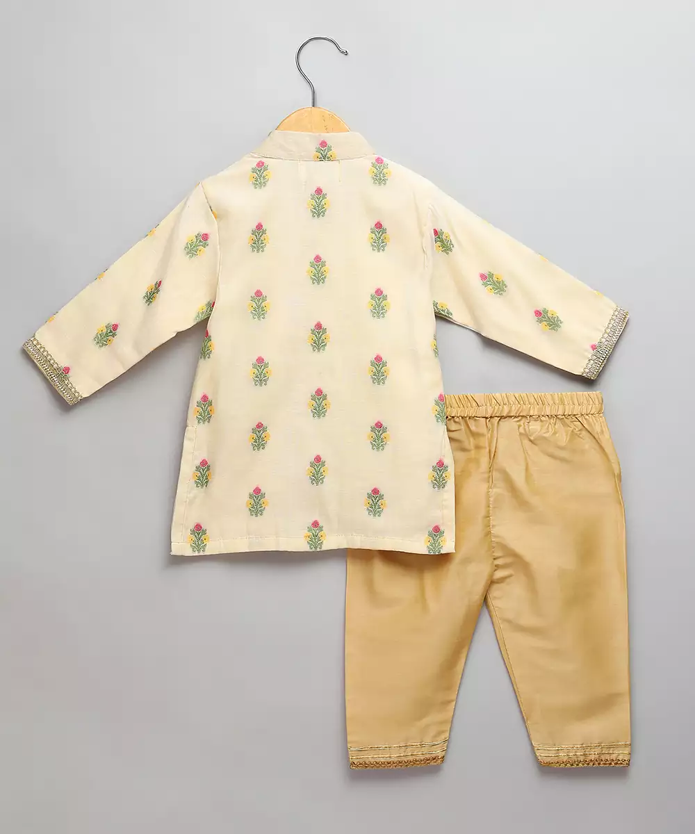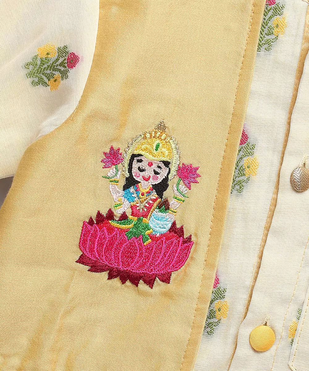 Beige Cotton Chanderi Booti Kurta With Front Opening. Attached Laxmi Goddess Embroidery Panel On One Side Of The Kurta .Lace Finishings. Pajama With Elastic