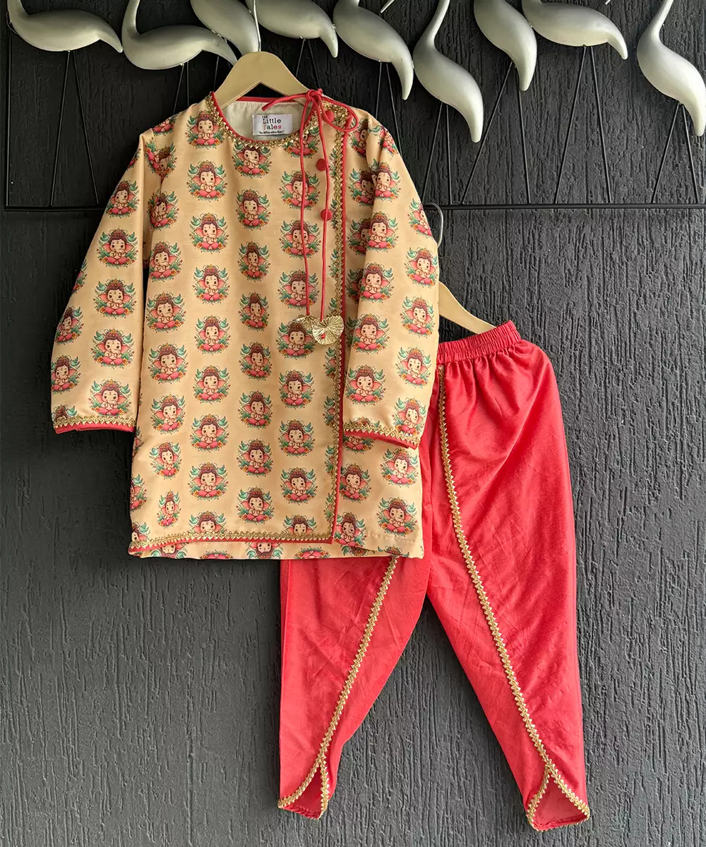 Ganpati Printed Kurta Set With Cotton Linings . Bottom Dhoti With Elasticated Waist . Colour: Beige Fabric:Cotton Silk Components: 1 Kurta / 1 Dhoti