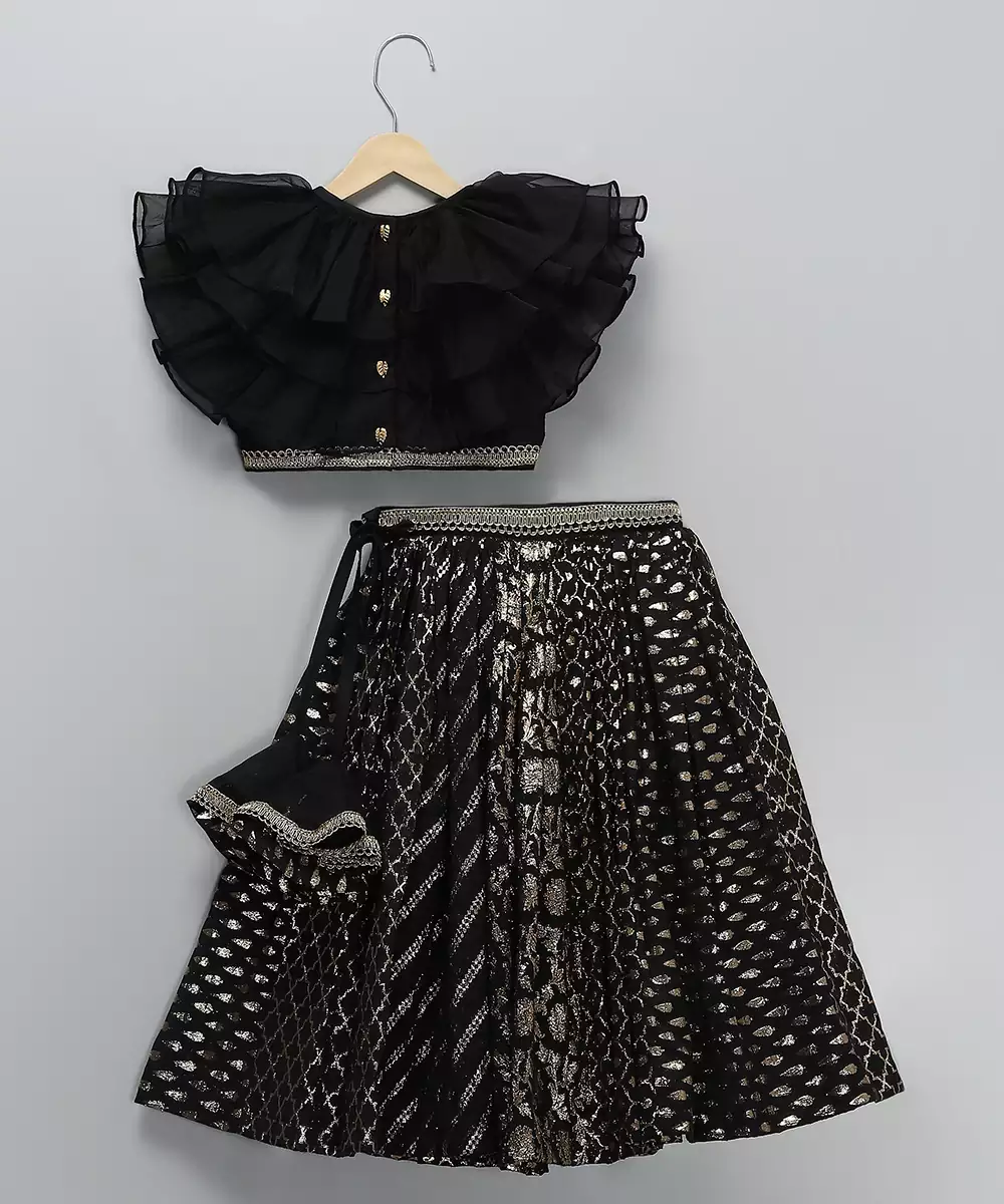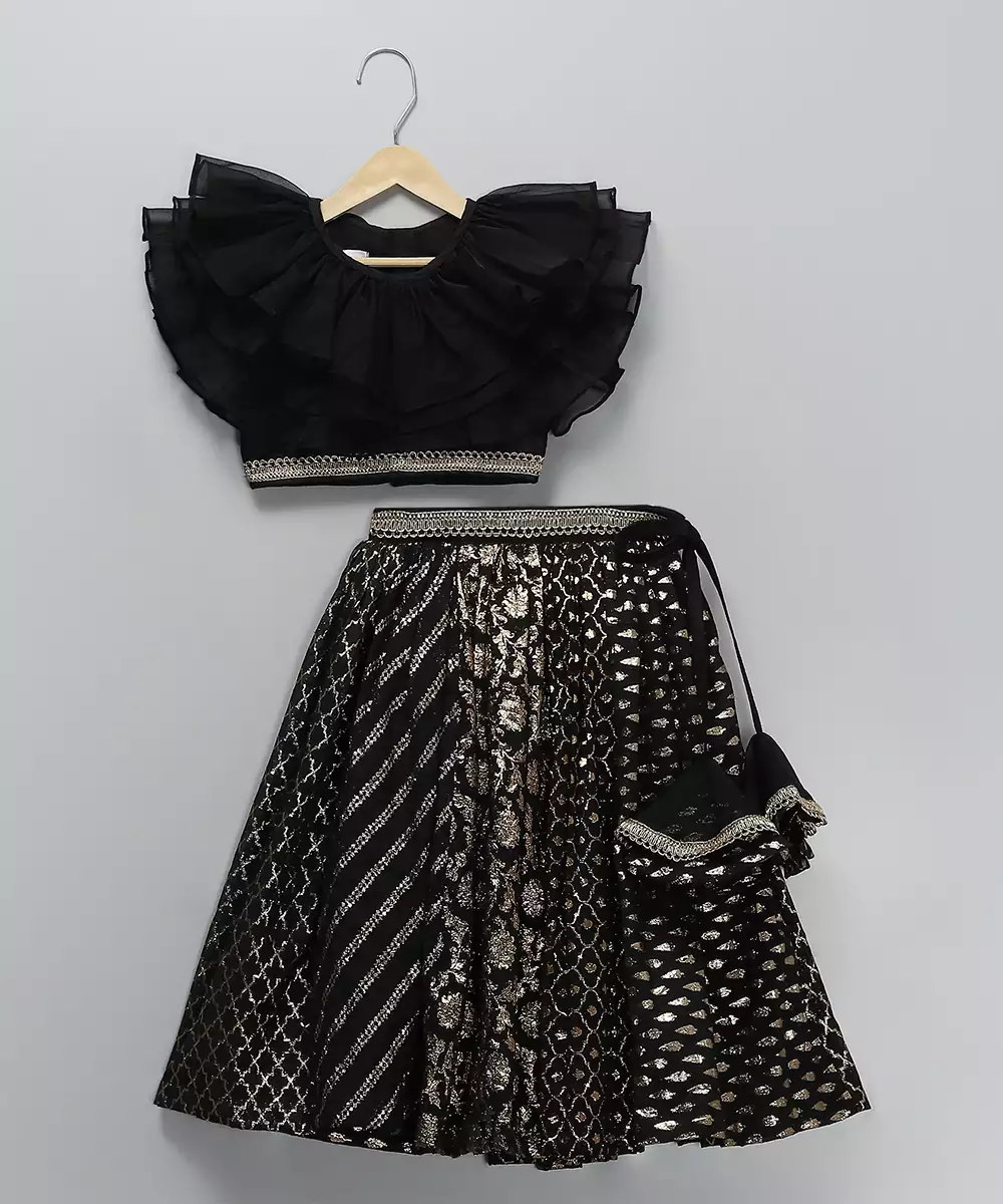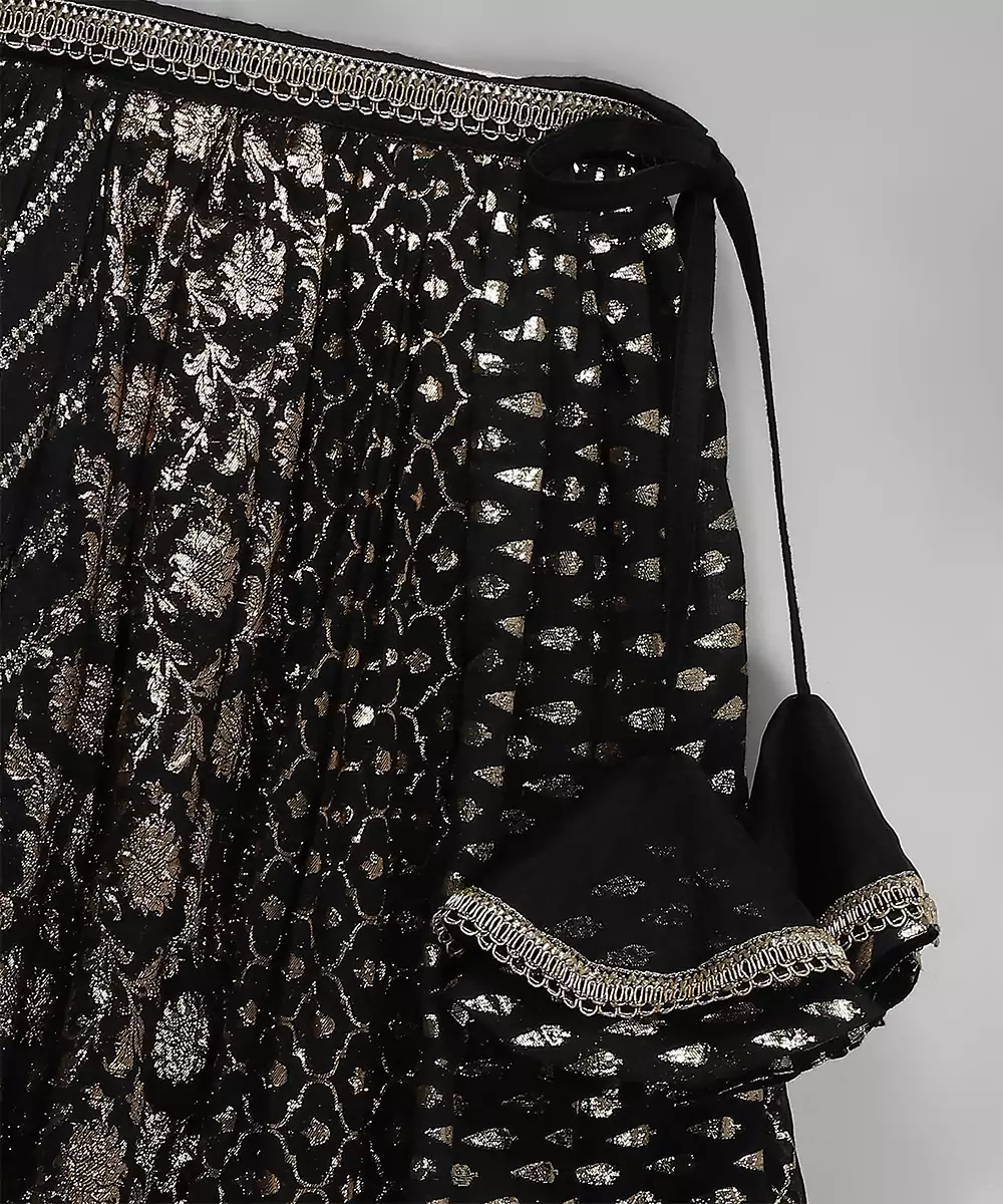 This Black Embroidered Organza Lehenga Set Exudes Sophistication With Its Sheer, Lightweight Fabric And Intricate Detailing. The Delicate Embroidery Adds A Luxurious Touch, While The Organza Flare Creates An Elegant Silhouette. Perfect For Weddings, Receptions, And Festive Occasions, It Pairs Beautifully With A Statement Blouse For A Striking, Timeless Look.