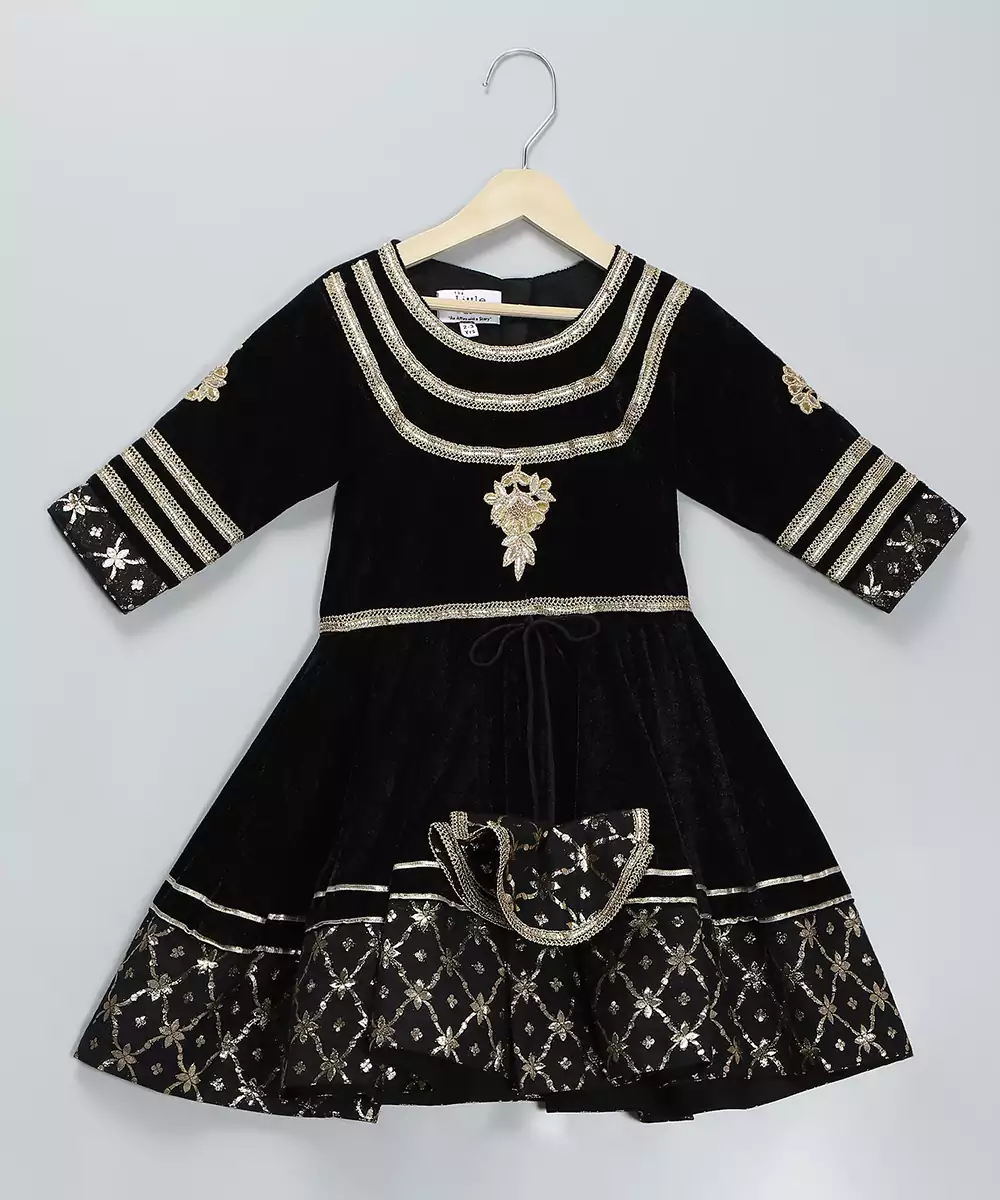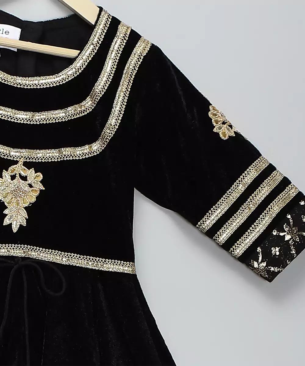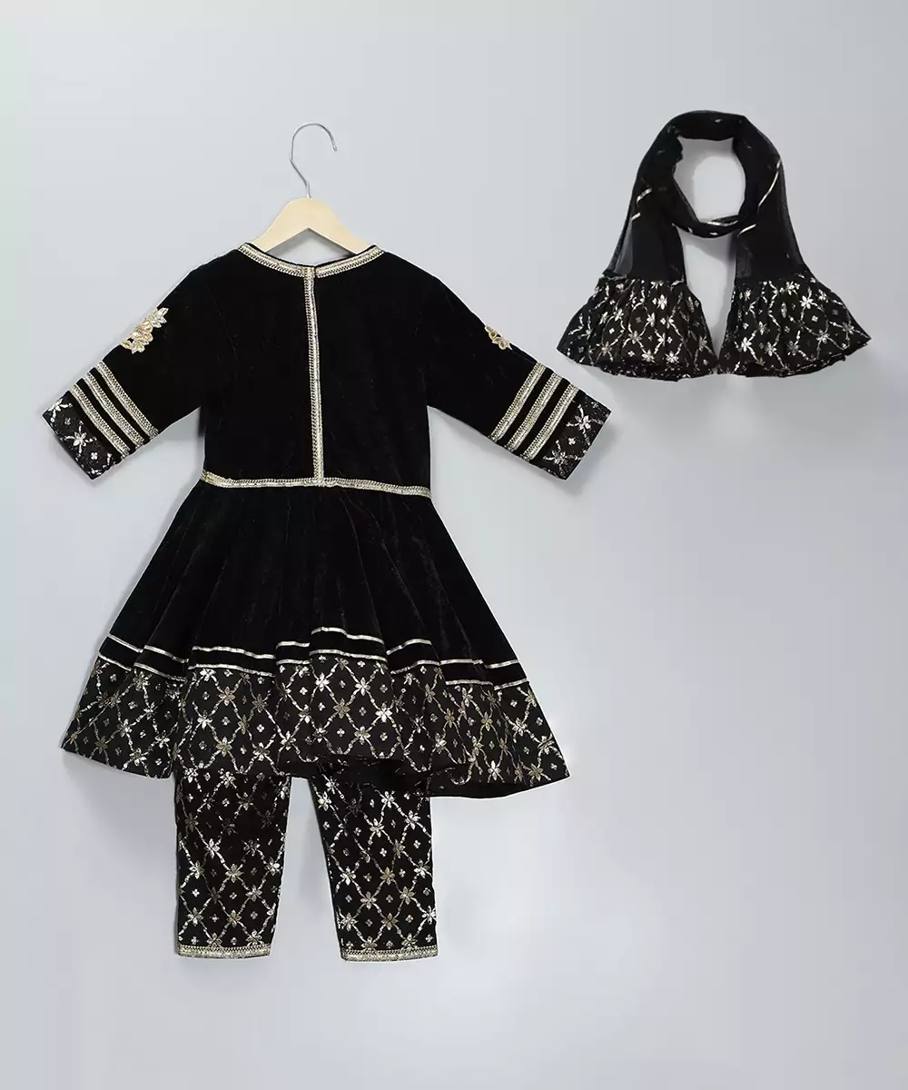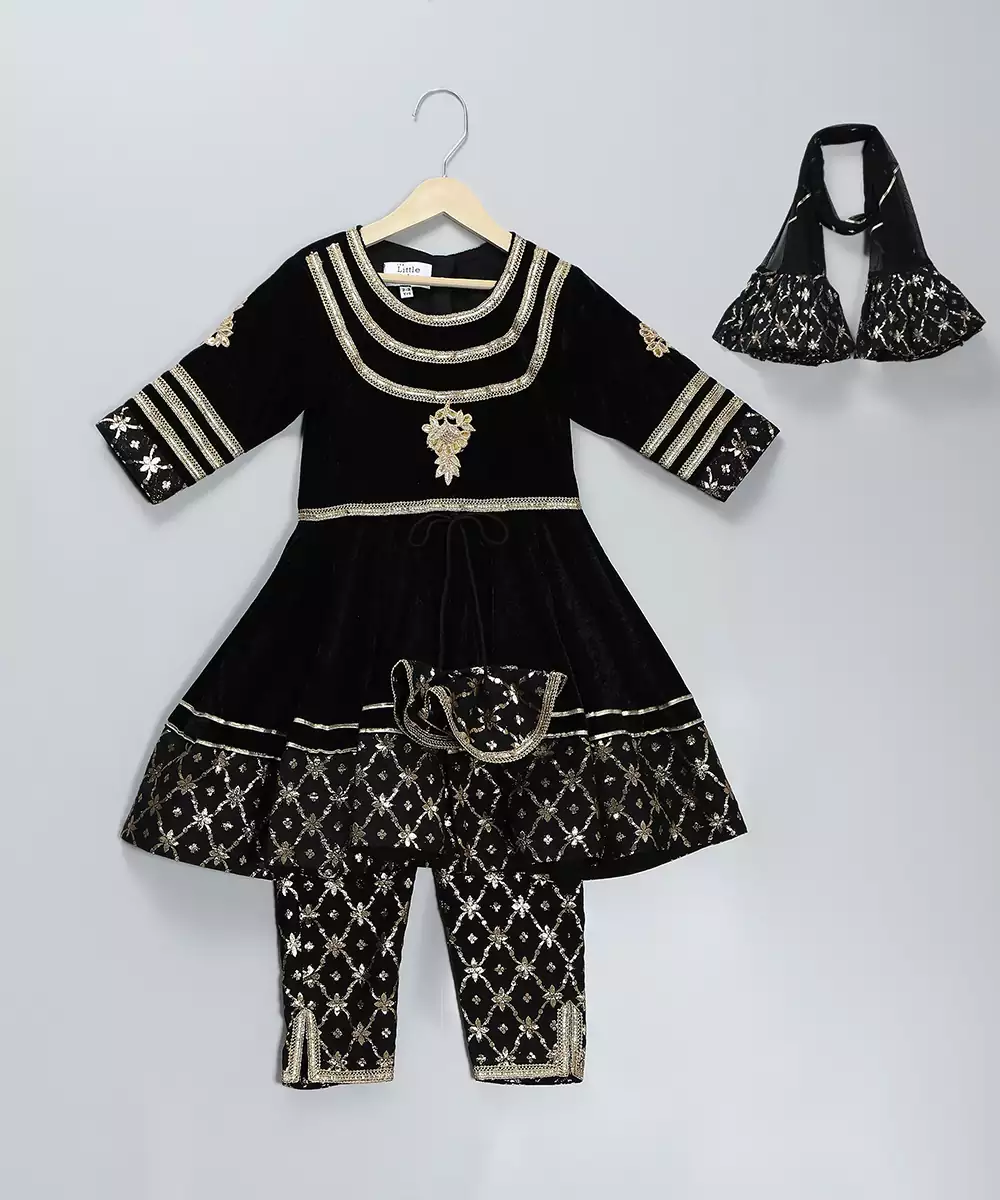 This Black Embroidered Velvet Kurta Set Radiates Luxury With Its Rich Velvet Fabric And Intricate Detailing. The Plush Texture Offers A Regal Drape, While The Fine Embroidery Enhances Its Elegant Appeal. Perfect For Weddings, Receptions, And Festive Occasions, It Creates A Timeless, Graceful Silhouette Paired With Its Complementing Dupatta.