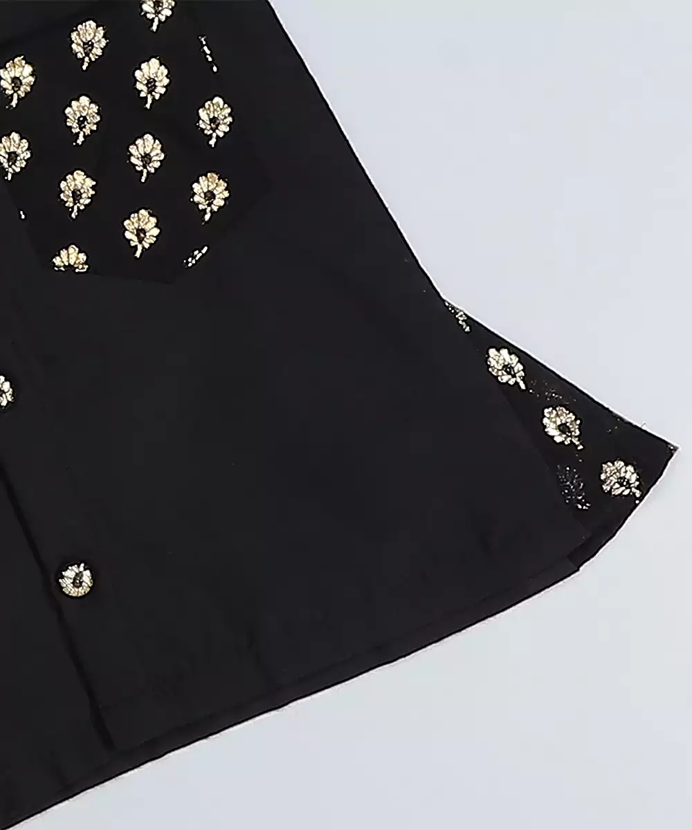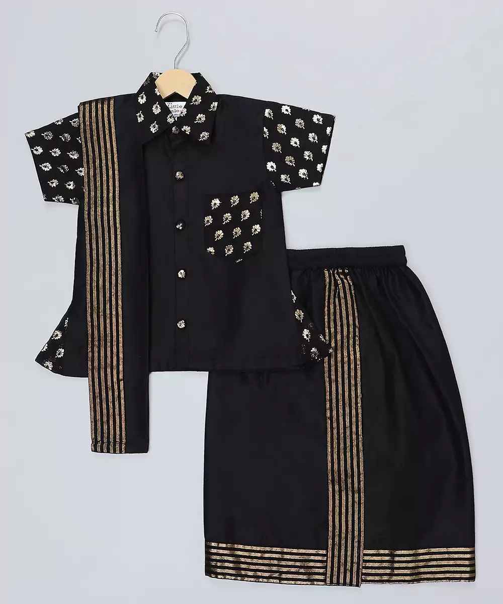 Black Cotton Silk Shirt Kurta With Chanderi Accessorization. Pleated Patka Of Cotton Silk With Chanderi Borders. Lungi In Cotton Silk And With Chanderi Fabric Finishings And With Elasticated Waist
