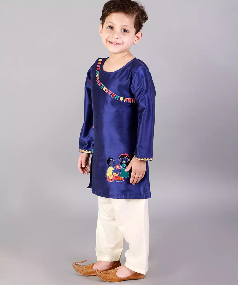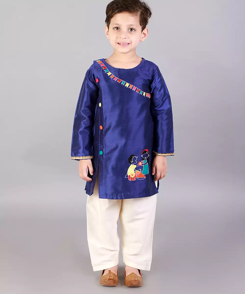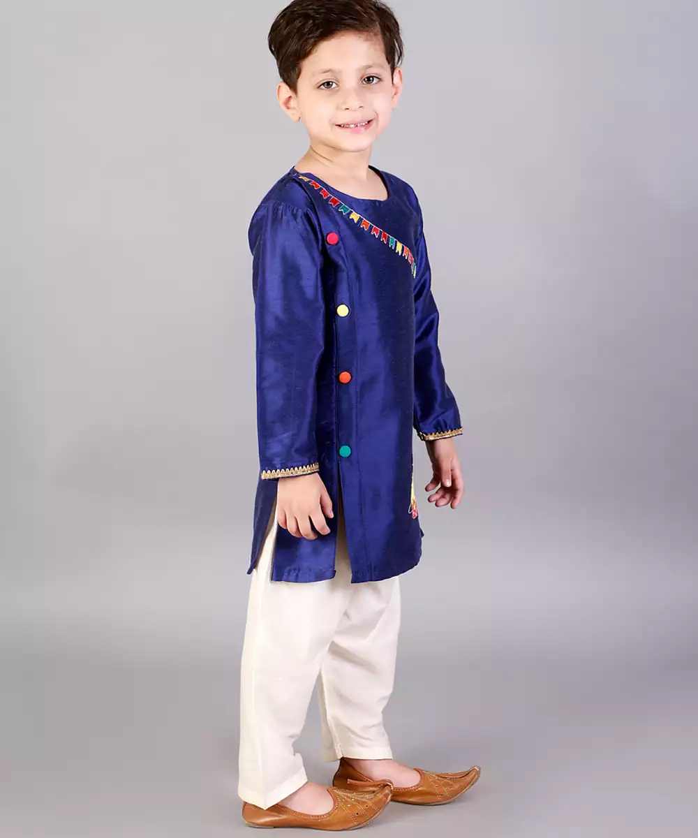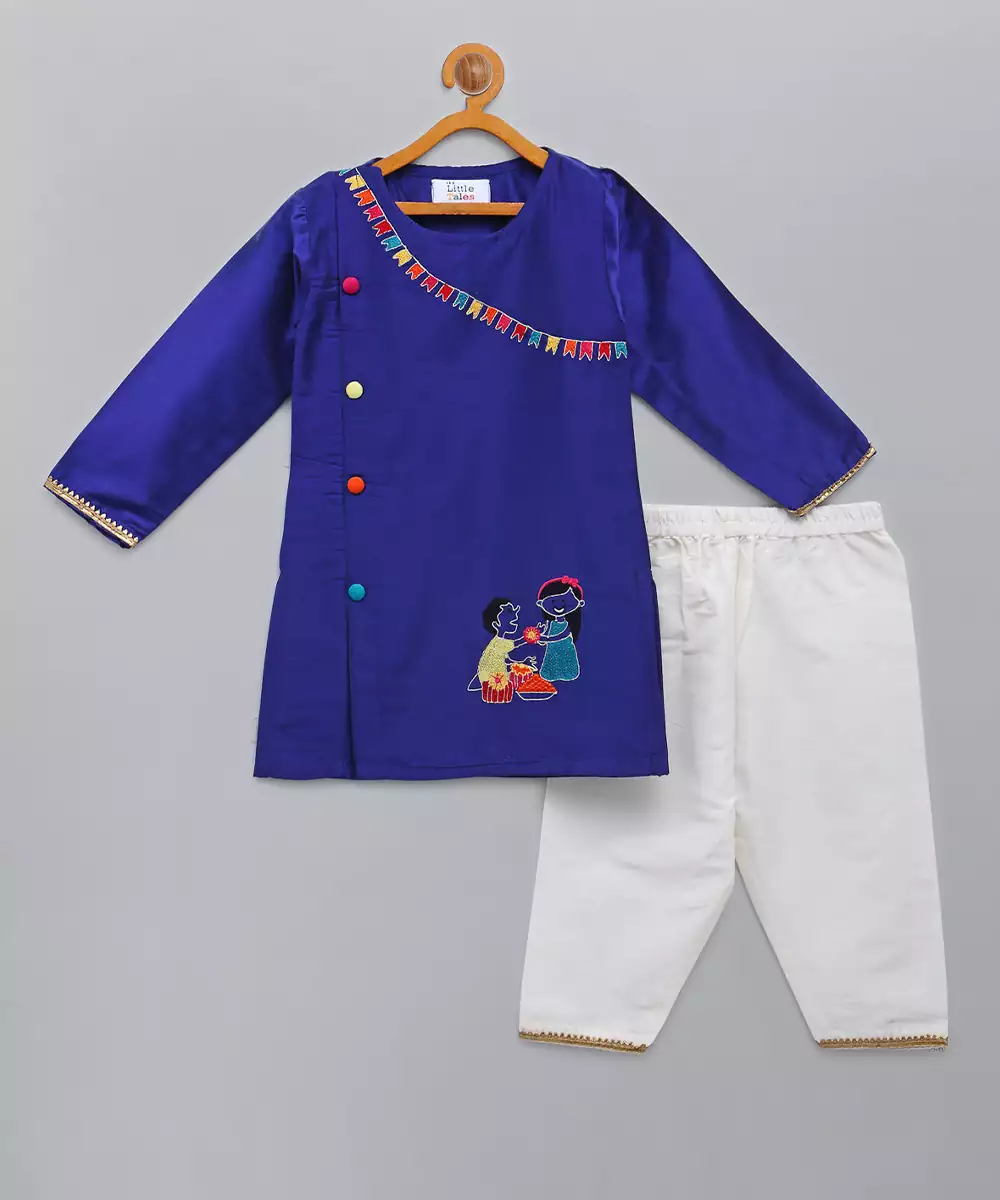 Blue Brother Sister Embroiered Kurta With Full Sleeves. Kurta With A Line Cut.Kurta With Colorful Button Finishings. Pyjama With Elasticated Waist.