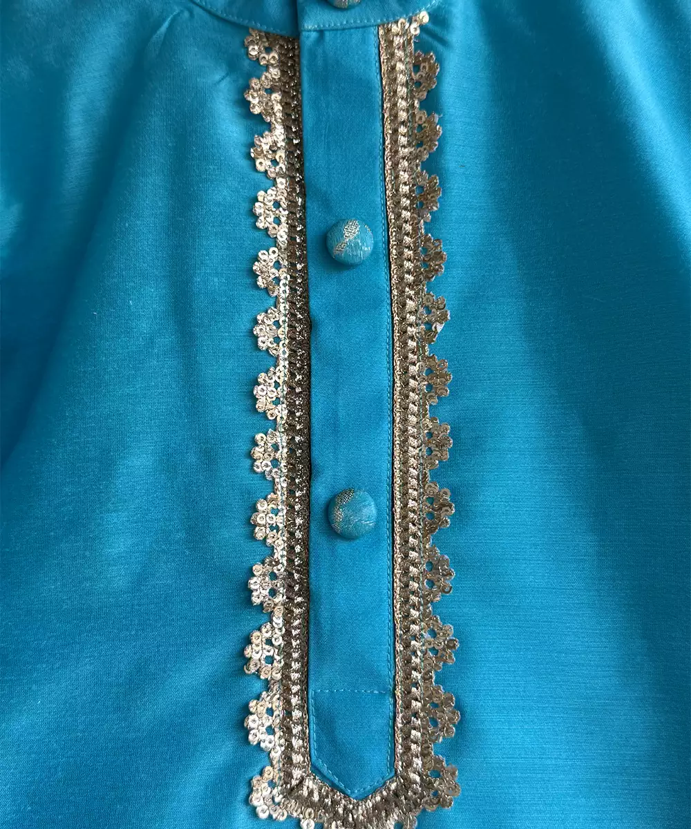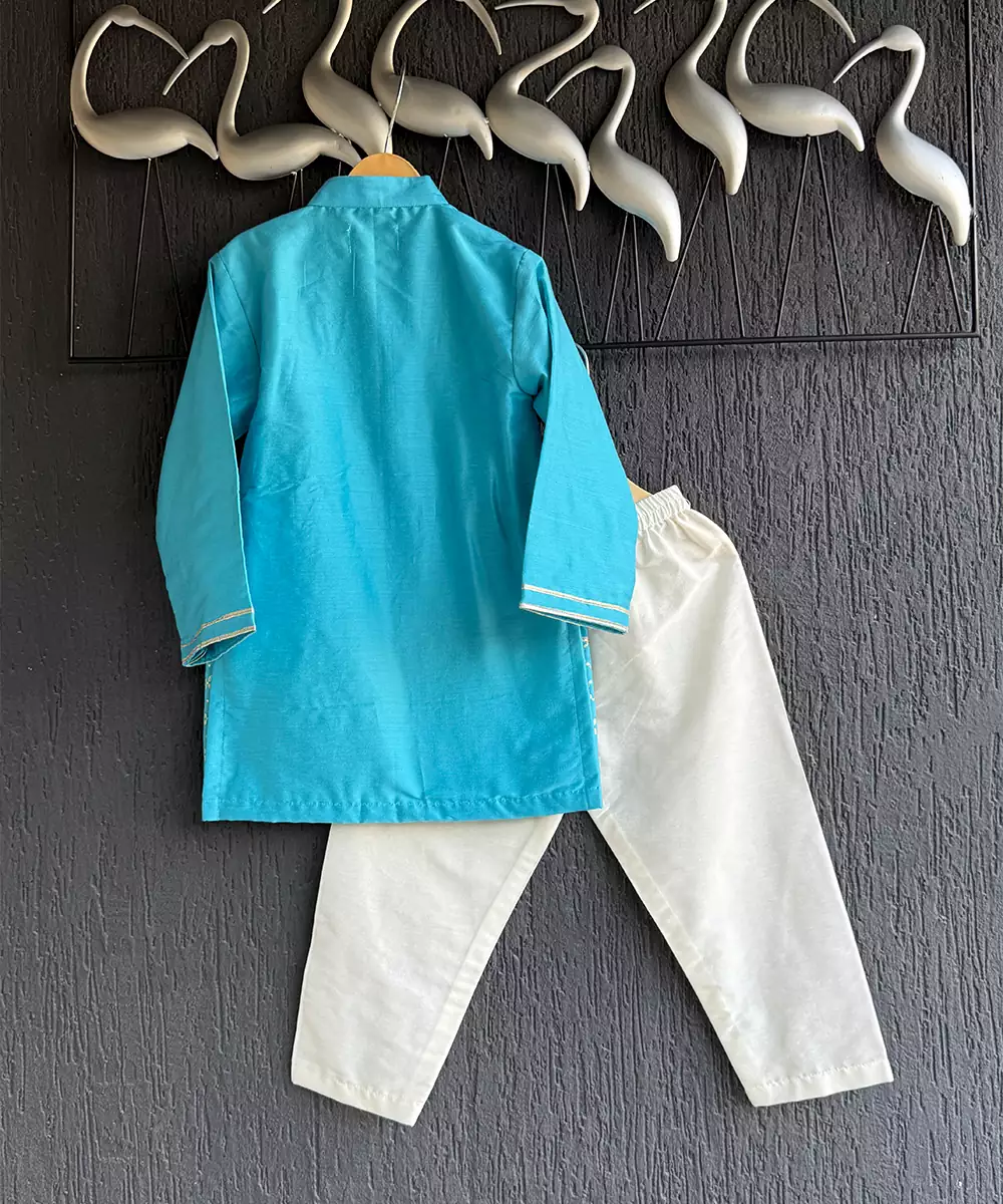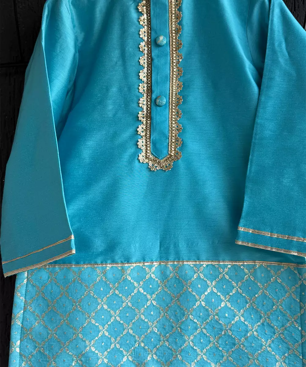 Blue Cotton Silk Kurta With Cotton Lining Beneath And Chanderi Panel At The Border. Kurta Comes With Lace Around The Placket. Bottom With Elasticated Waist.
