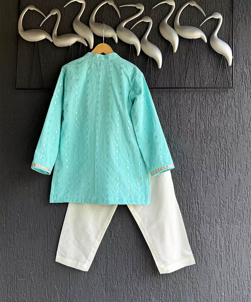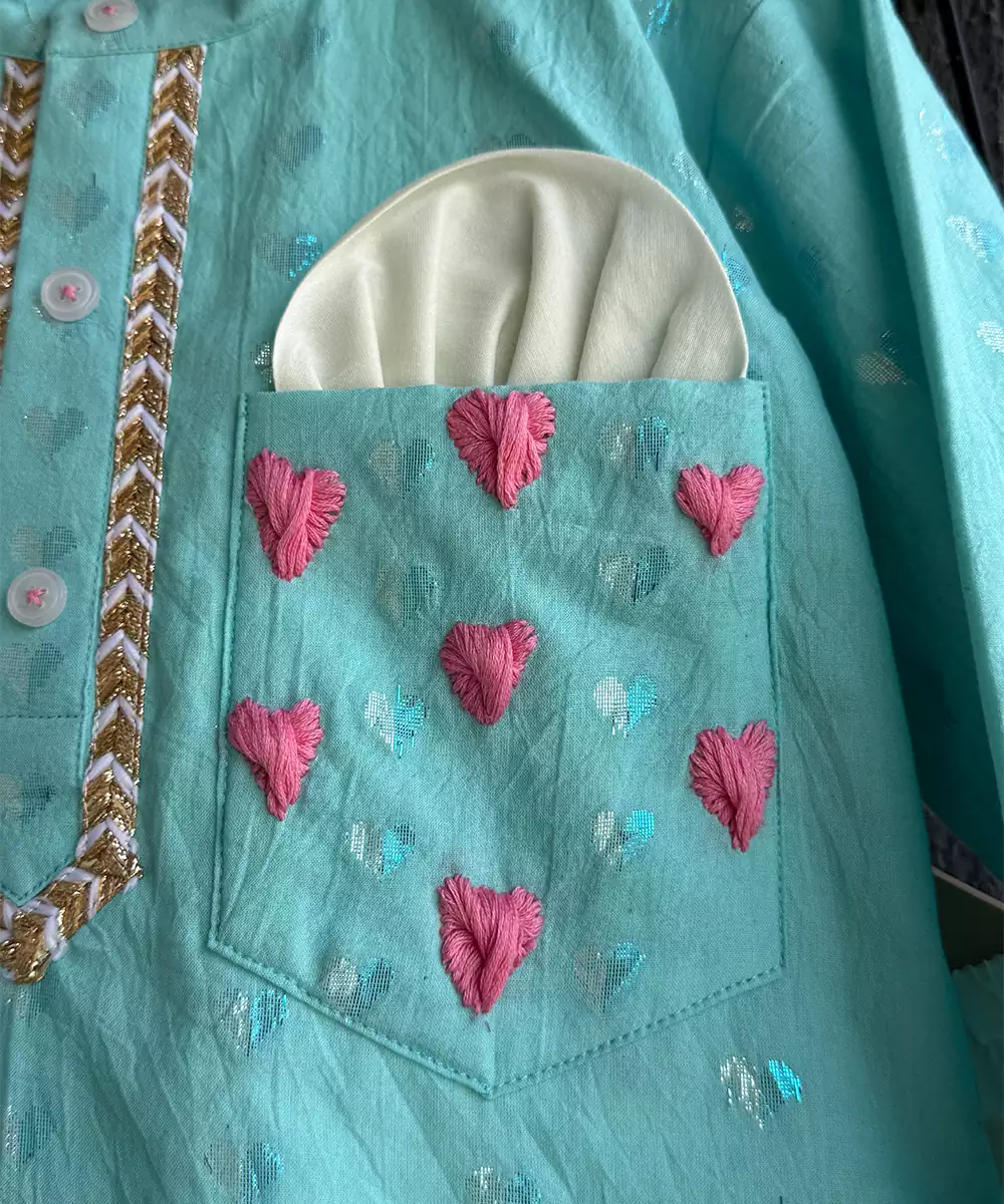 Sky Blue Cotton Lurex Front Opening Kurta With Contrast Buttons. Kurta With Heart Embroidered Anchor Thread Pocket Patch And Contrasting Pocket Square.Lace To Enhance The Look. Off White Elsaticated Waist.