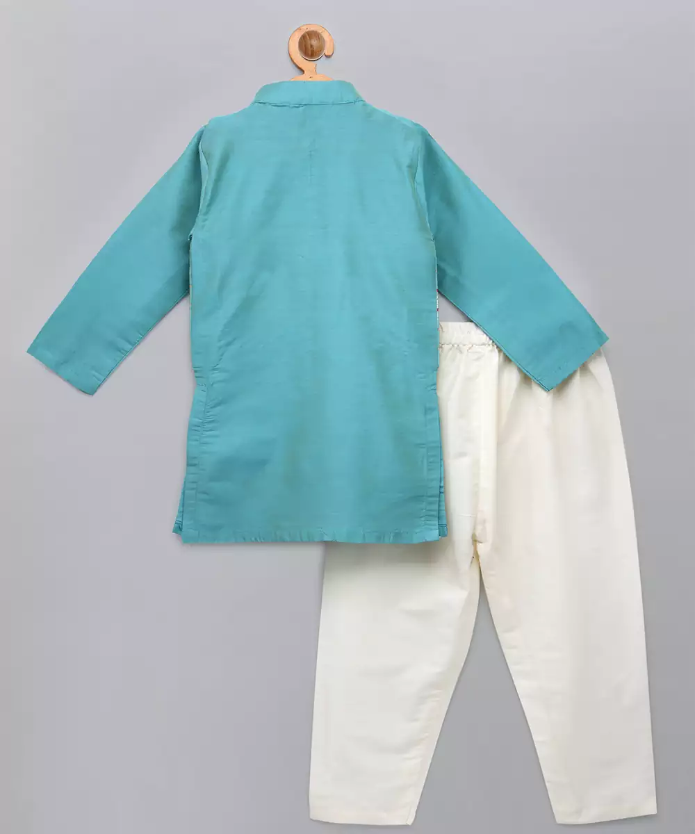 Blue Kurta With Zari Attached Jacket On Both Sides. Kurta With Front Opening .Offwhite Cotton Silk Pyjama . Bottom With Elasticated Waist