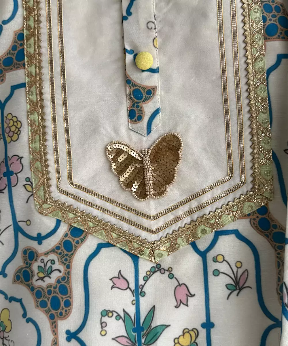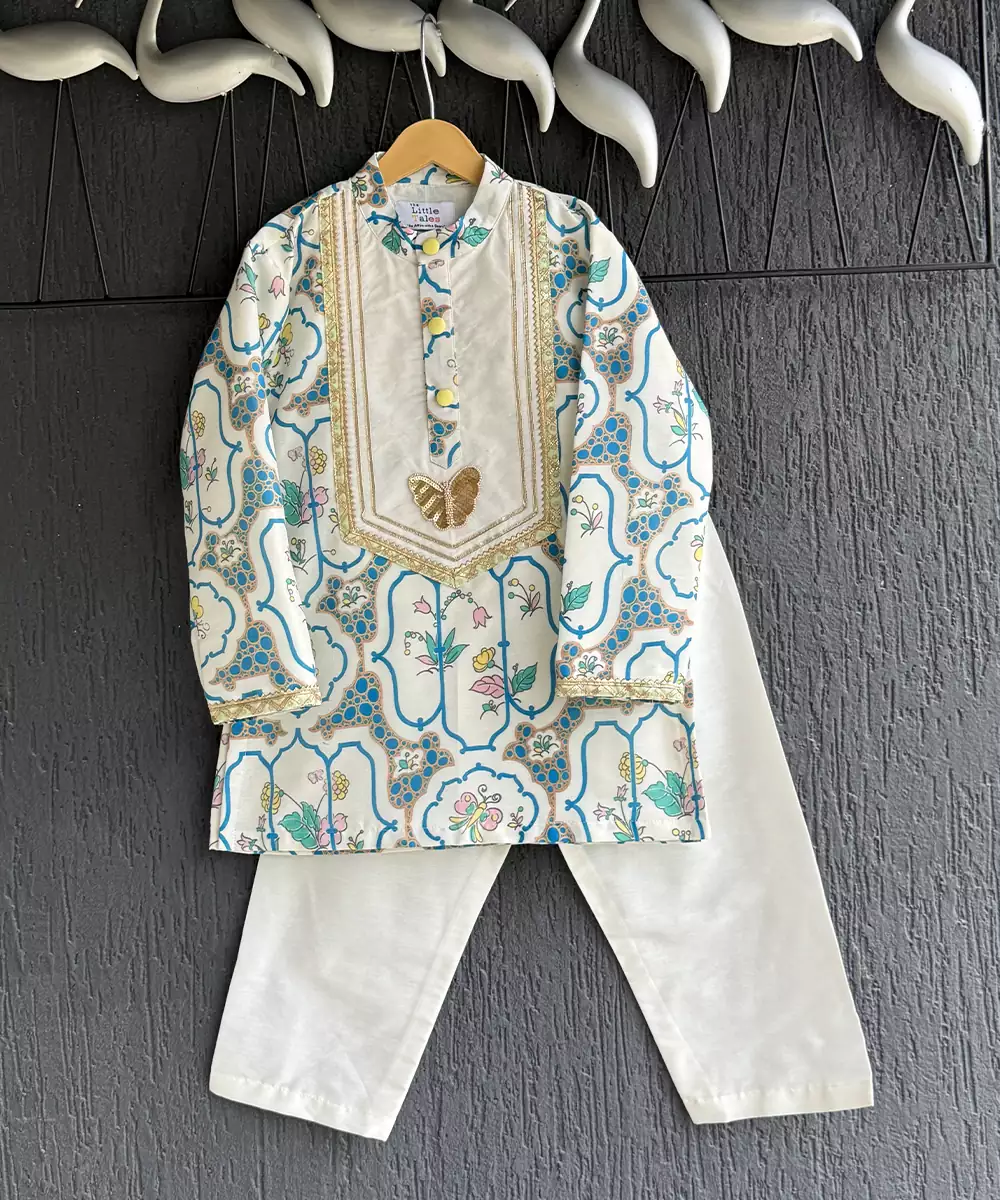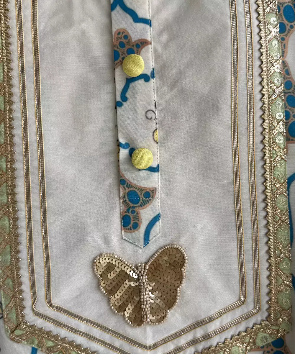 Butterfly Printed Kurta Set With A Gold Sequins Embroidery Butterfly Patch In The Centre Front. Laces Aroudn The Neckline . Bottom With Elasticated Waist