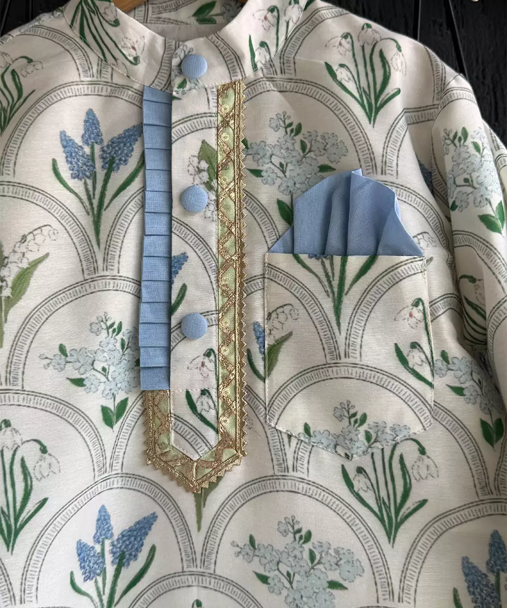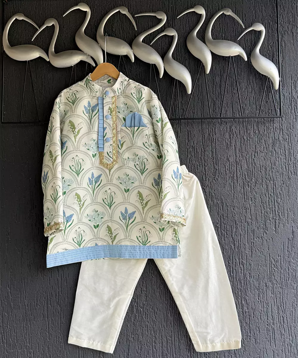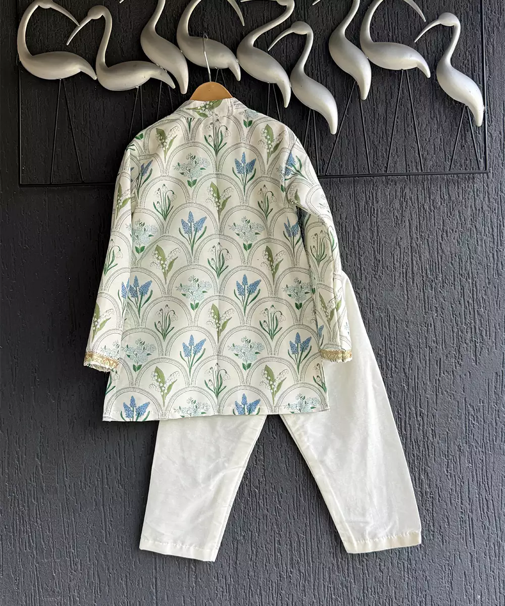 Off White Floral Digital Printed Kurta Set With Embroidery Patch On The Pocket. Bottom With Elasticated Waist