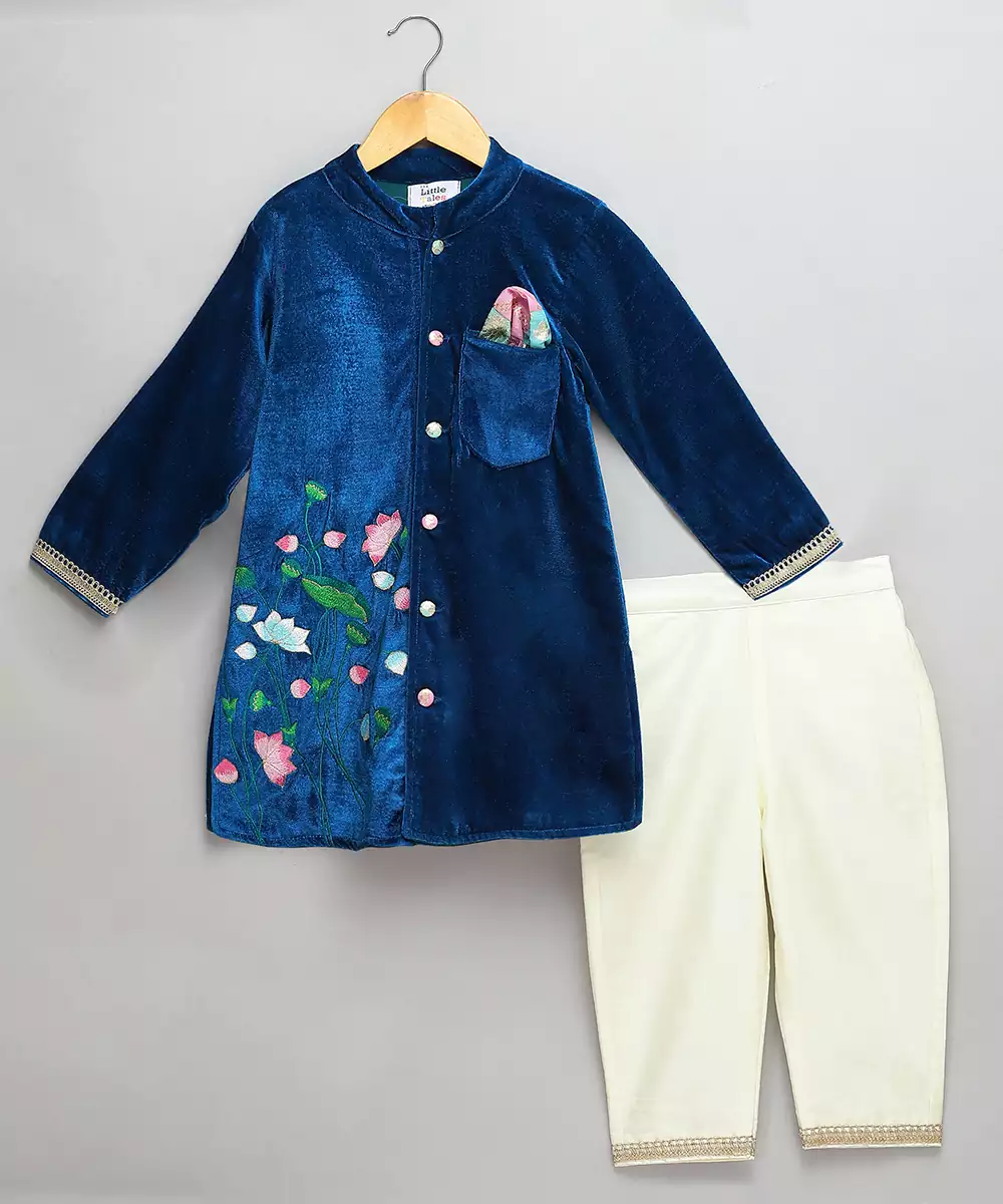 Blue Velvet Sherwani With Placemnet Resham Embroidery , Sherwani With Cotton Lining. Bandhgala With Front Opening .Bandhgala With Fabric Buttons.Offwhite Raw Silk Trousers With Lace Finishings . Bottom With Elasticated Waist