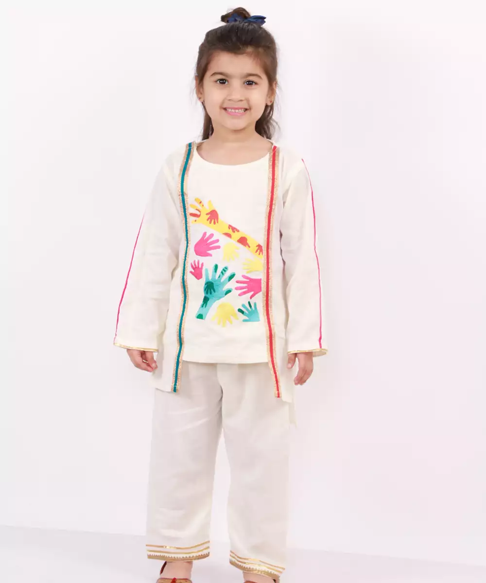 Colorful Holi Hands Embroidered Kurta With Lace Finishings. Kurta With Titch Button Opening On The Shoulders. Pyjama With Lace Finishings And Elasticated Waist.