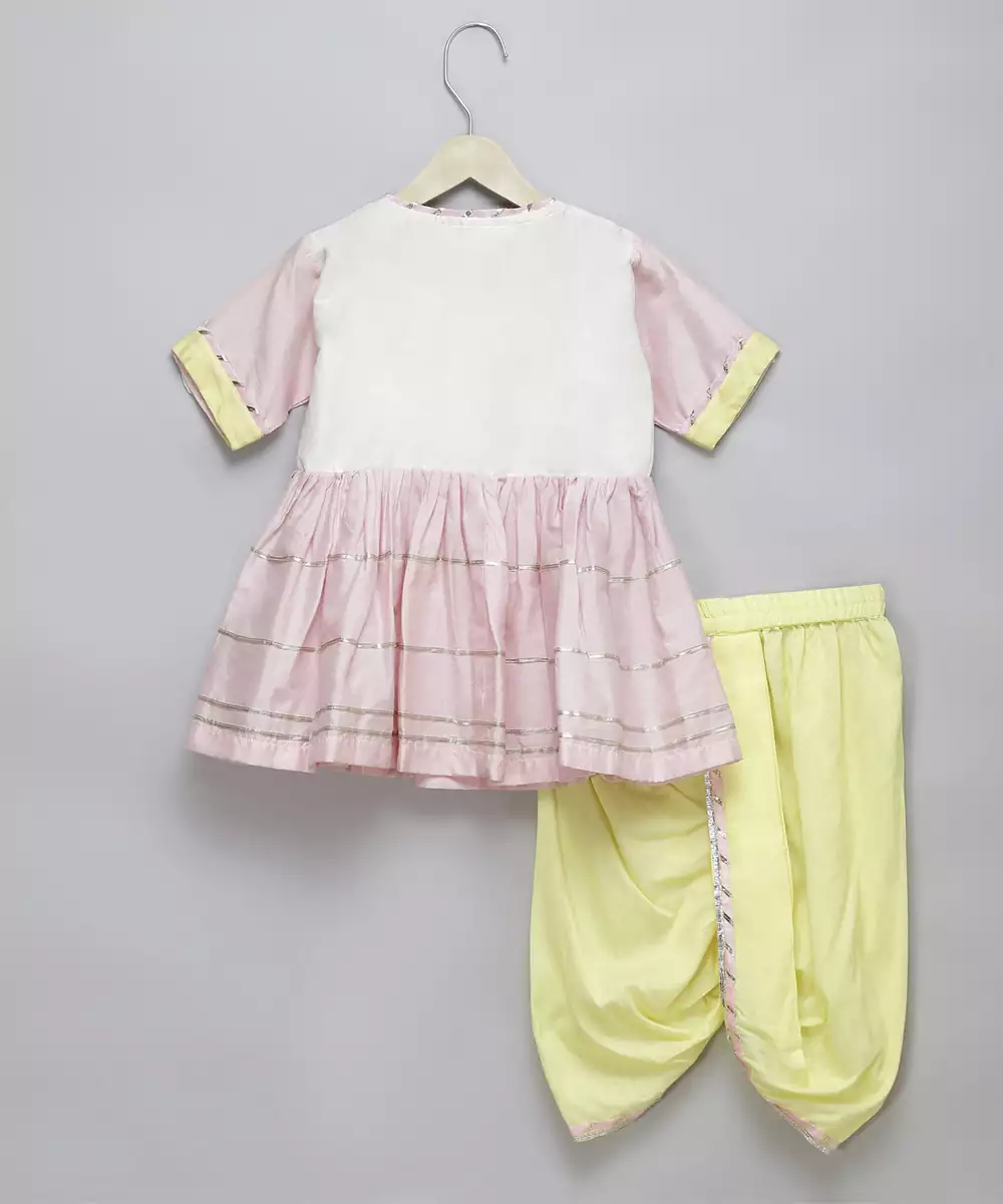 Offwhite Angrakha Kurta With Ganpati Embroidered Panel And Peplum Look Frock Style Kurta. Yelloe Dhotis With Lace Embellishment. Bottom With Elastic. Colour: Pink Fabric: Cotton Silk Components : 1 Kurta / 1 Dhoti
