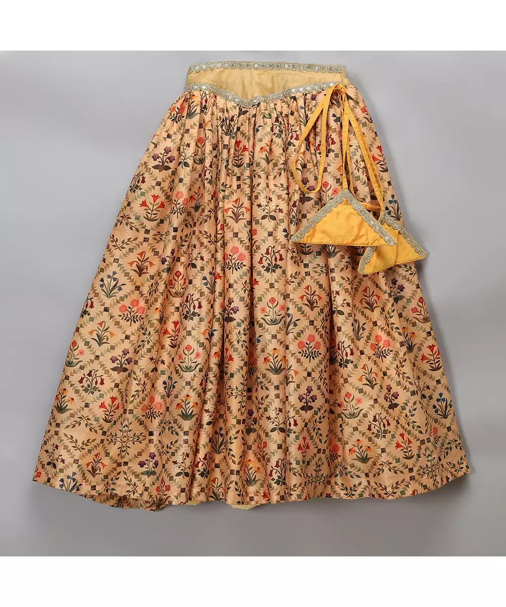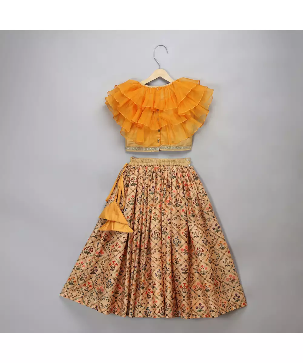 Orange Frill Blouse With Beige Base And Lace Embellishments. Top With Back Opening. Blouse With Cotton Lining Printed Lehnga With Embroidered Lace At The Belt. Lehnga With Adjustable Drawstrings For The Waist To Adjust. Lehnga Comes With Beautiful Tassels