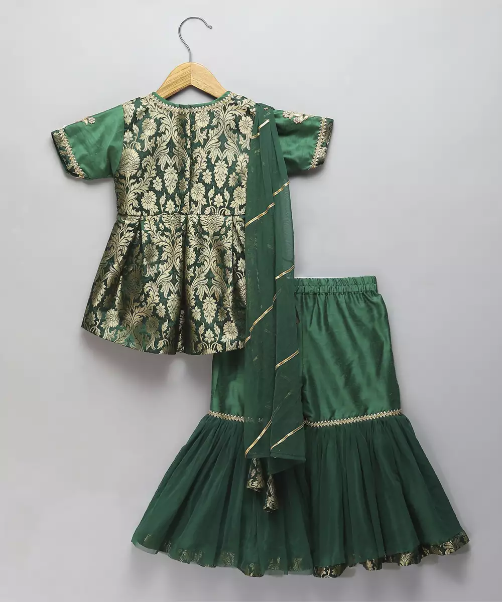 Green Brocade Peplum Top With Back Opening. Attached Net Gota Finishing Dupatta. Green Cotton Silk Sharara With Net Frills And Drawstring On The Sides Of It. Cotton Lining Beneath.