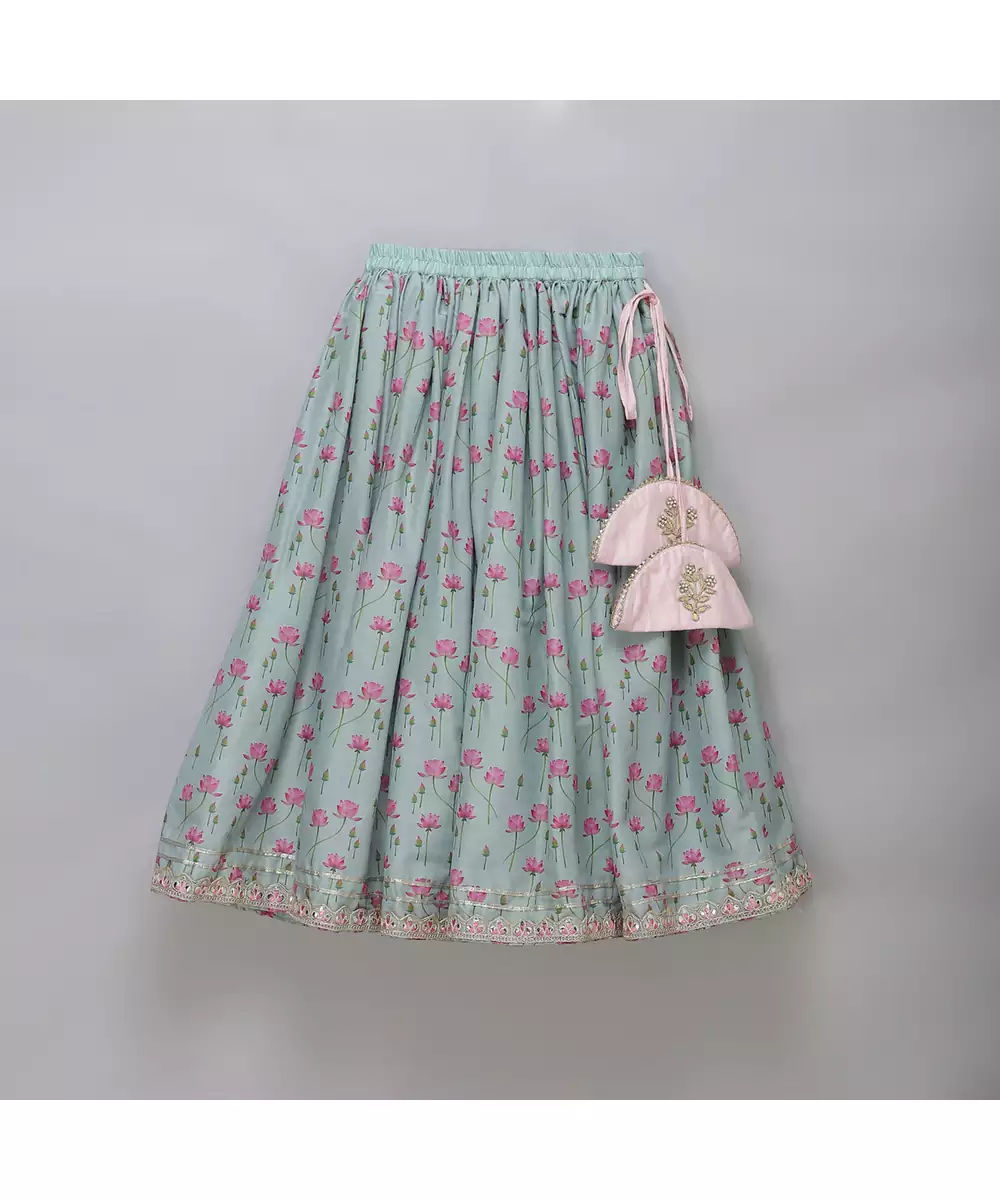 Green Lotus Printed Blouse With Attached Net Dupatta And Lace Embellishments. Lehnga With Elastic And Printed Ghera And Beautiful Embroidered Tassels.