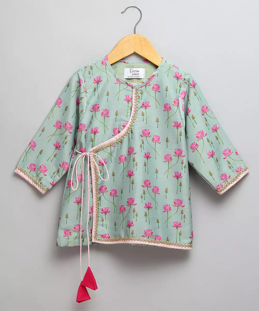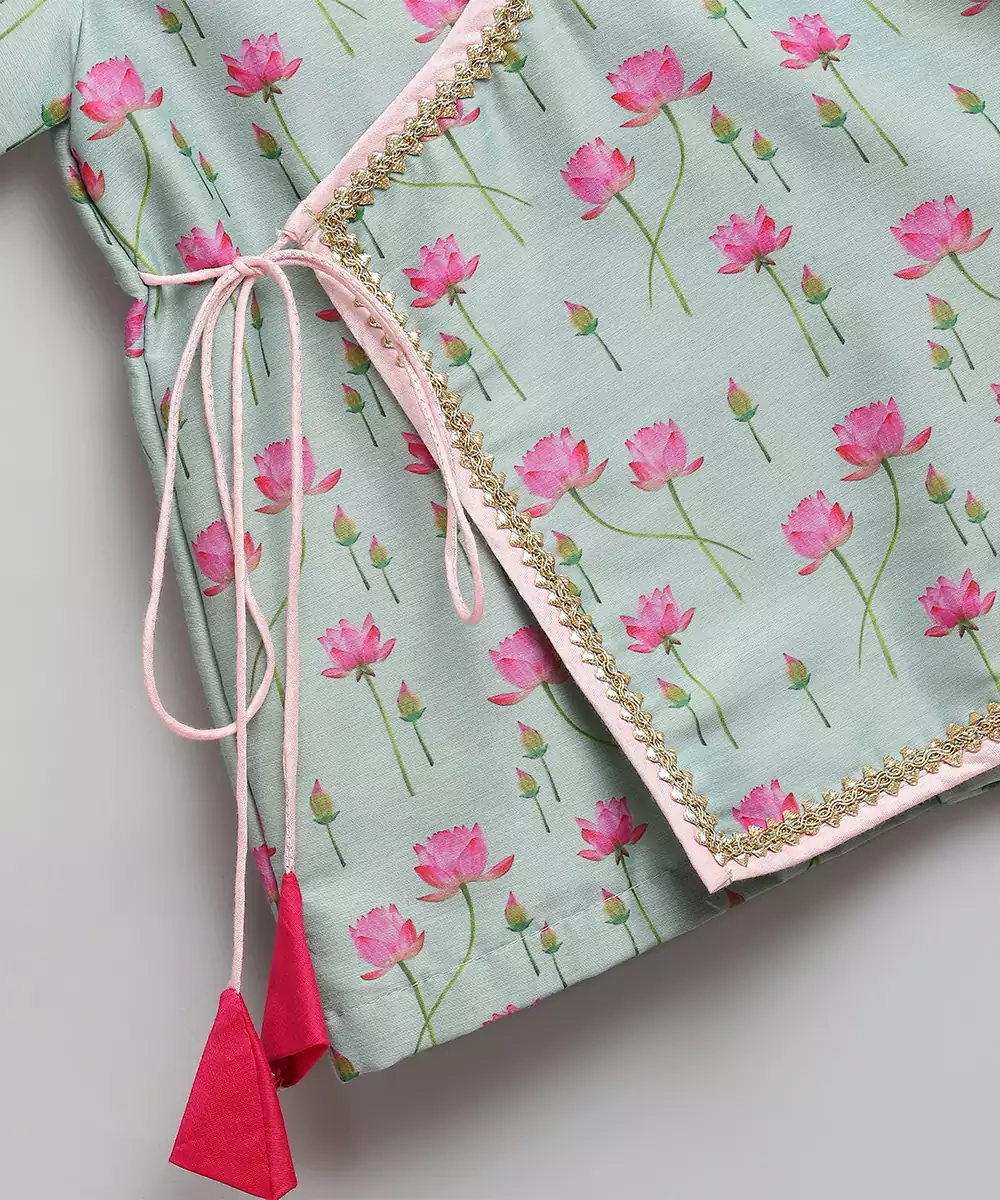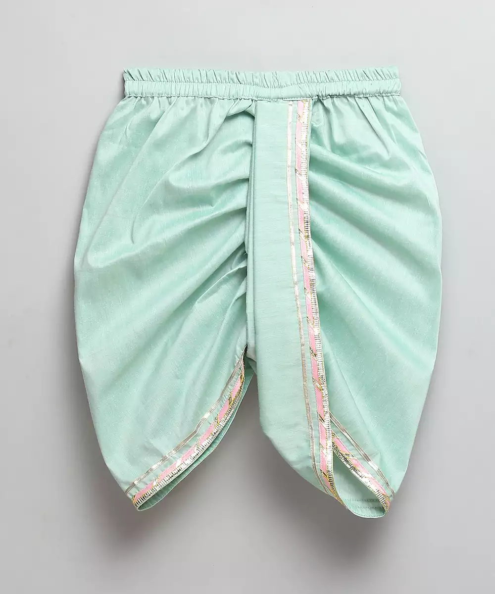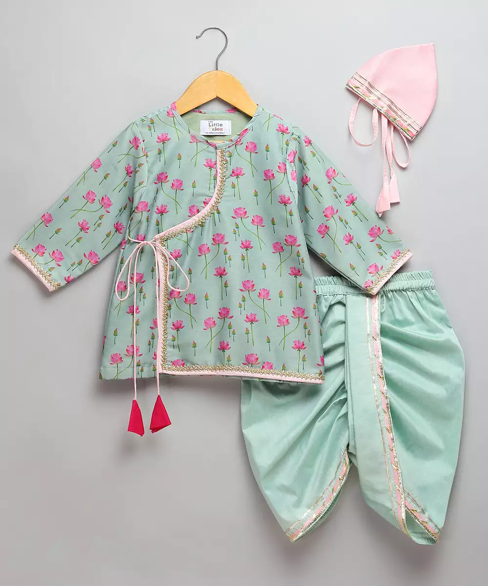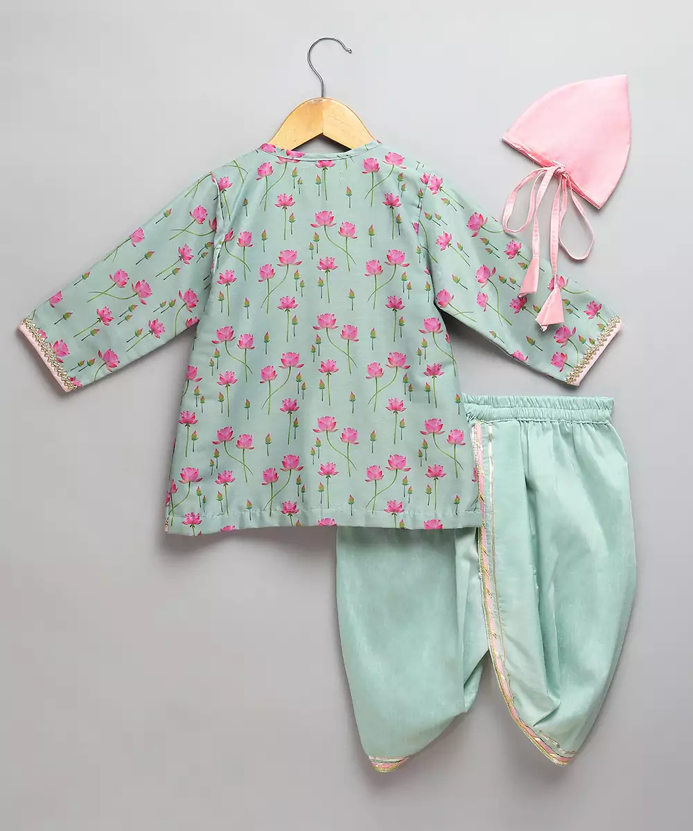 Mint Green Digital Printed Angrakha Kurta With Cotton Lining . Contrast Tassels . Mint Green Silk Dhotis With Lace Finishings . Mukut To Add On The Religious Look
