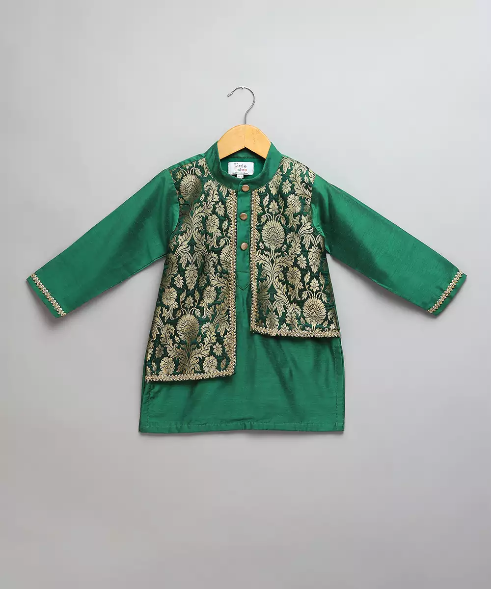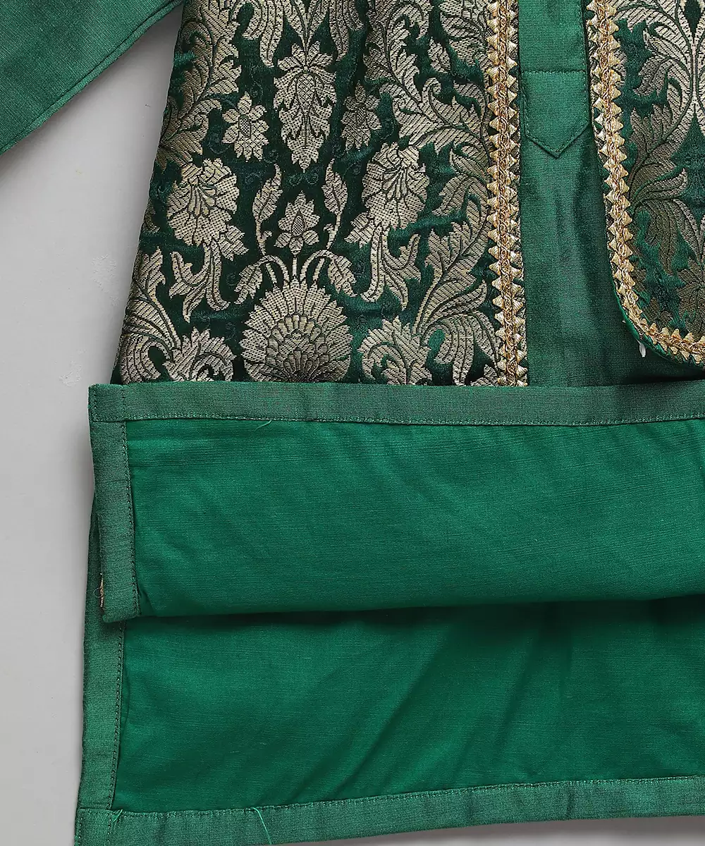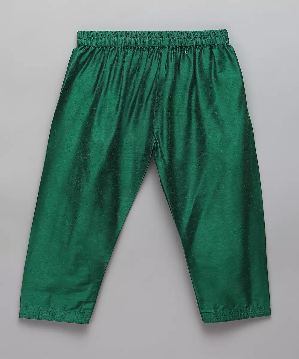 Green Cotton Silk Kurta With Front Button Opening. Attached Brocade Panels Assymetrically On The Kurta .Lace Finshings . Pajama With Elastic
