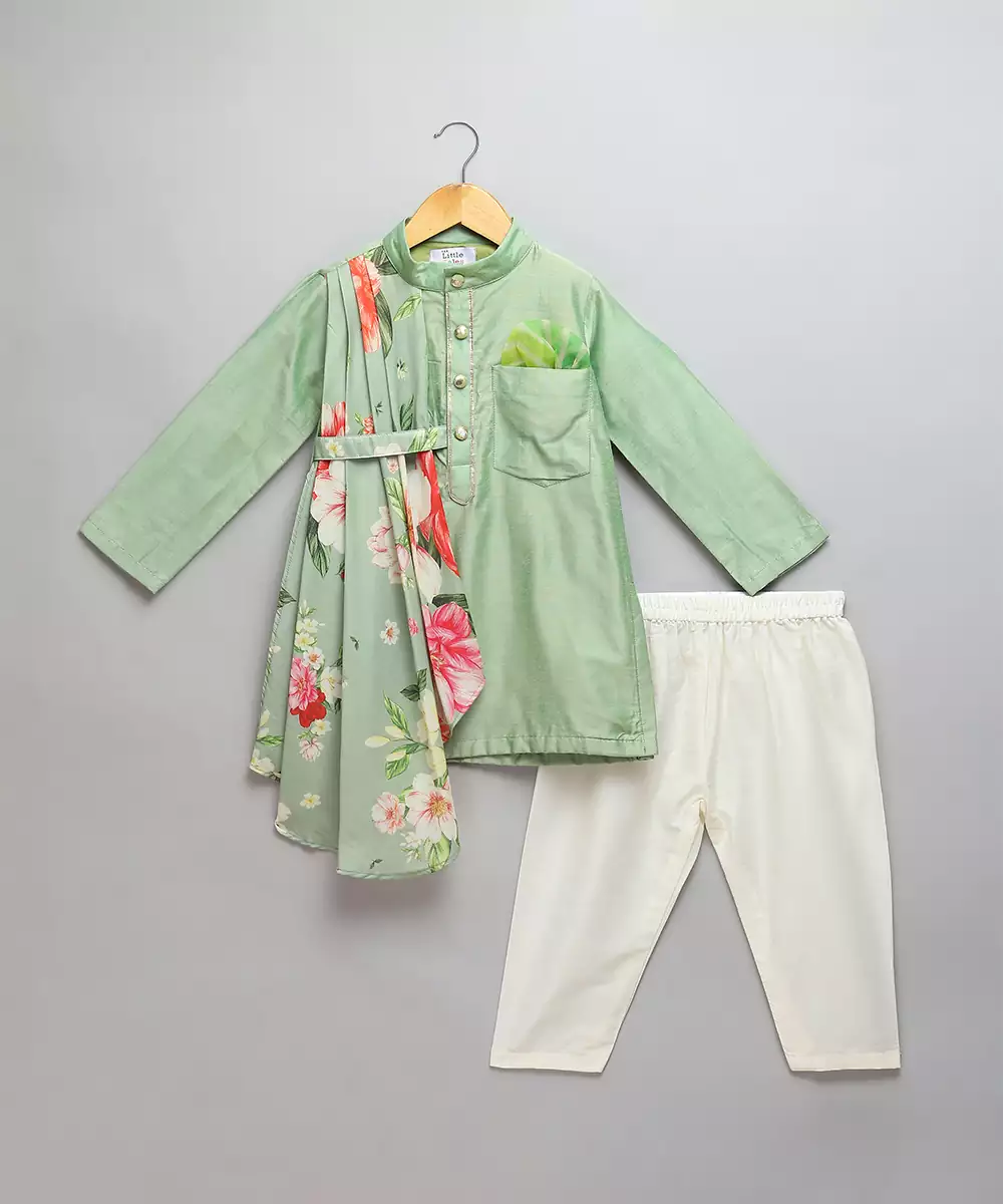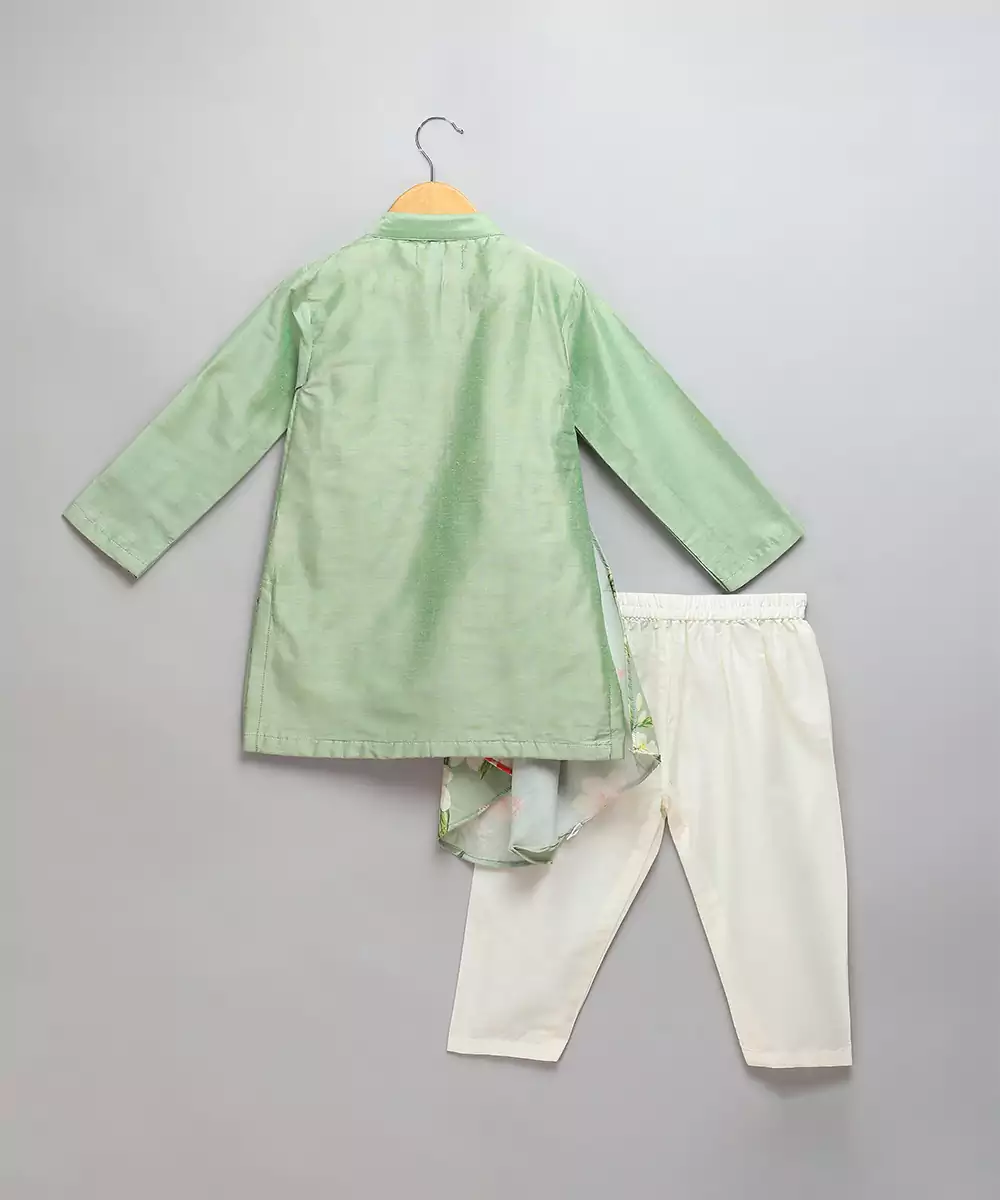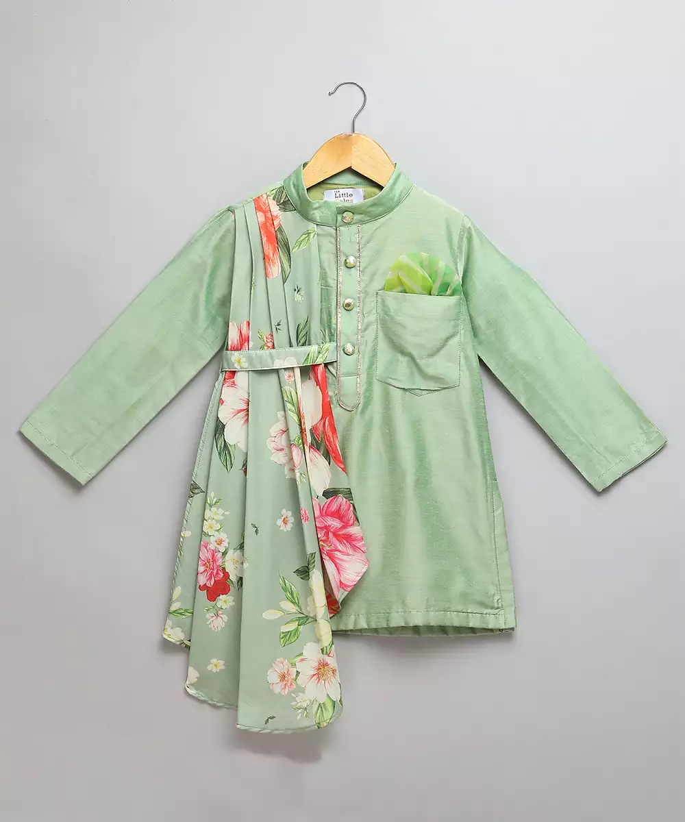 Green Cotton Silk Kurta With Front Opening. Attached Printed Pleat Panel Stitched Assymetrically. Pajama With Elastic Colour: Green Fabric:Cotton Silk Components: 1 Kurta / 1 Pyjama