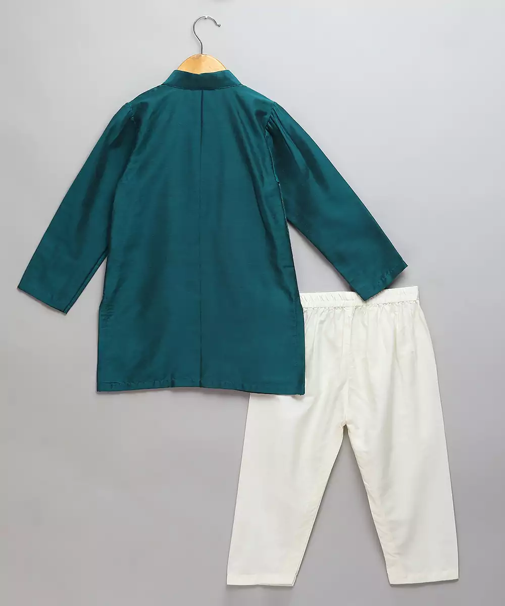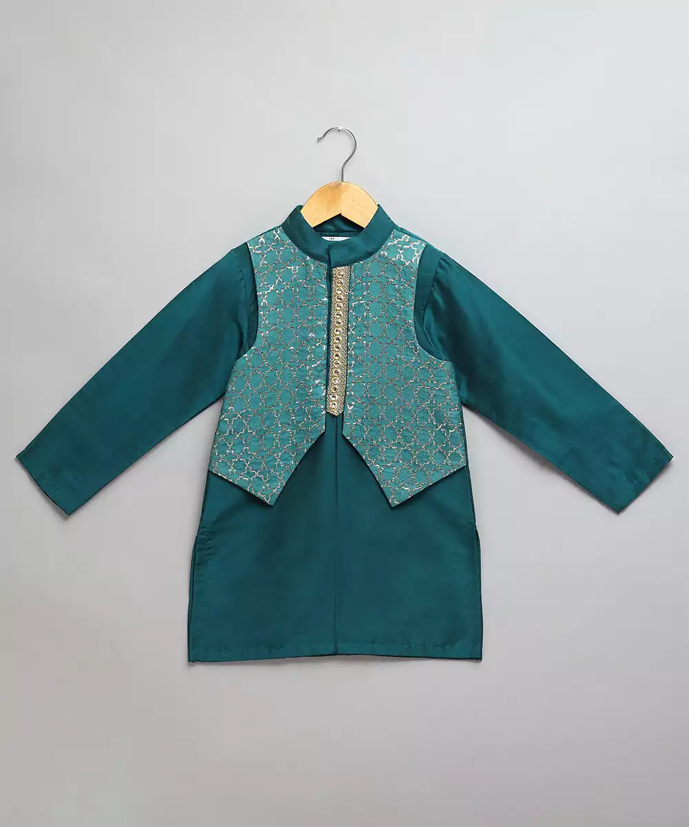 Bottle Green. Kurta With Zari Attached Jacket On Both Sides. Kurta With Front Opening .Offwhite Cotton Silk Pyjama . Bottom With Elasticated Waist