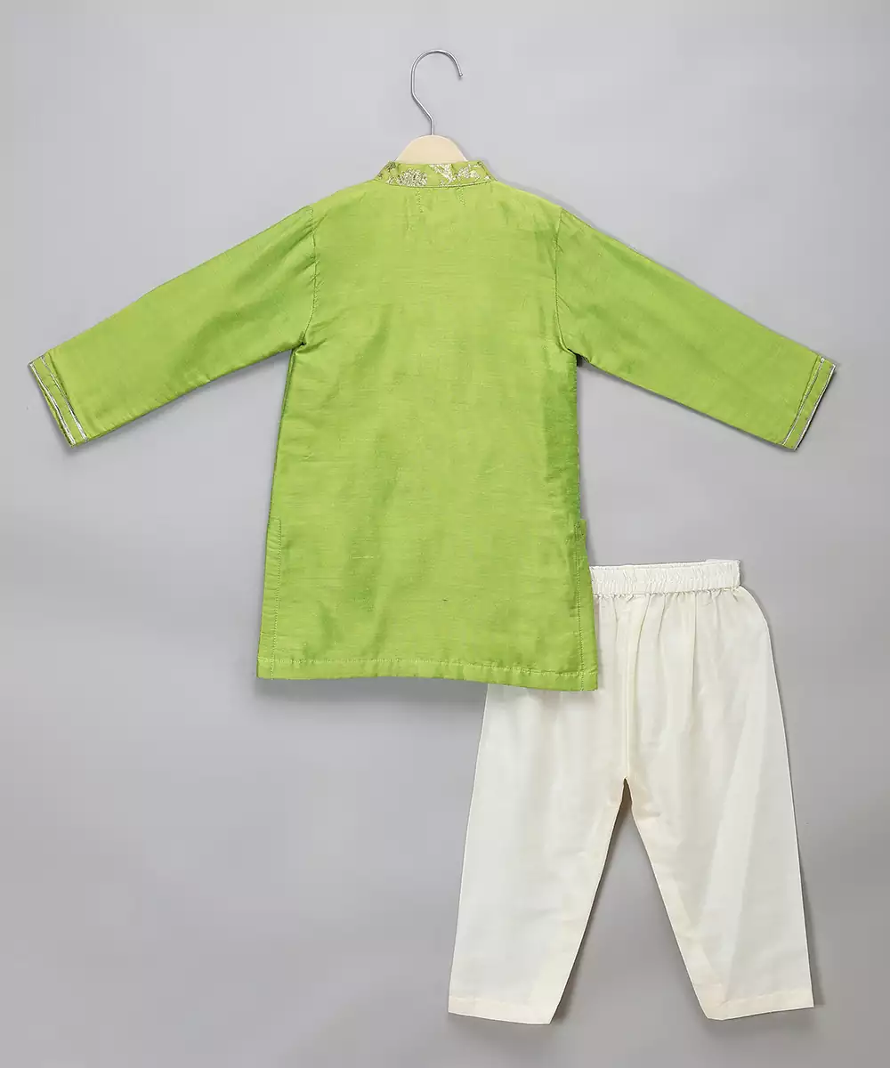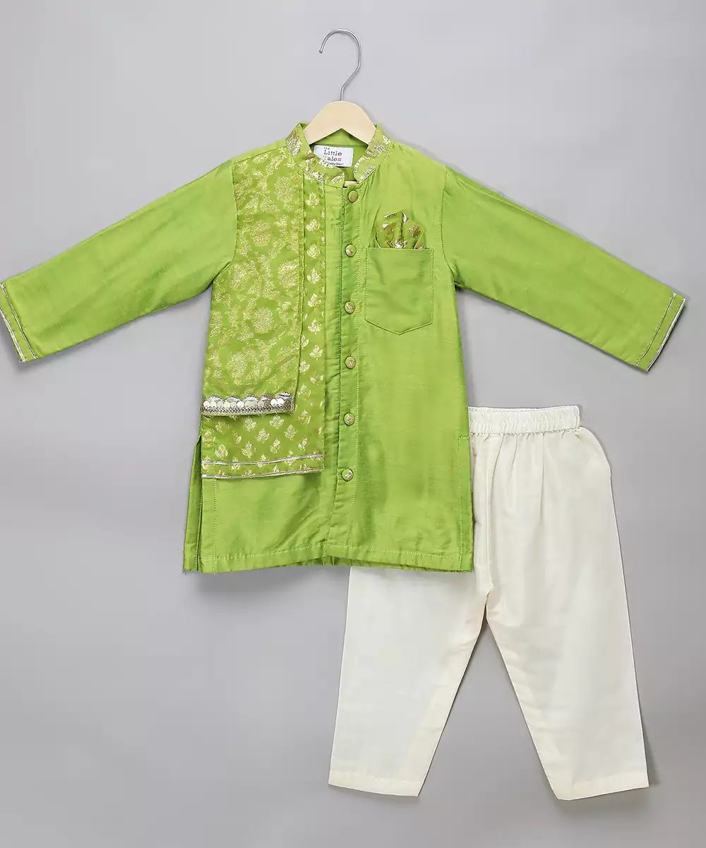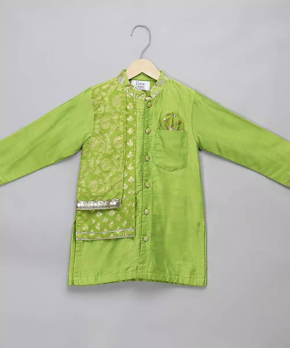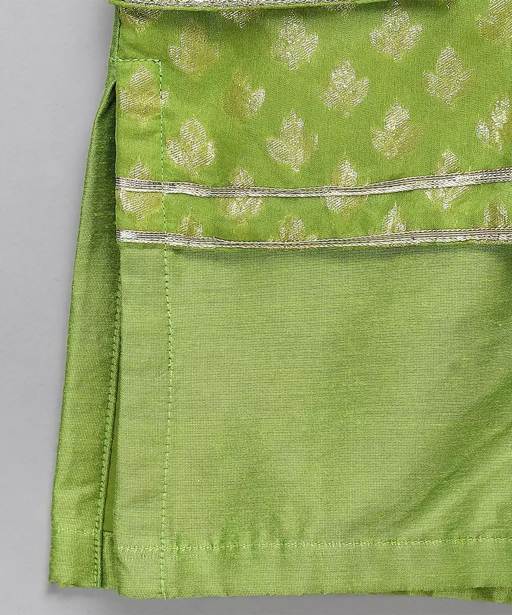 Green Silk Kurta With Front Open And Chanderi Panels On One Side In A High Low Concept.Lac Embellishments. Bottom With Elastic.