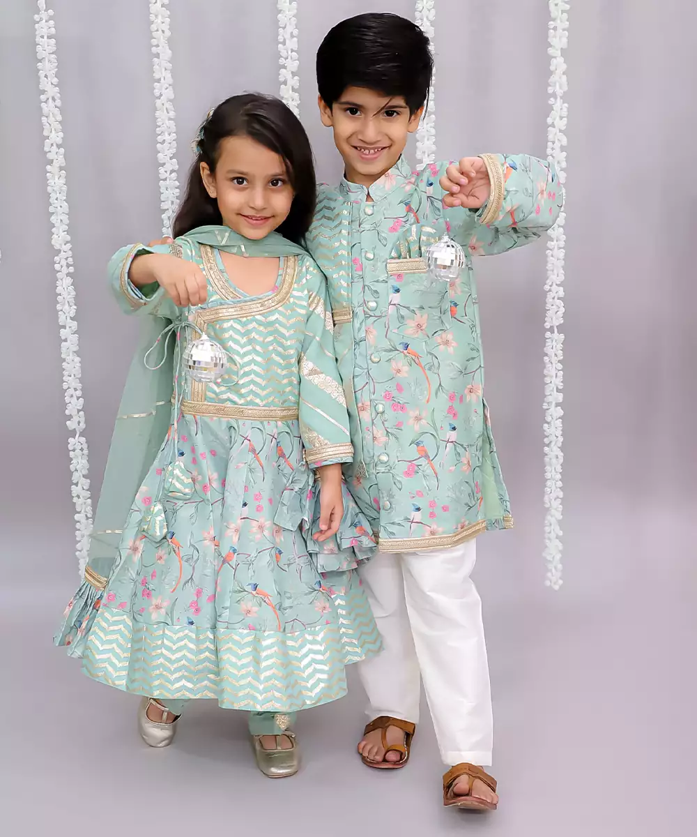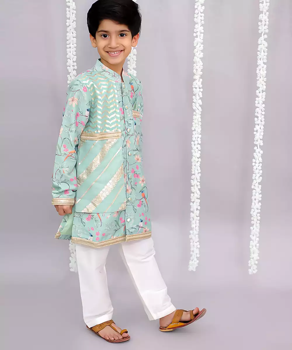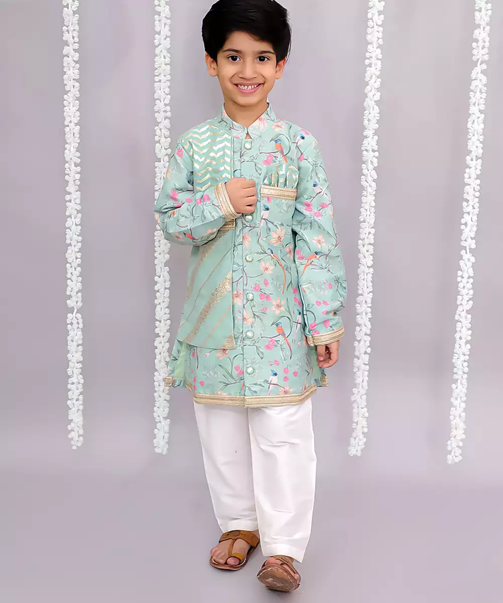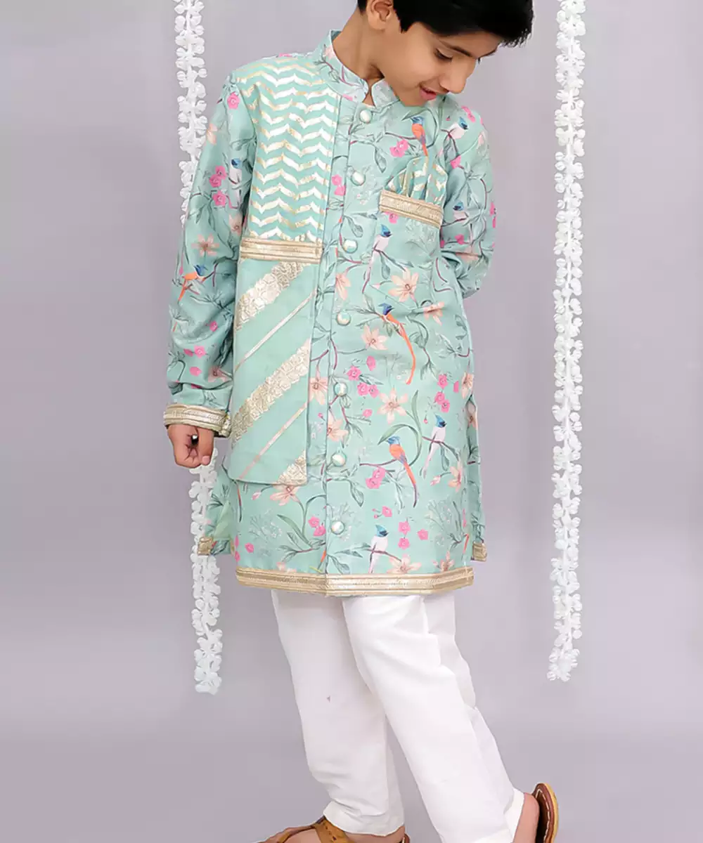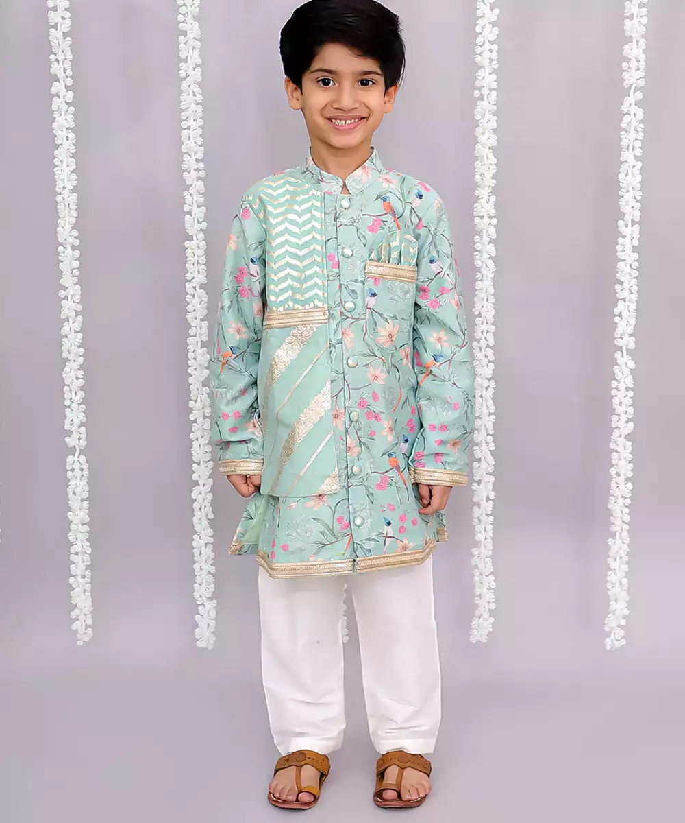 Green Digital Printed Kurta Set With Chnaderi Panels On The Sides. Front Open Kurta H Cotton Lining Inside. Bottom With Elasticated Waist .