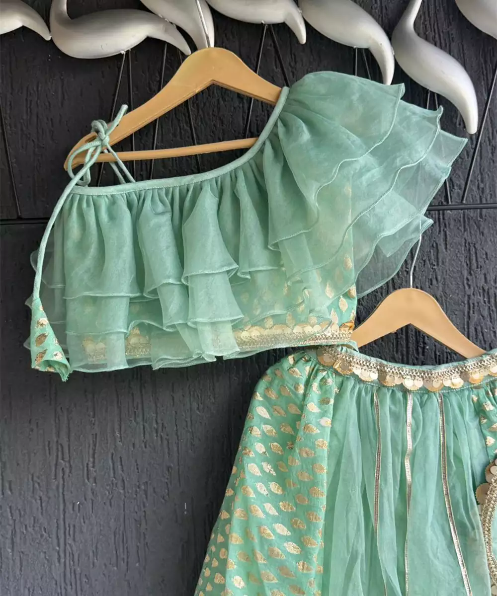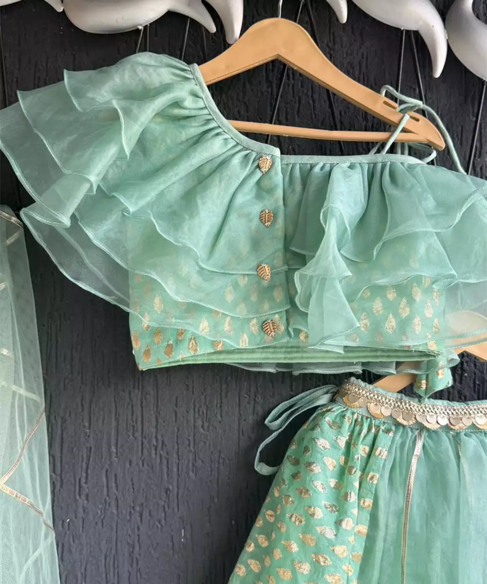 Pastel Green Off Shoulder Blouse With Frills And Lace Embellishments.And With Attached Duppata . Top With Back Opening . Blouse With Cotton Lining .Green Chanderi And Organza Panels At The Bottom With Embroidered Lace At The Belt . Lehnga With Adjustable Drawstrings For The Waist To Adjust . Lehnga Comes With Beautiful Tassels Written "Maasi Ki Shaadi " " Chachu Ki Shaadi" Mamu Ki Shaadi "Tassels On The Lehnga To Give A Customised Look.For Any Cusotmisations Contact Us On 9389741726.