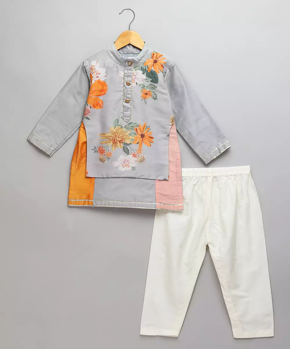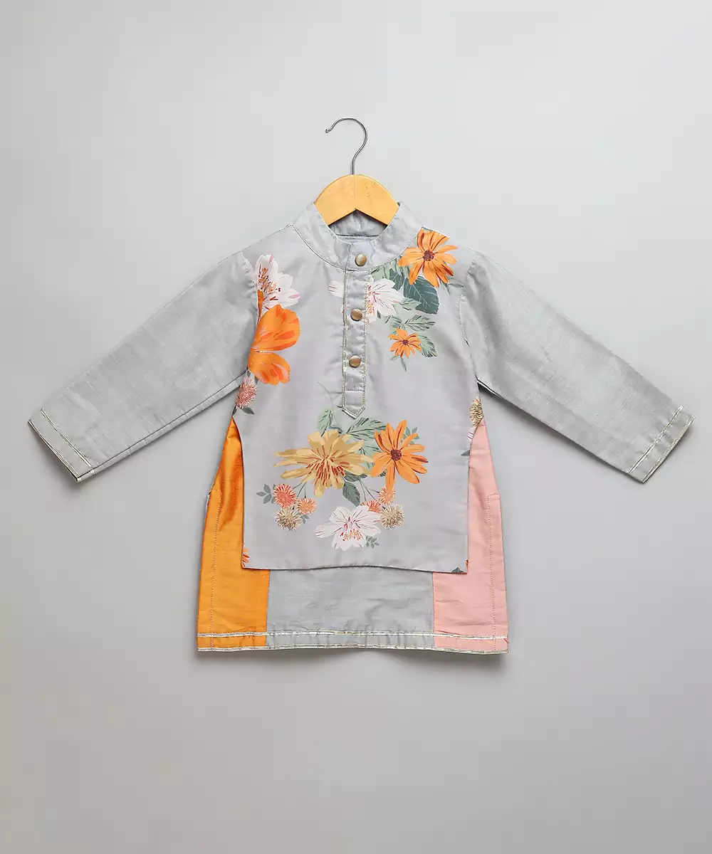 Multicolor Cotton Silk Kurta With Printed Attached Panel On Top . Front Placket Opening . Pajama With Elastic. Colour: Grey Fabric:Cotton Silk Components: 1 Kurta / 1 Pyjama