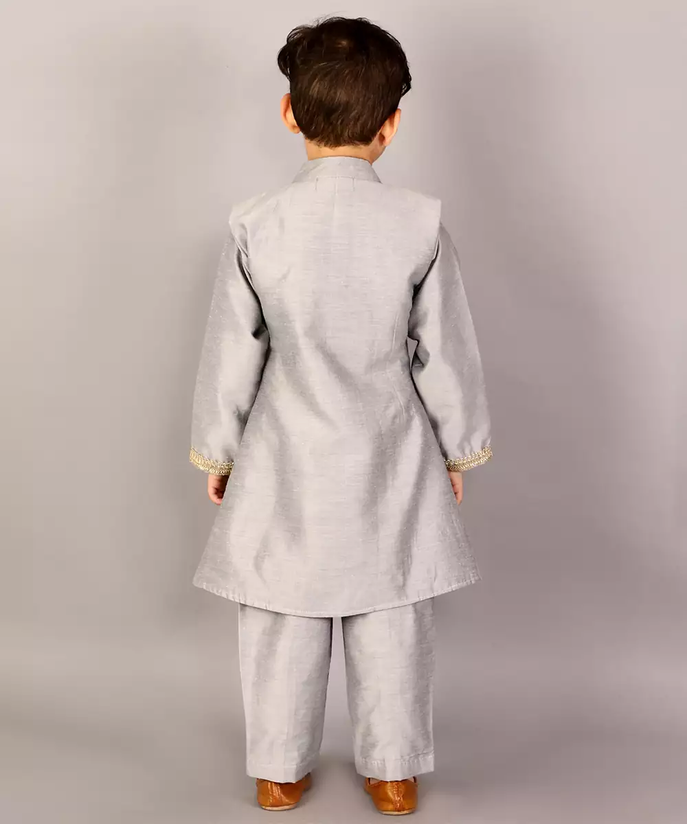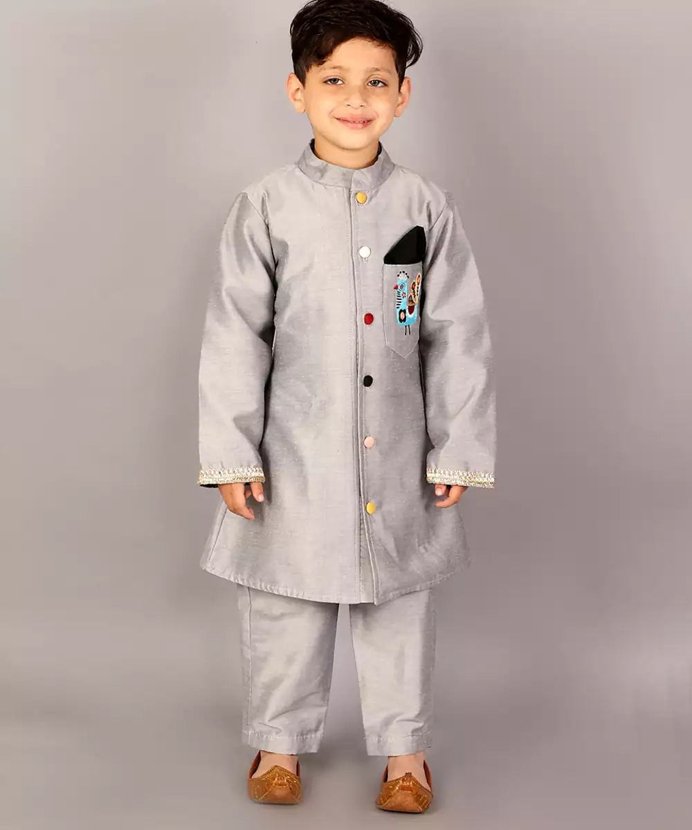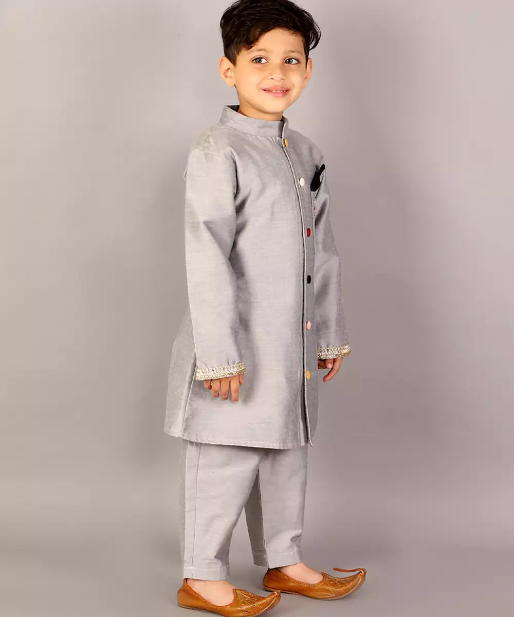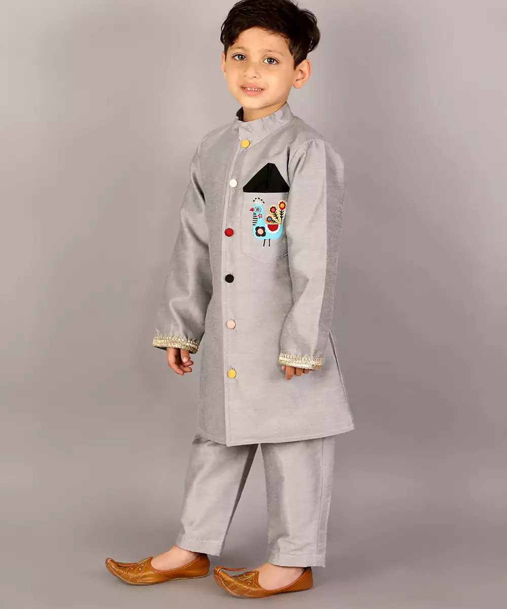 Pink Velvet Bandhgala Set . Embroidery On The Pocket . Off White Silk Trousers Colour: Grey Fabric:Cotton Silk Components: 1 Sherwani / 1 Trouser