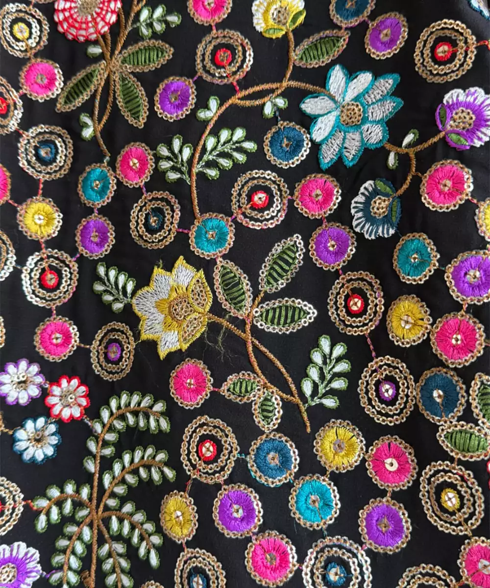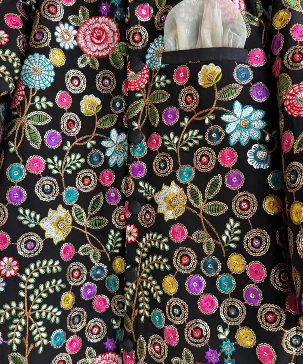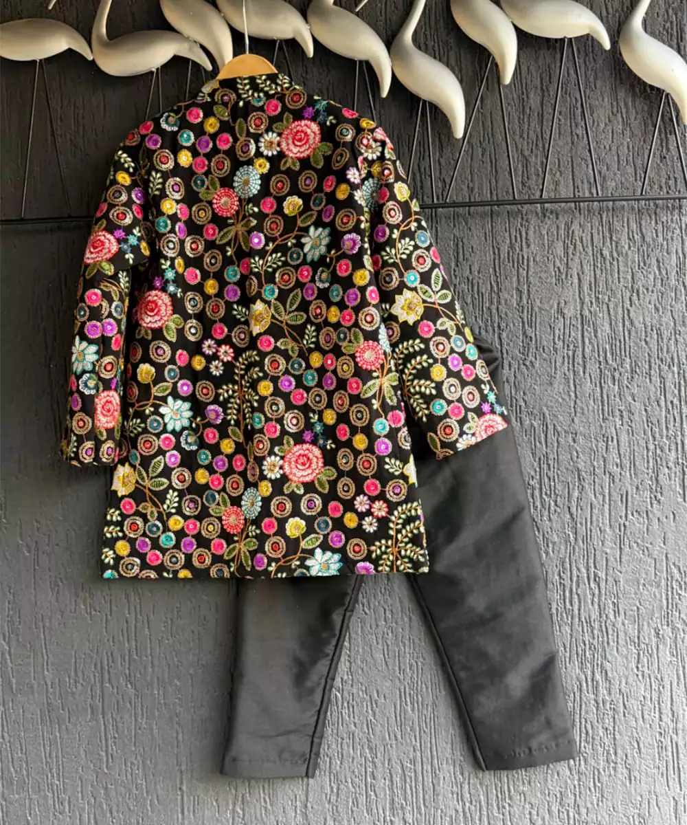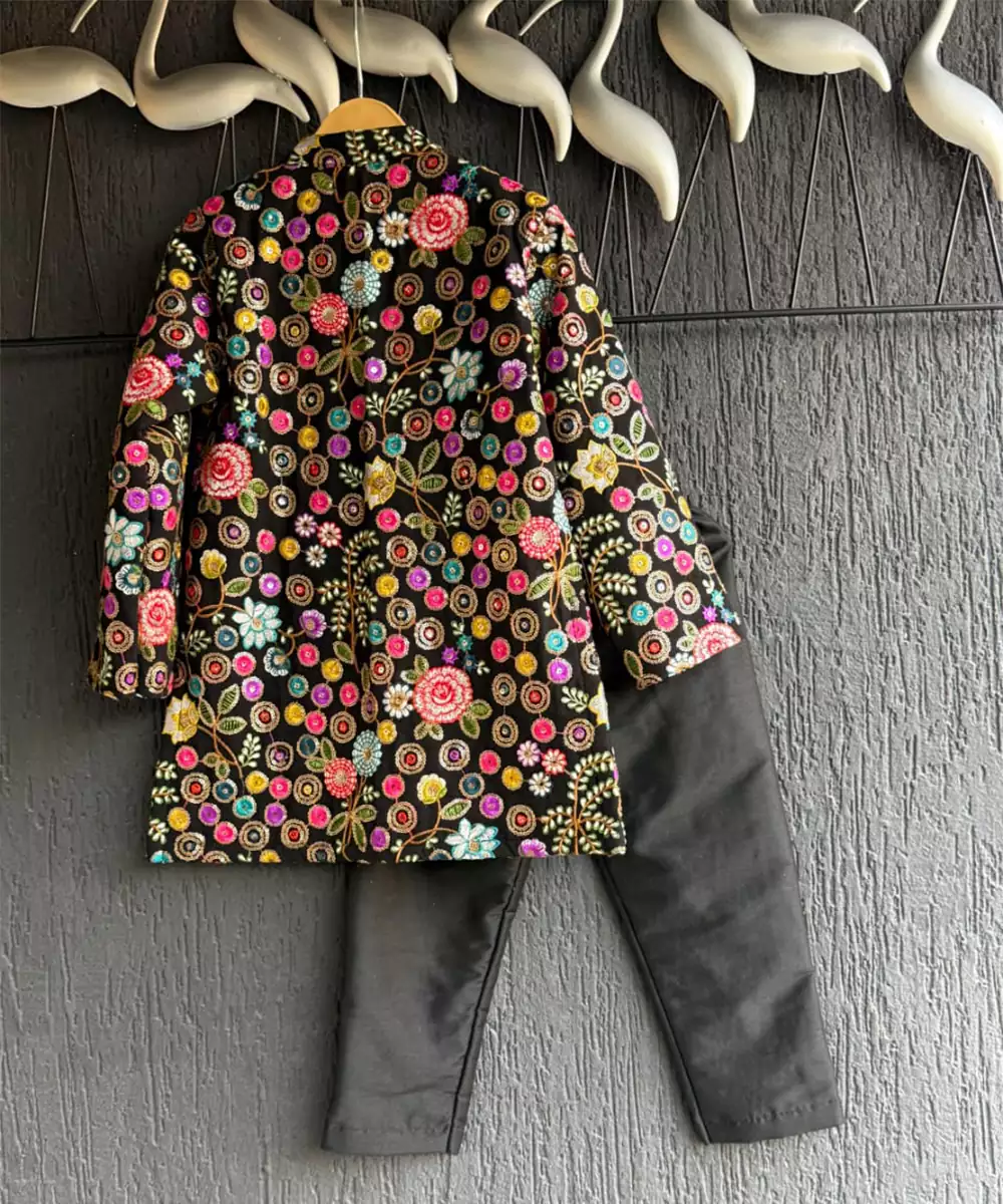 Black Embroidery Bandhgala With Contrast Dori Pipings And Organza Pocket Square . Top With Front Opening And Fabric Buttons. Top With Pure Cotton Lining. Bottom With Half Band In The Front Elasticated Waist.At The Back.
