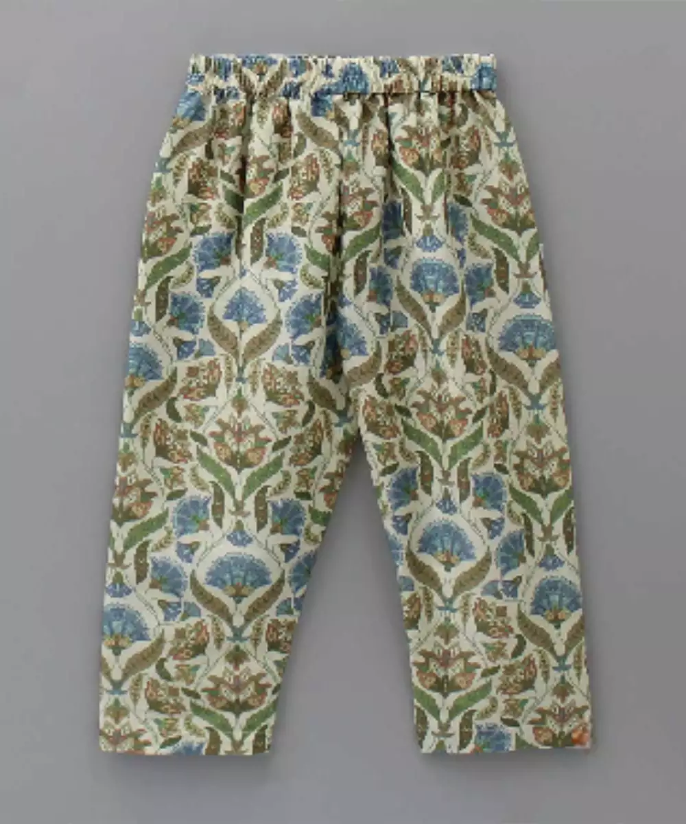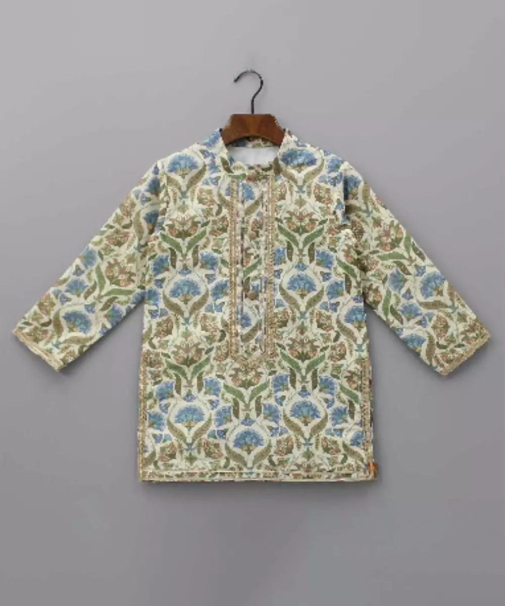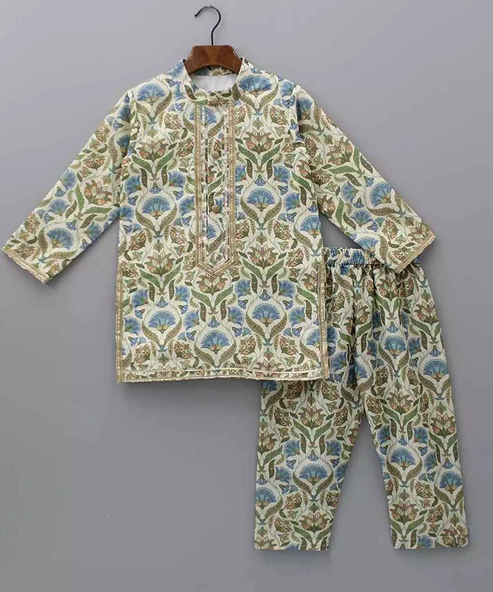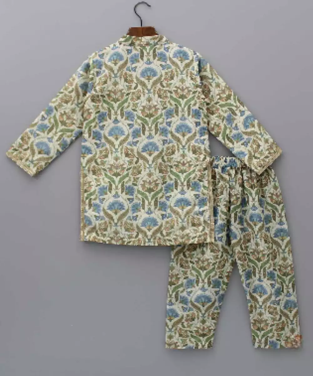 Kurta And Pyjama With Floral Prints On Them.Kurta With A Hook Panel Adorned With Buttons At The Front.Kurta With Lacework Around The Panel, Sleeve Hem And Hem.Kurta With Side Slits.Pyjama With An Elasticated Waist