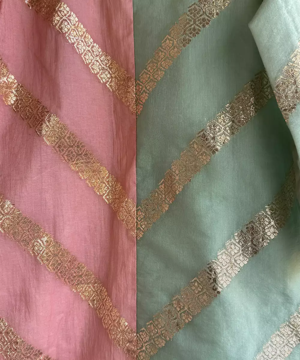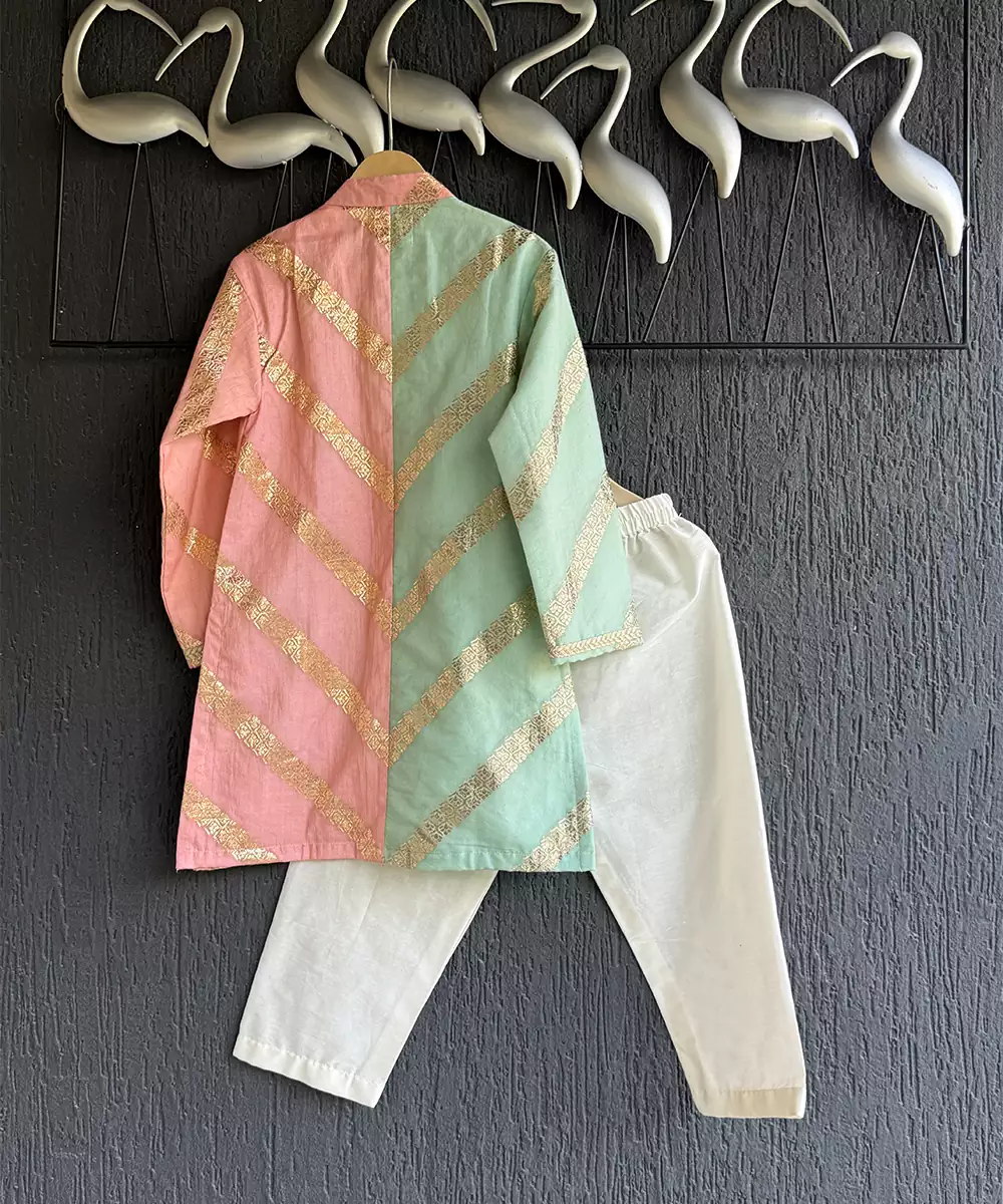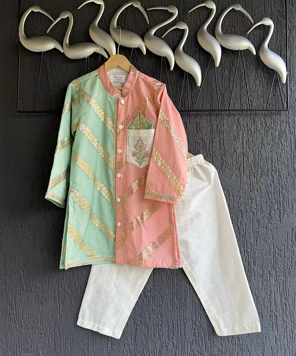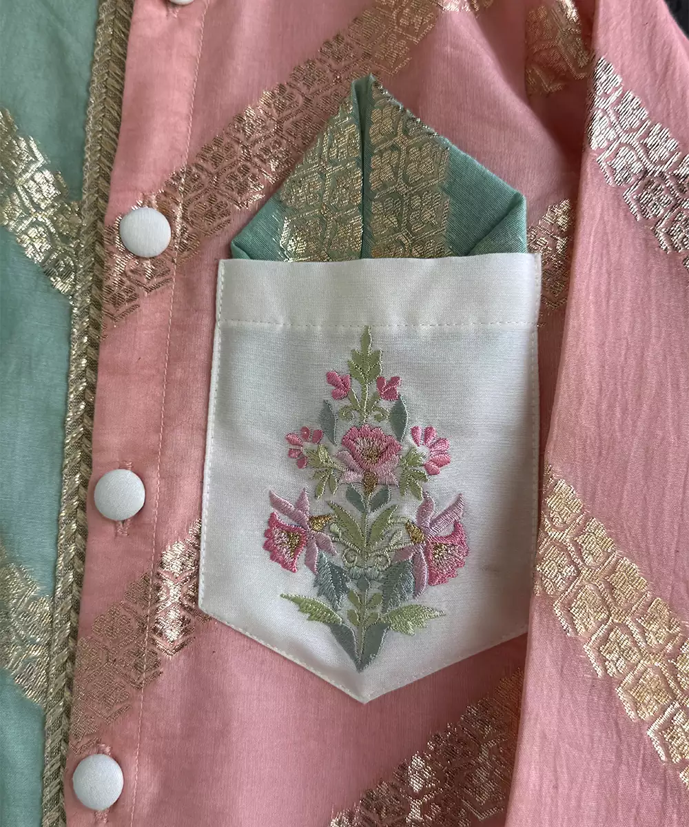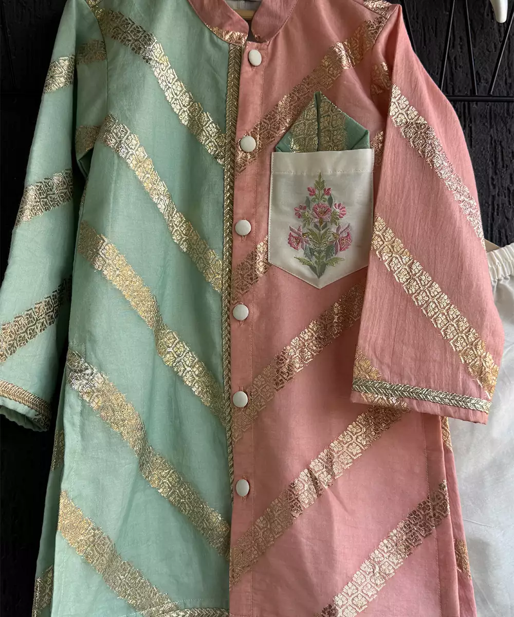 Peach And Green Color Blocking Chanderi Kurta With Resham Embrdoeired Pocket.Kurta With Cotton Lining . Bottom With Elasicated Waist .