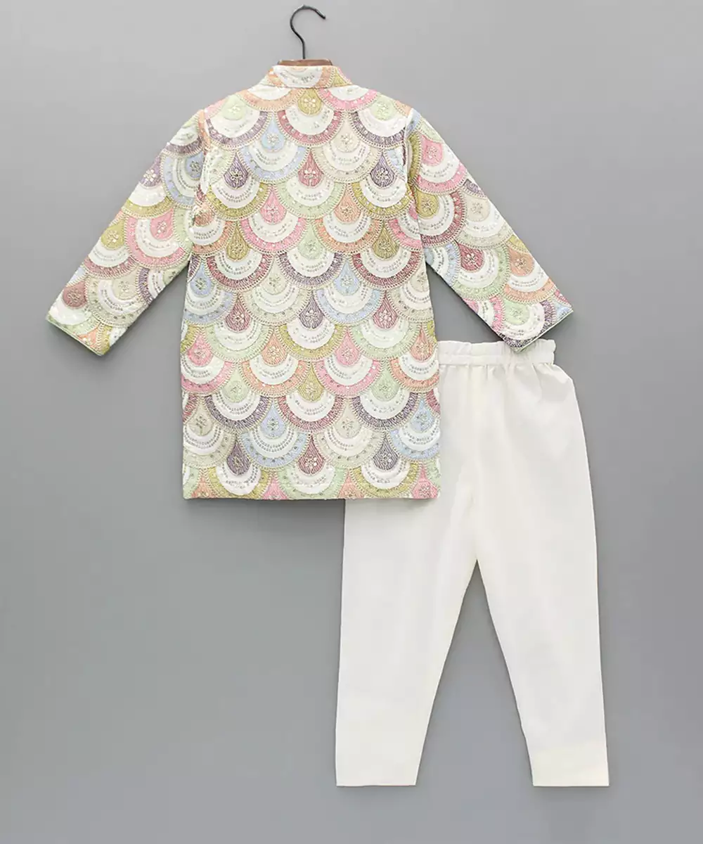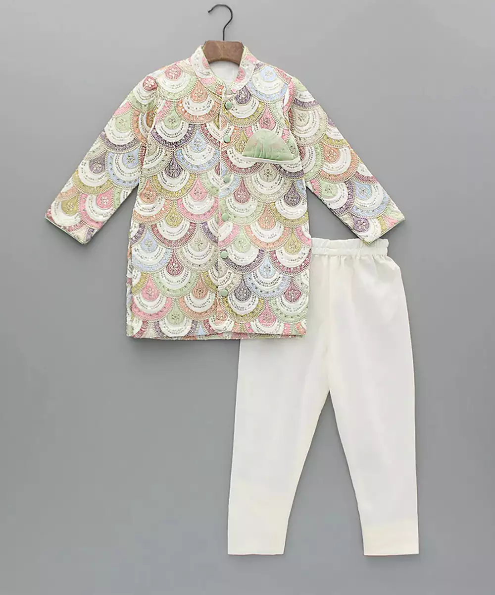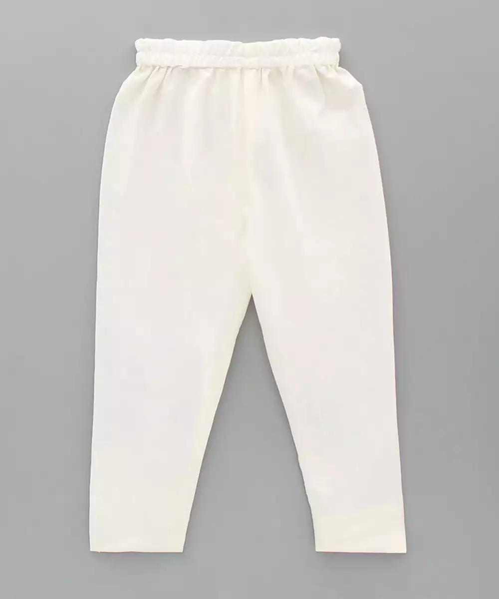 Embroidery Bandhgala With Contrast Doru Pipings And Organza Pocket Square . Top With Front Opening Buttons. Top With Pure Cotton Lining And Fusing Done All Over . Bottom With Band In The Front Elasticated Waist. At The Back.