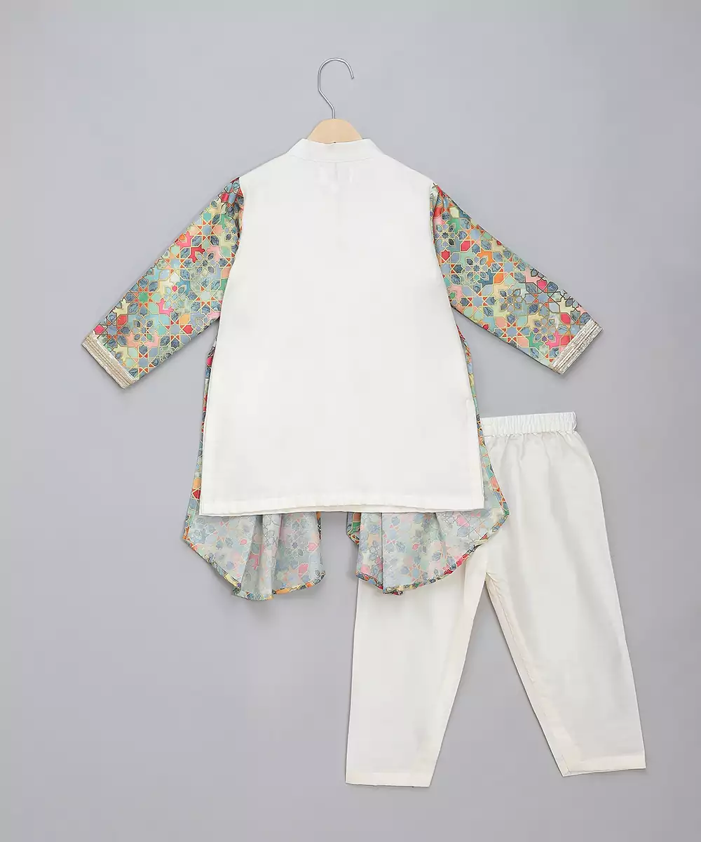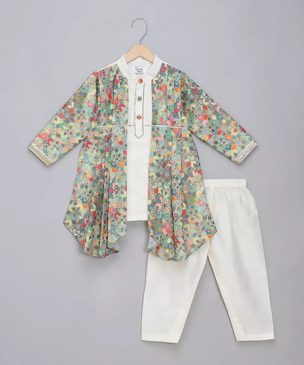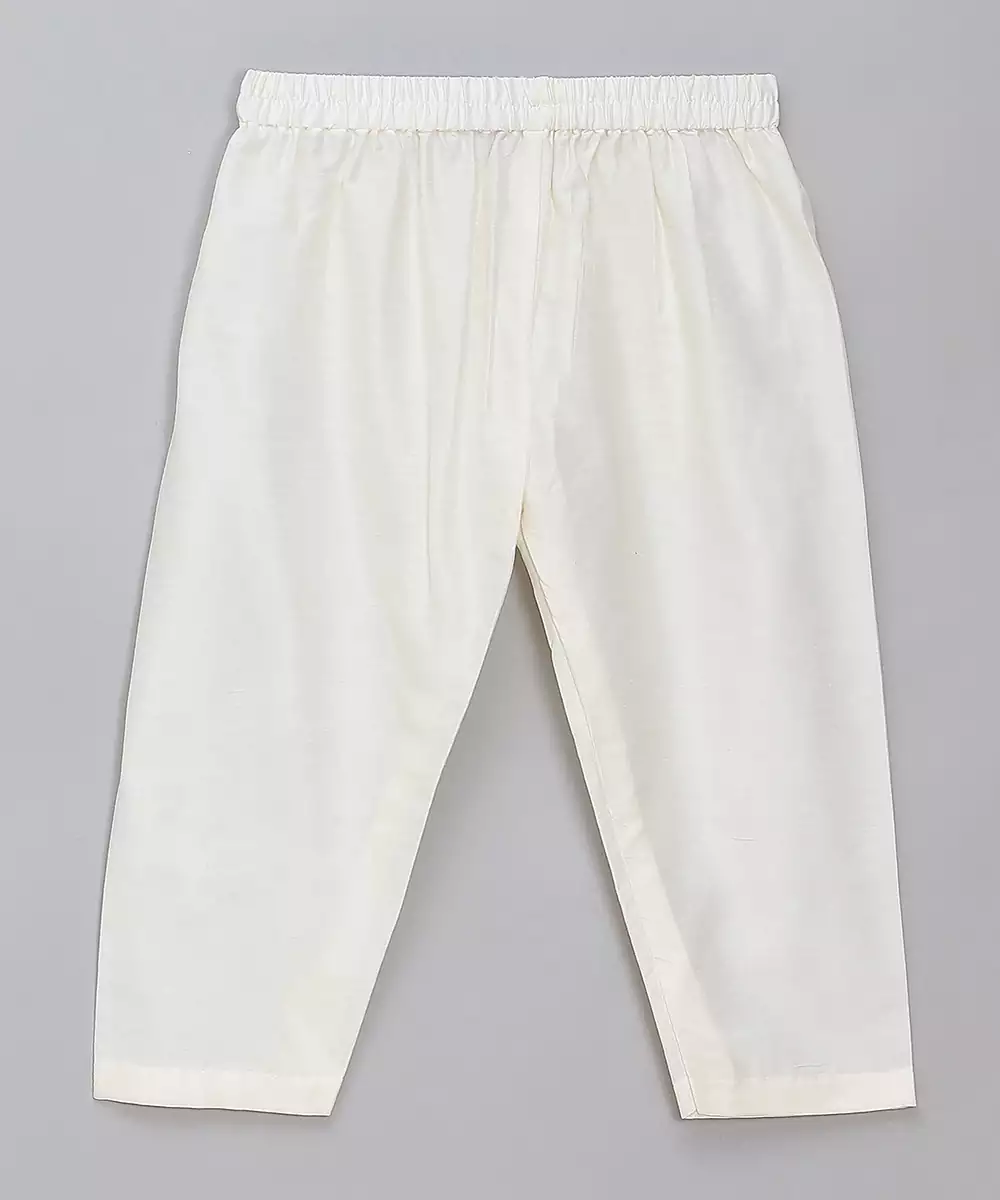Off White Cotton Silk Kurta With Front Opening . Attached Kaliedoscope Pleated Printed Panels On Both The Sides Of The Kurta .Fabric Buttons. Pajama With Elastic