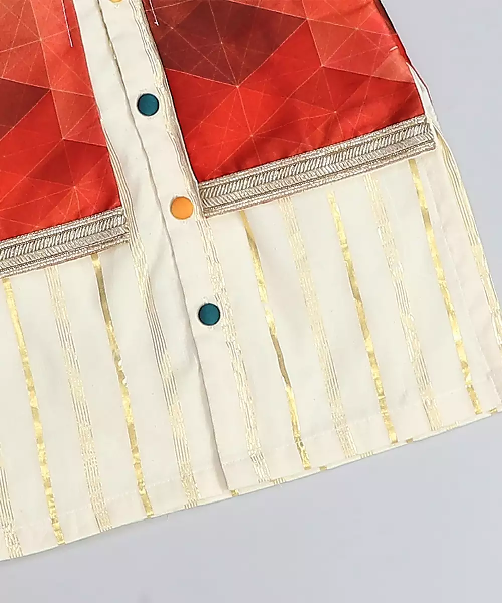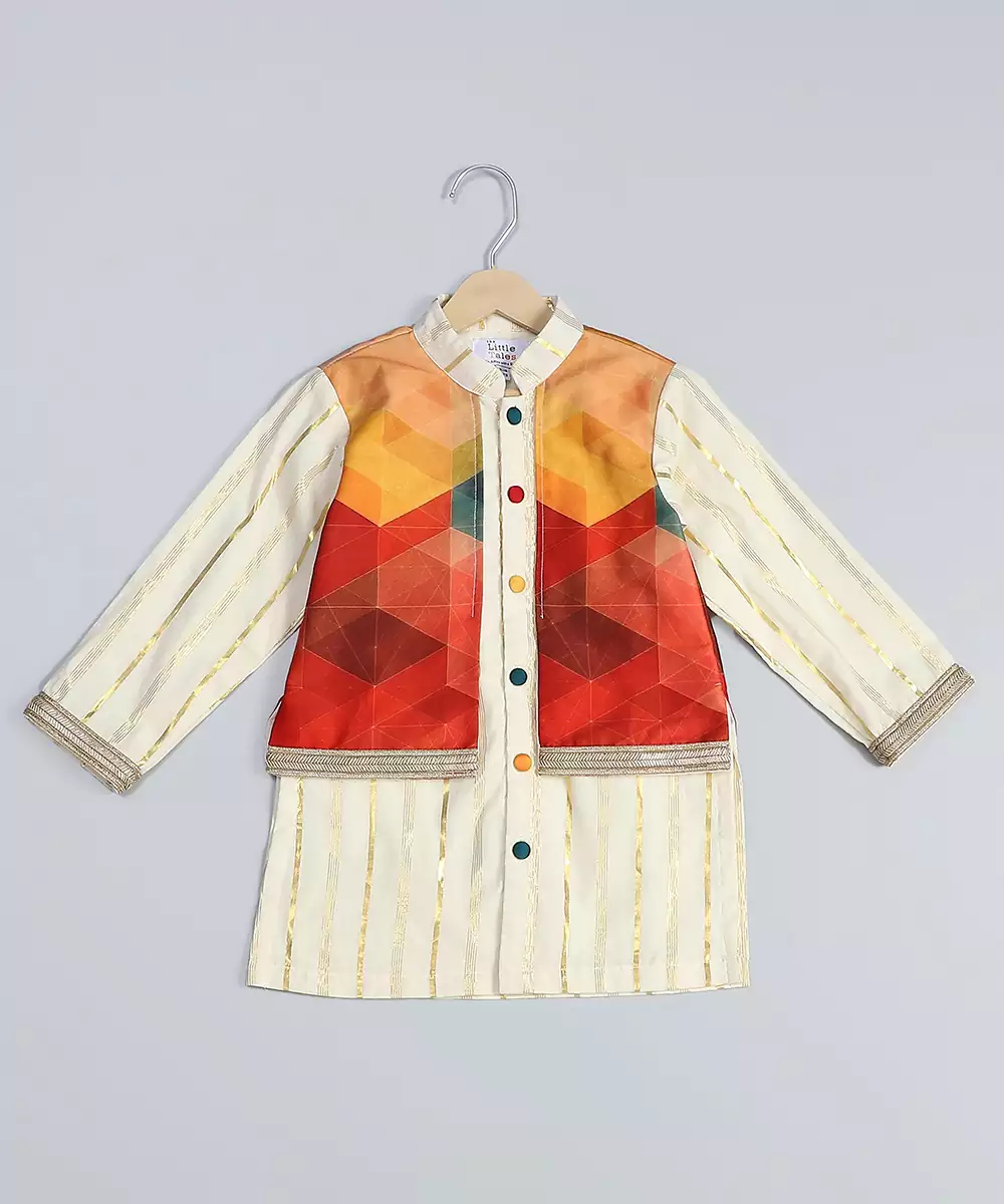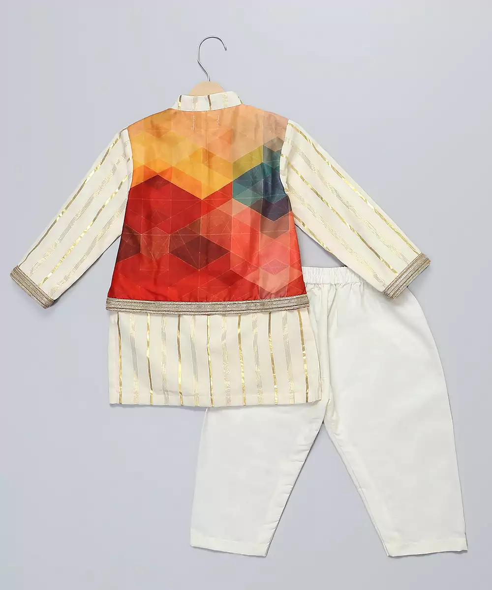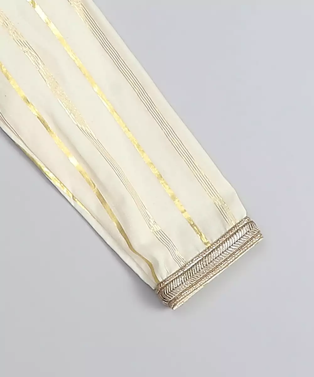 Off White Cotton With Self Gold Lines And Kaiedpscope Printed Attached Panels . Kurta Wit Front Opening. Bottom With Elastic Colour: Multicolor Fabric:Cotton Silk Components: 1 Bandhgala Kurta / 1 Pyjama