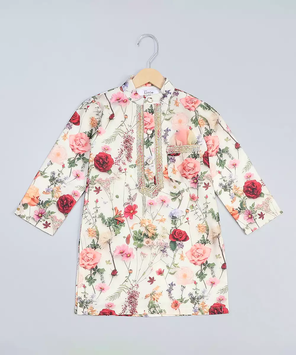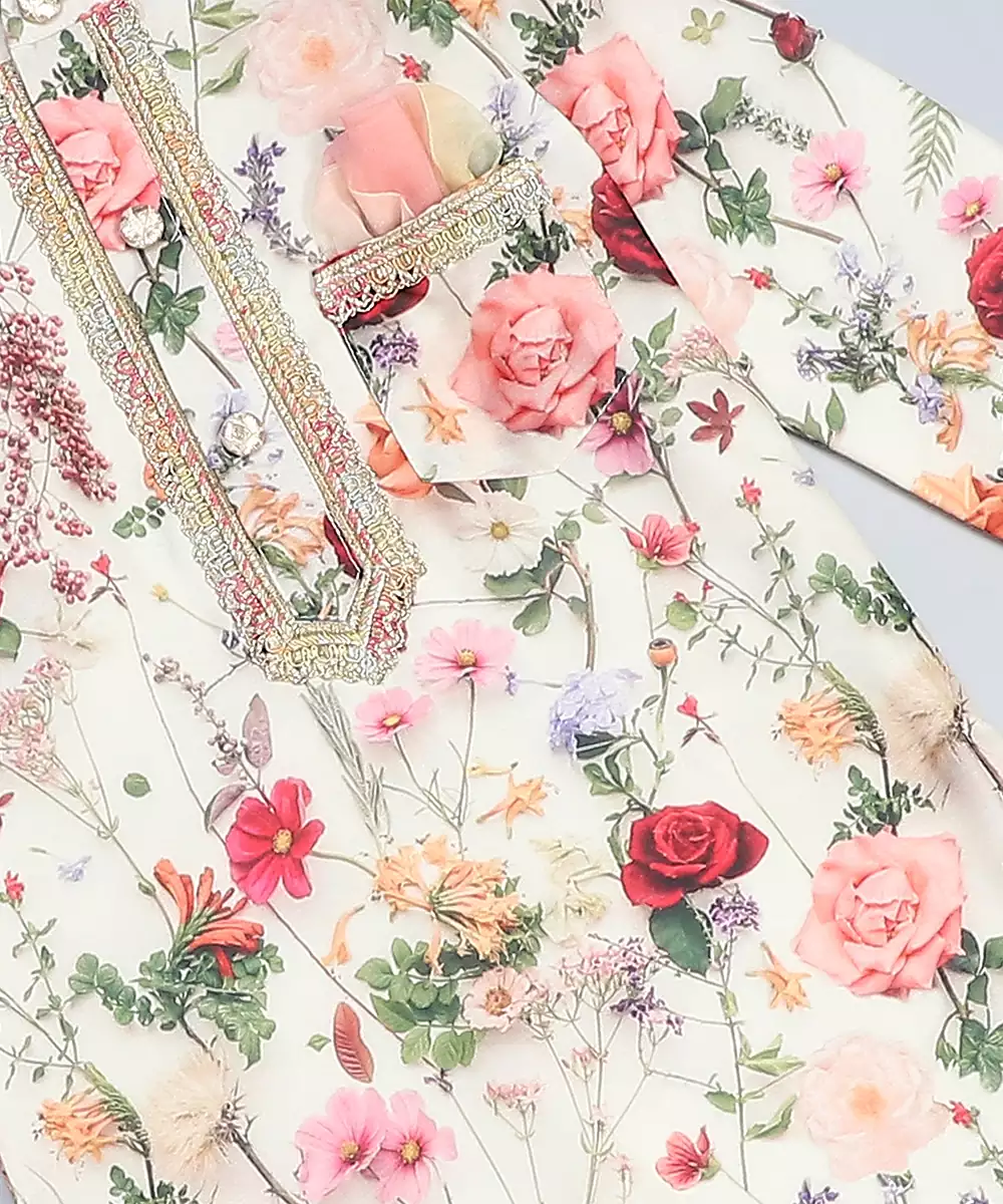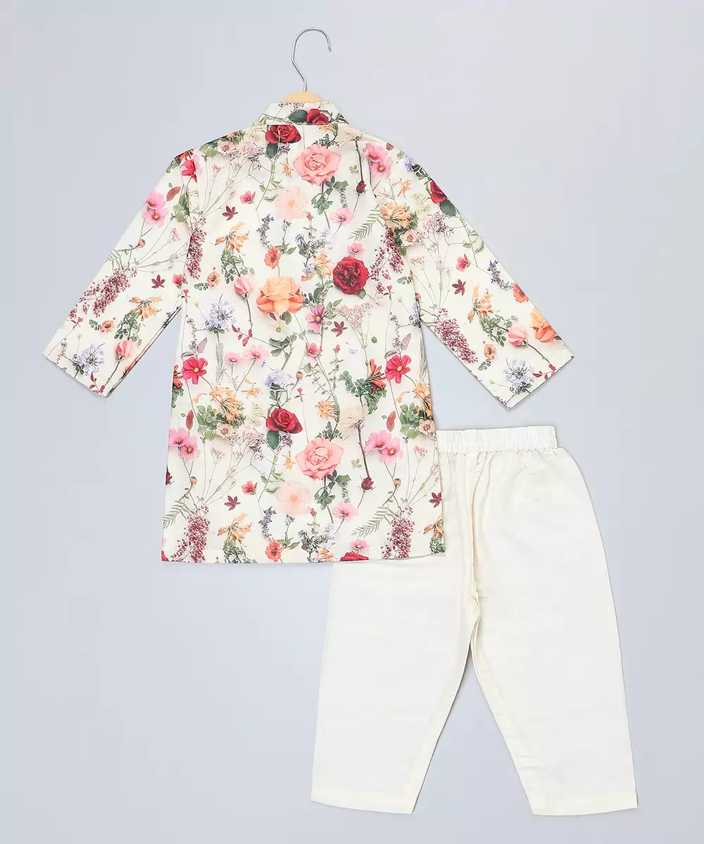 Mulitcolor Floral Printed Kurta With Front Opening Anf Lace Around The Placket..Kurta With Fabric Buttons .Bottom With Elastic.
