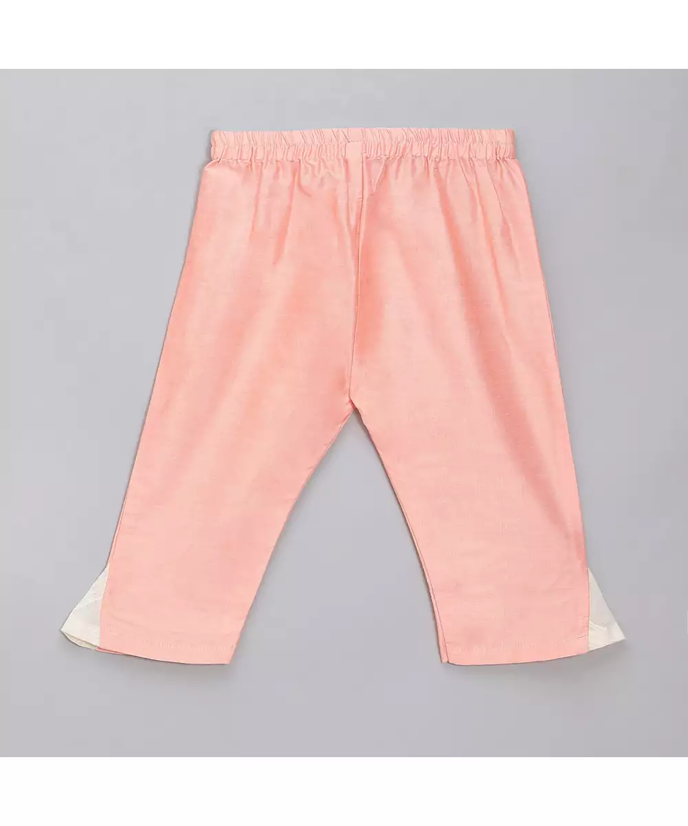 Offwhite Peach Lotus Printed Frock Kurta With Lace Finishings. Kurta With Full Sleeves. Kurta With Back Opening. Kurta With Cotton Lining. . Peach Cotton Silk Bottom With Cotton Jaquard Gusset On The Sides. Bottom With Elasticated Waist.