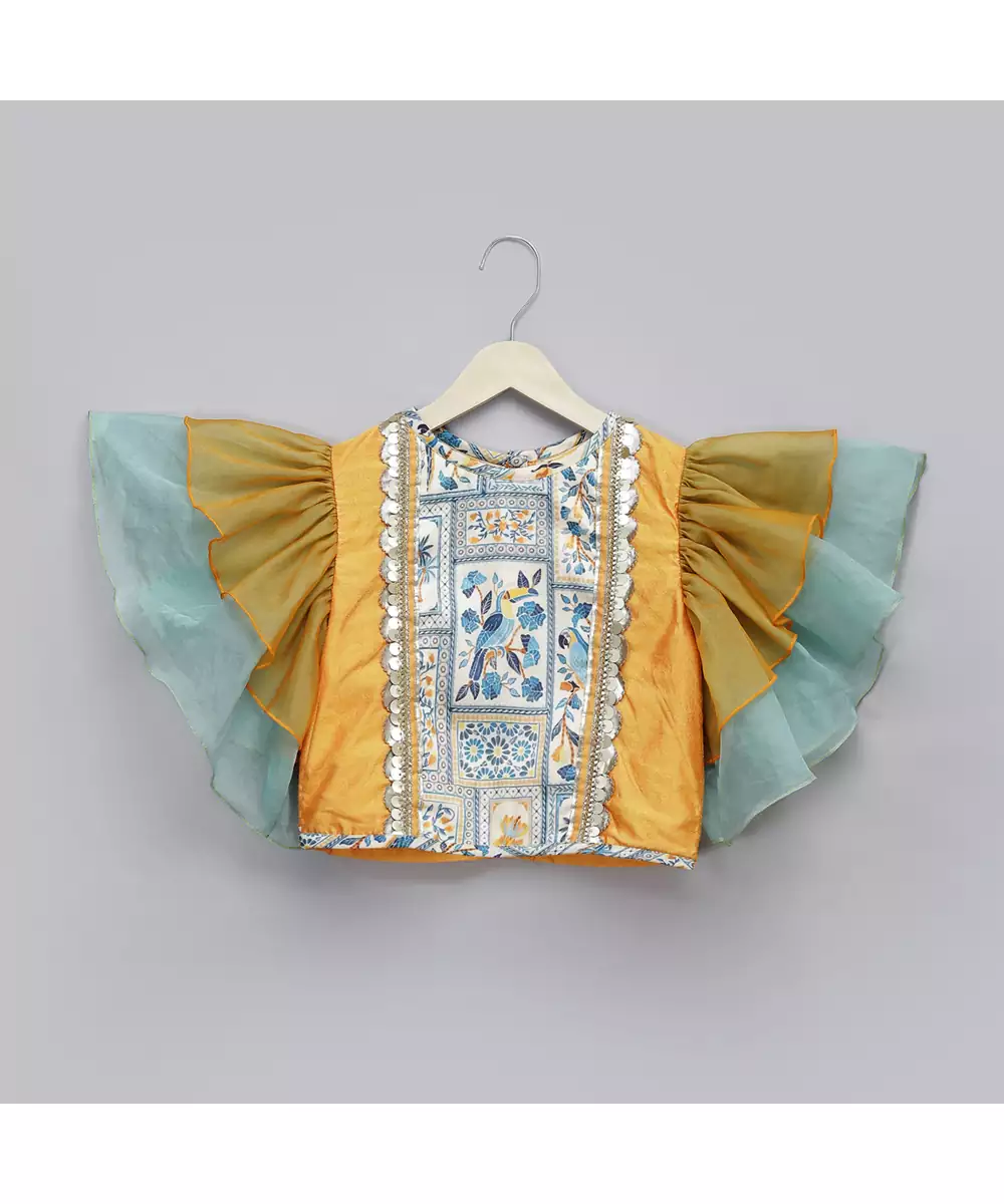 Orange And Blue Ruffled Sleeves Blouse With Printed Yoke And Lace Embellishments. Top With Back Opening. Blouse With Cotton Lining. Multicolor Parrot Printed Lehnga With Embroidered Lace At The Belt. Lehnga With Adjustable Drawstrings For The Waist To Adjust. Lehnga Comes With Beautiful Tassels