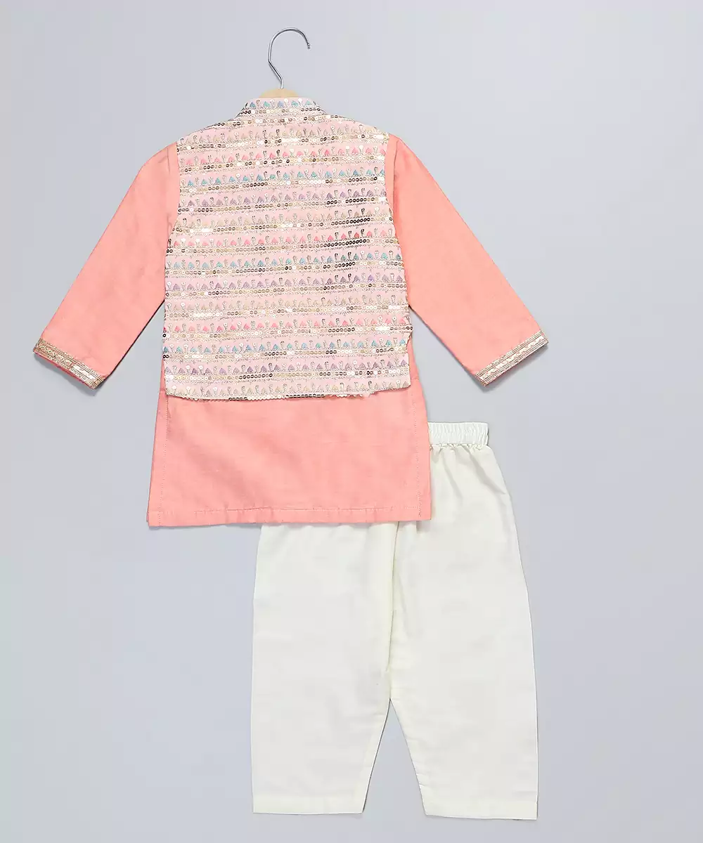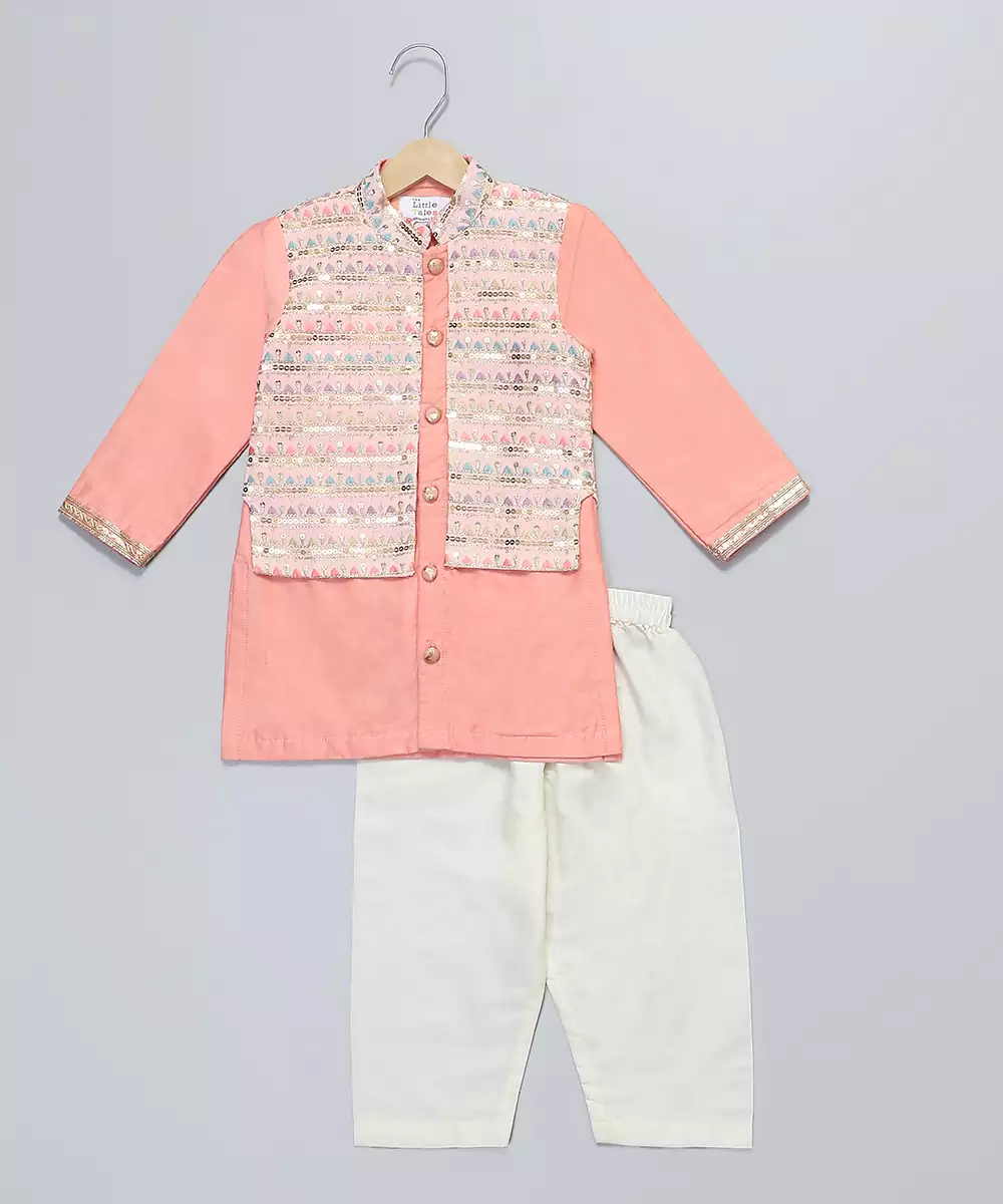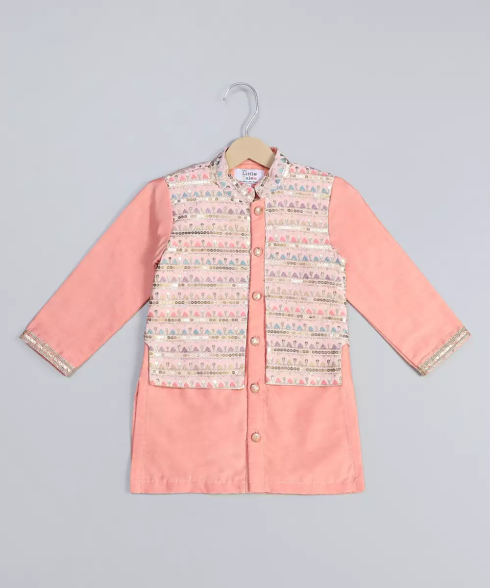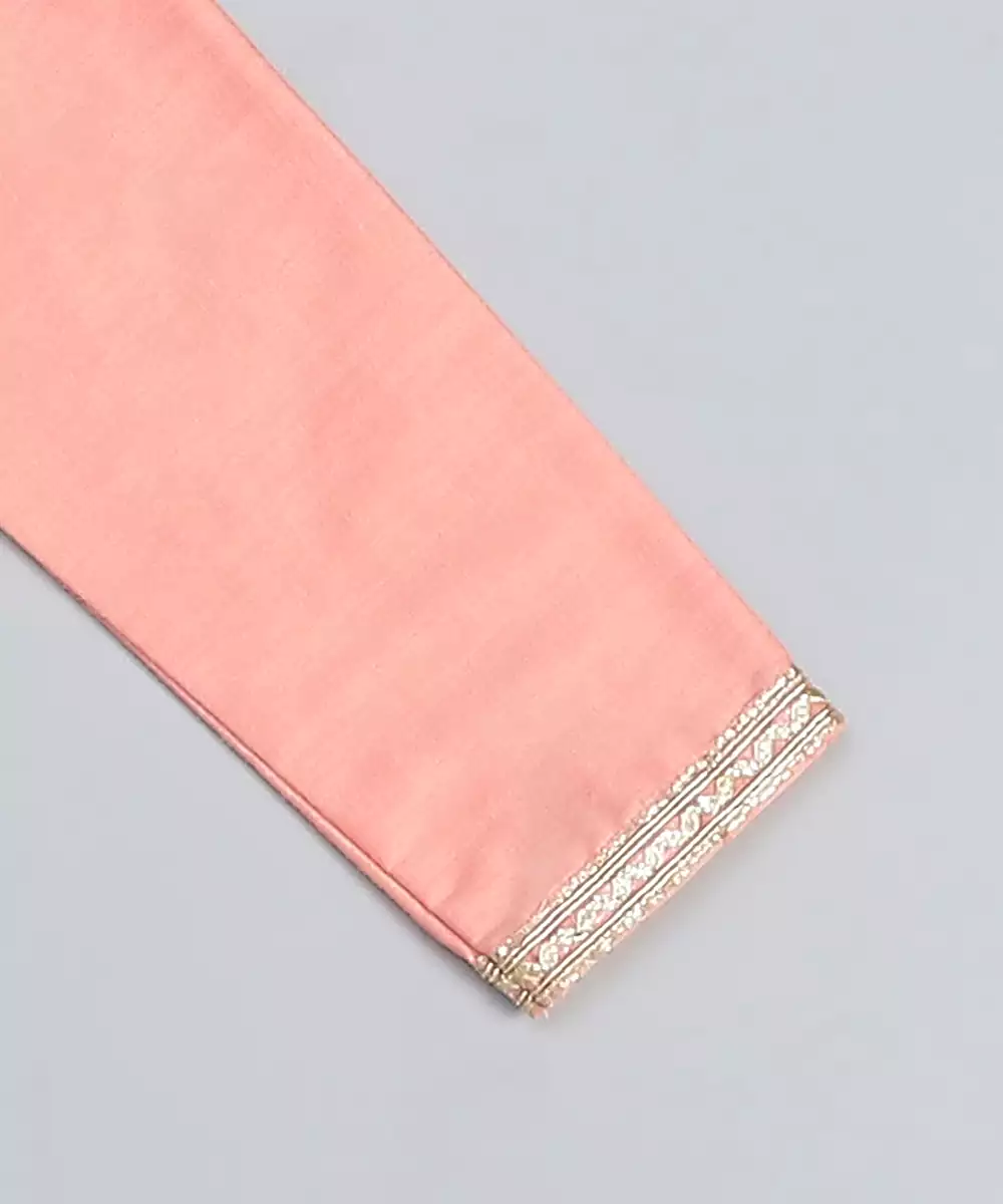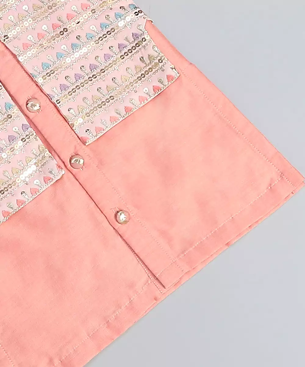 Peach Silk Kurta With Heavy Embrodiery Jacket Attached As Panels . Kurta Comes With Front Opening .Bottom Comes With Elastic