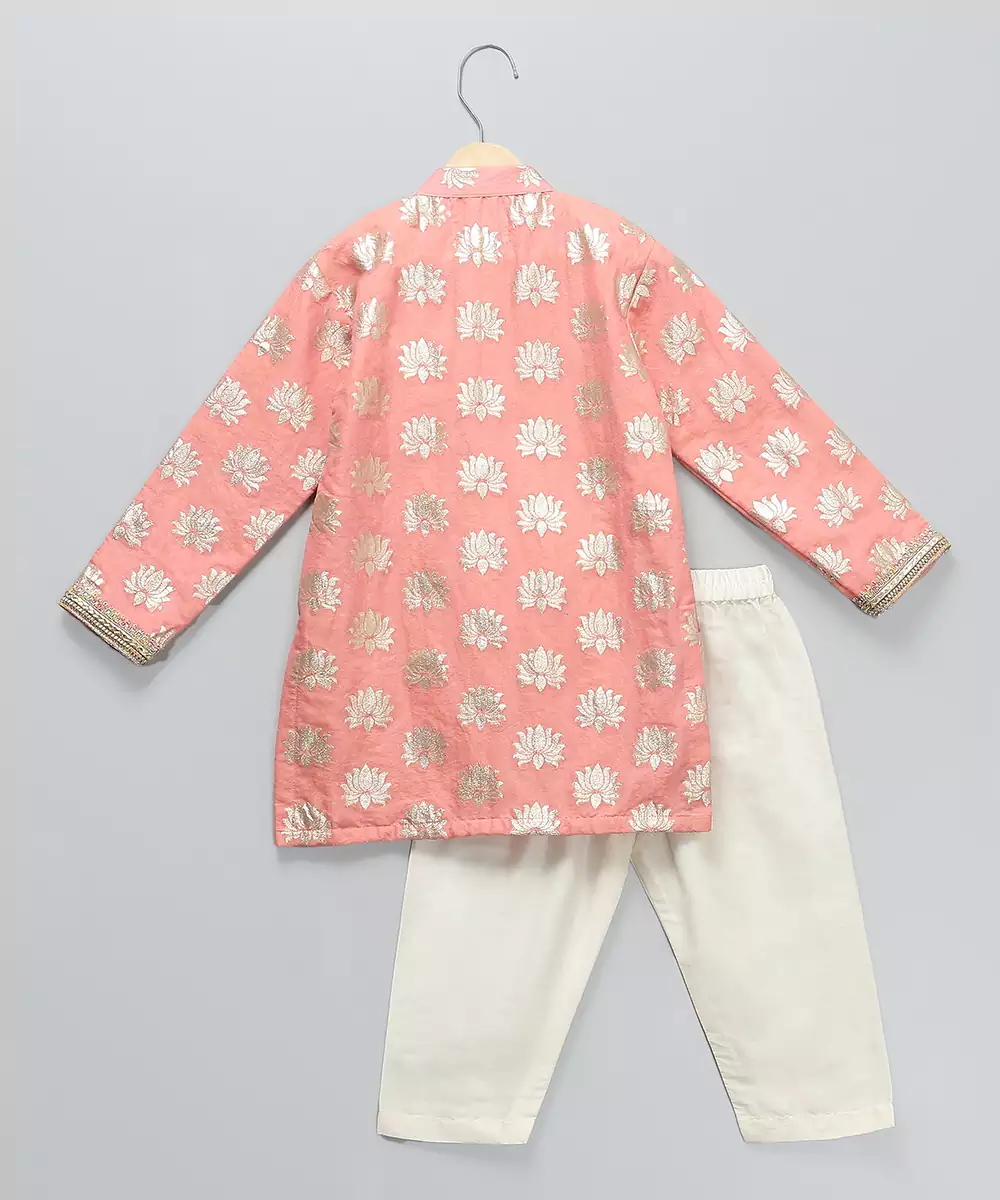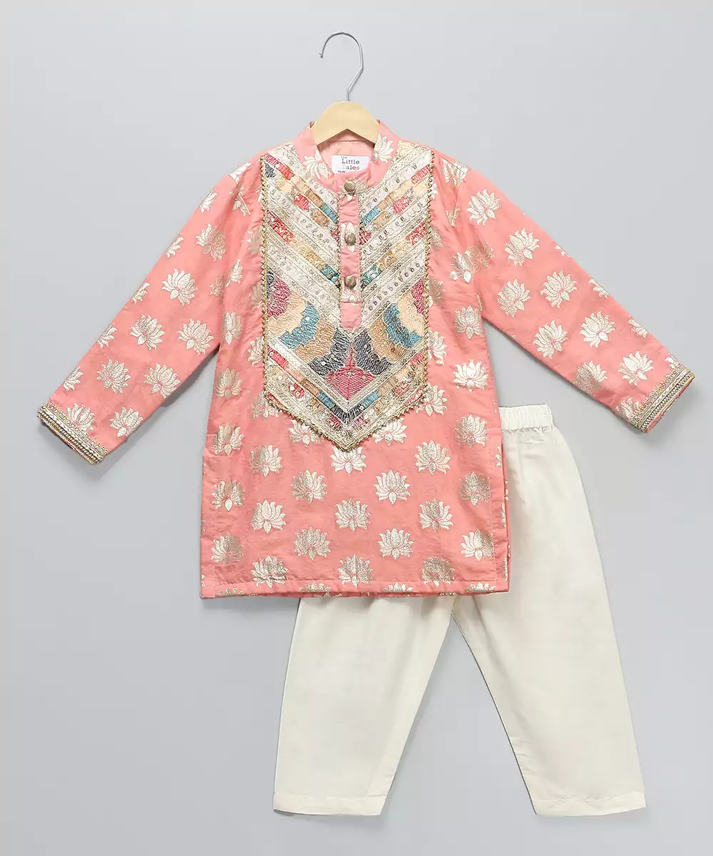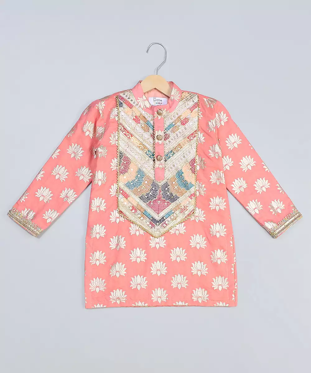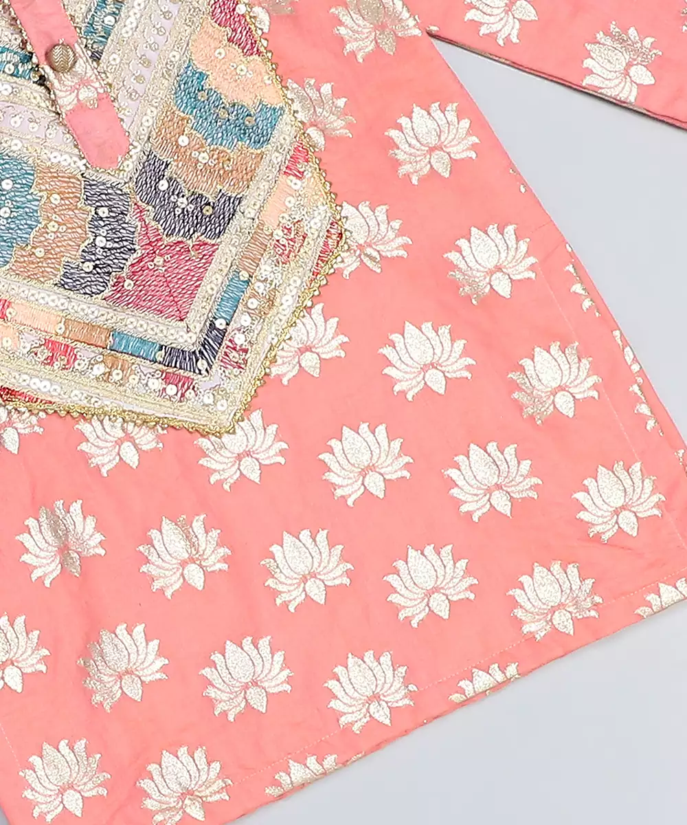 Lotus Weaved Chanderi Fabric Base Kurta With Embroidered Yoke Around And With Placket Opening. Bottom Comes With Elastic
