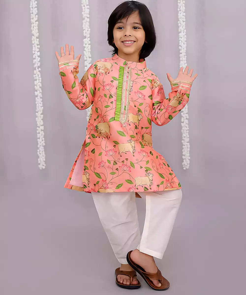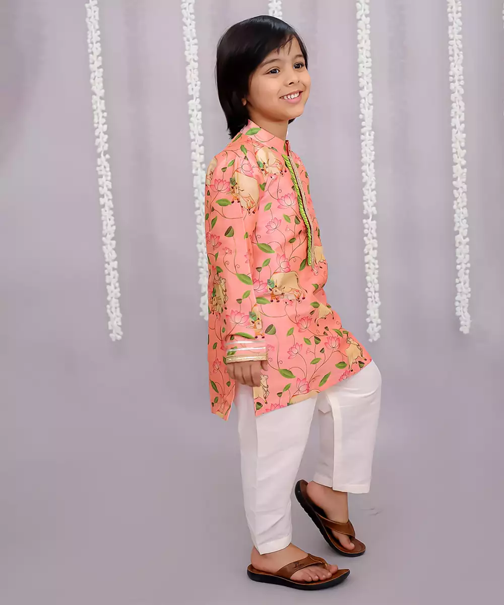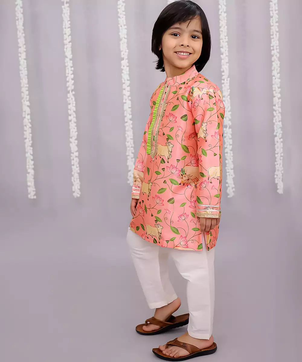 Peach Cow Print Kurta With Front Opening Kurta Contrast Cover Buttons.Kurta With Kurta Pati Withcontrast Fabric Pleating. Lace To Enhance The Look. Off White Bottom Elsaticated Waist.