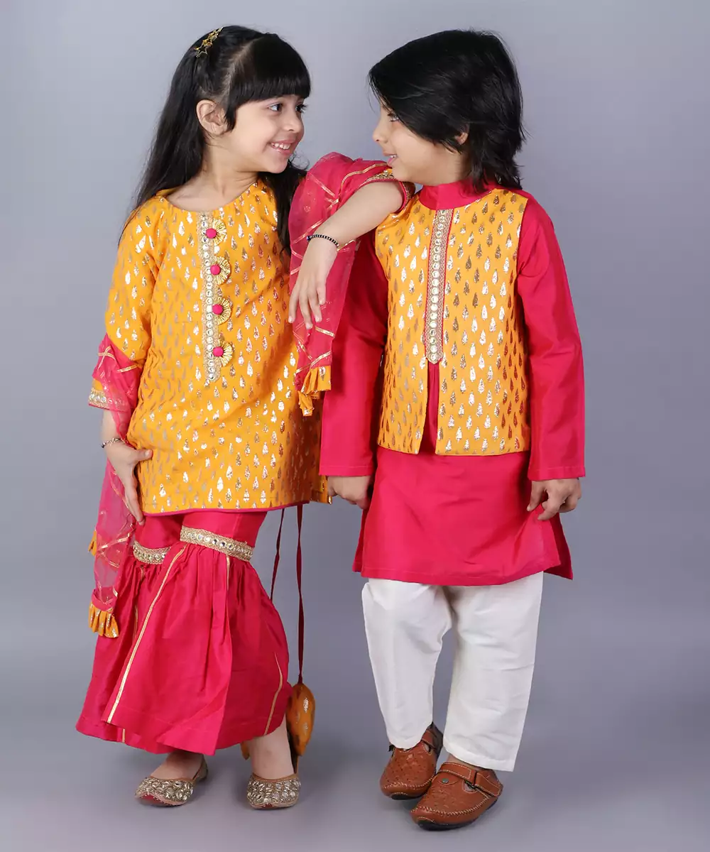 Yellow Eid Mubarak Embroidred Kurta With Full Sleeves. Kurta With Side Slits.Bottom With Front Opening . Pleated Salwar Bottom With Elasticated Waist.