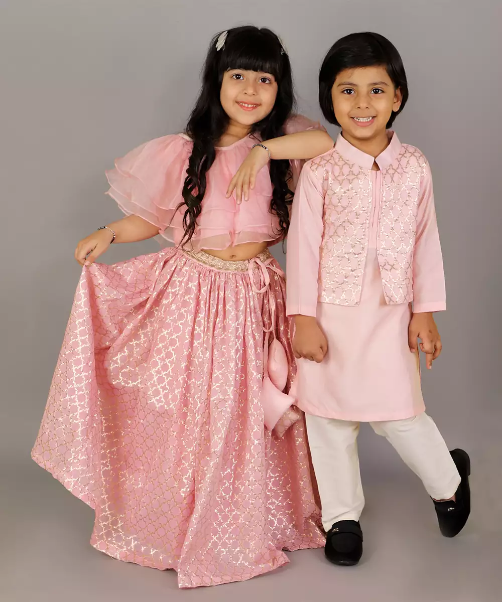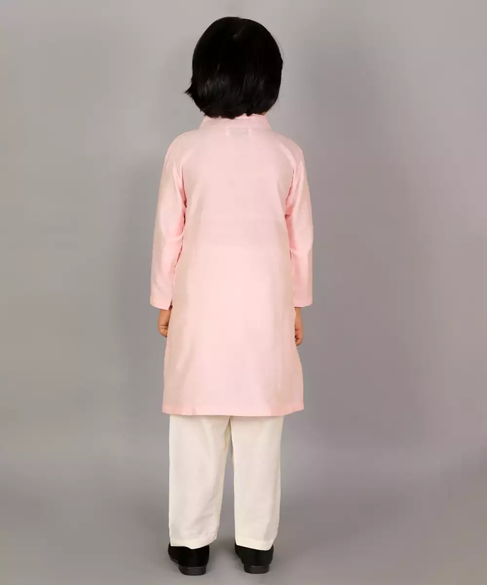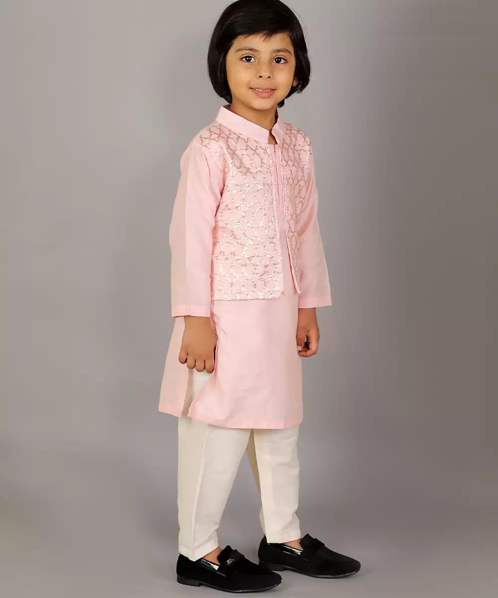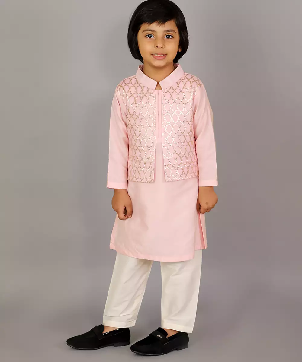 Pastel Pink Kurta With Zari Attached Jacket On Both Sides. Kurta With Front Opening .Offwhite Cotton Silk Pyjama . Bottom With Elasticated Waist Colour: Pink Fabric:Cotton Silk Components: 1 Bandhgala Kurta / 1 Pyjama
