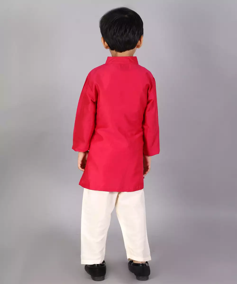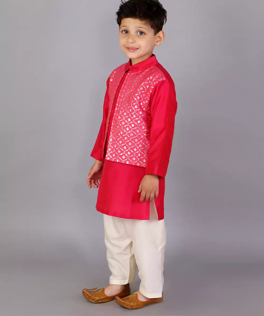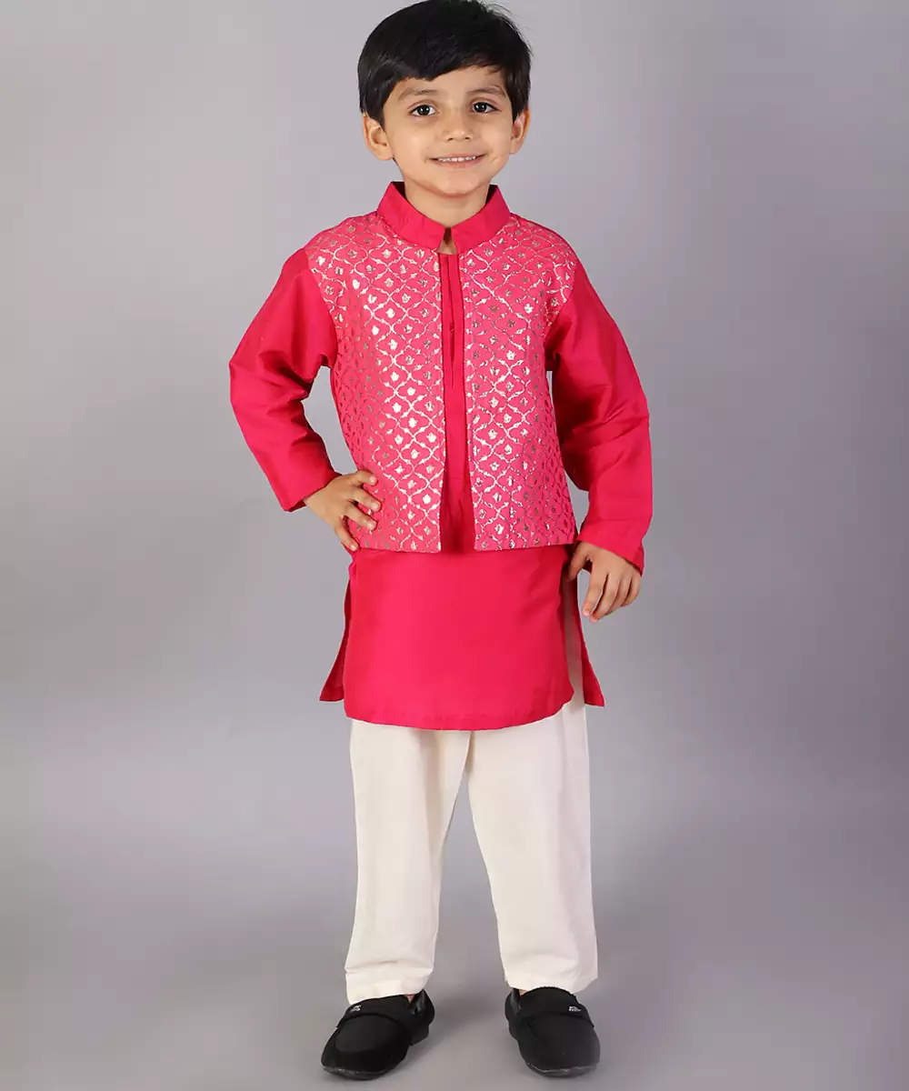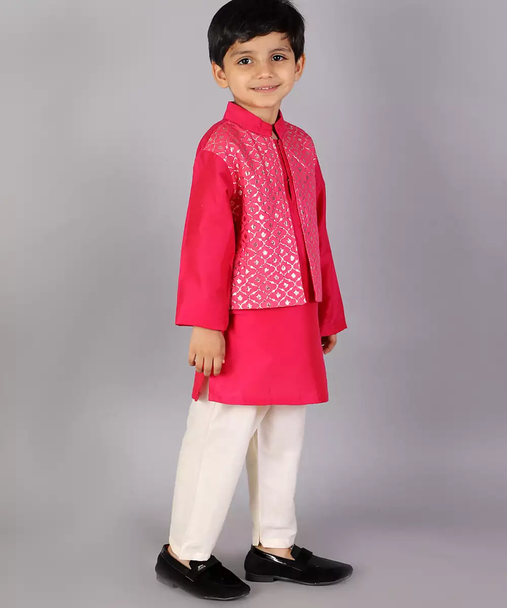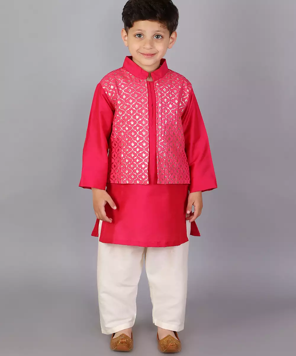 Fuschia Pink Kurta With Zari Attached Jacket On Both Sides. Kurta With Front Opening .Offwhite Cotton Silk Pyjama . Bottom With Elasticated Waist Colour: Pink Fabric:Cotton Silk Components: 1 Bandhgala Kurta / 1 Pyjama