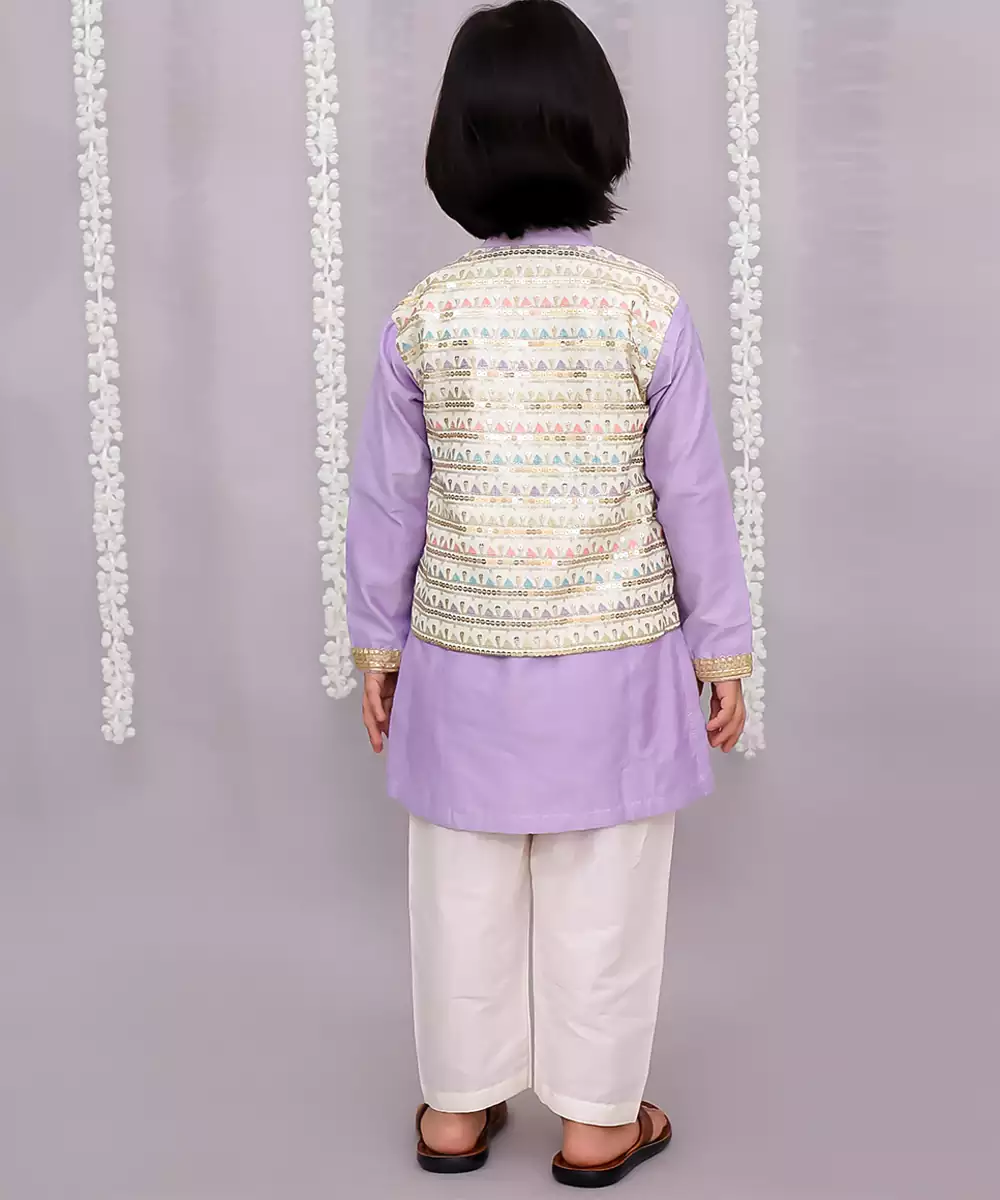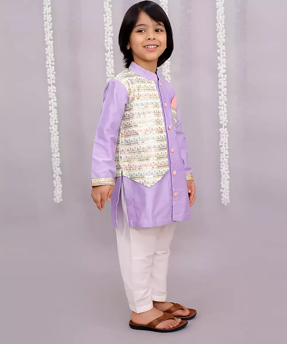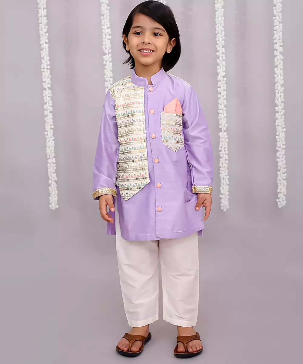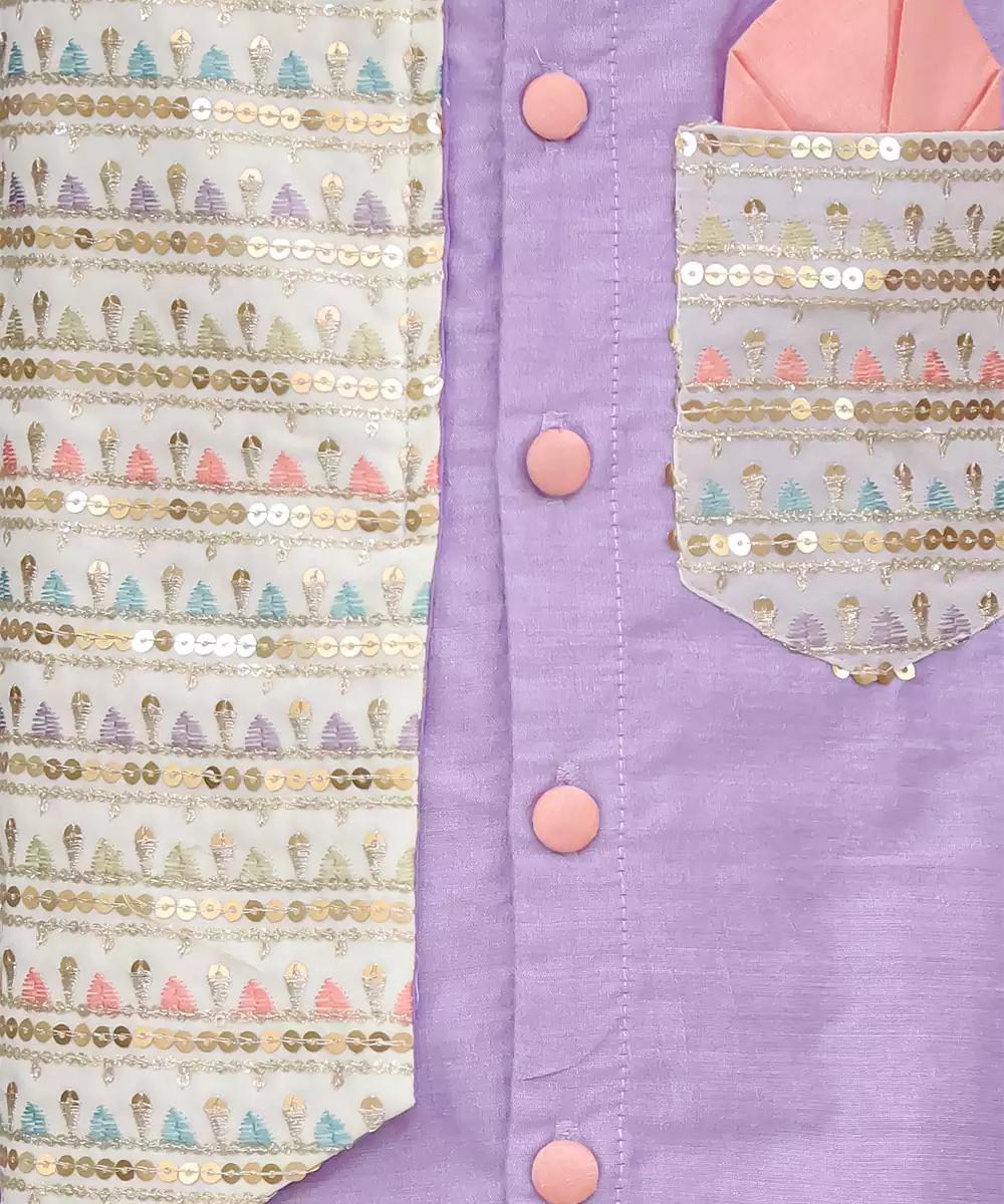 Lavendar Kurta Set With Embroidery Attached Jacket On Top .Kurta Comes With Soft Cotton Lining. Kurta Comes With Fabric Buttons. Pyjama In Off White Cotton Silk With Elasticated Waist.