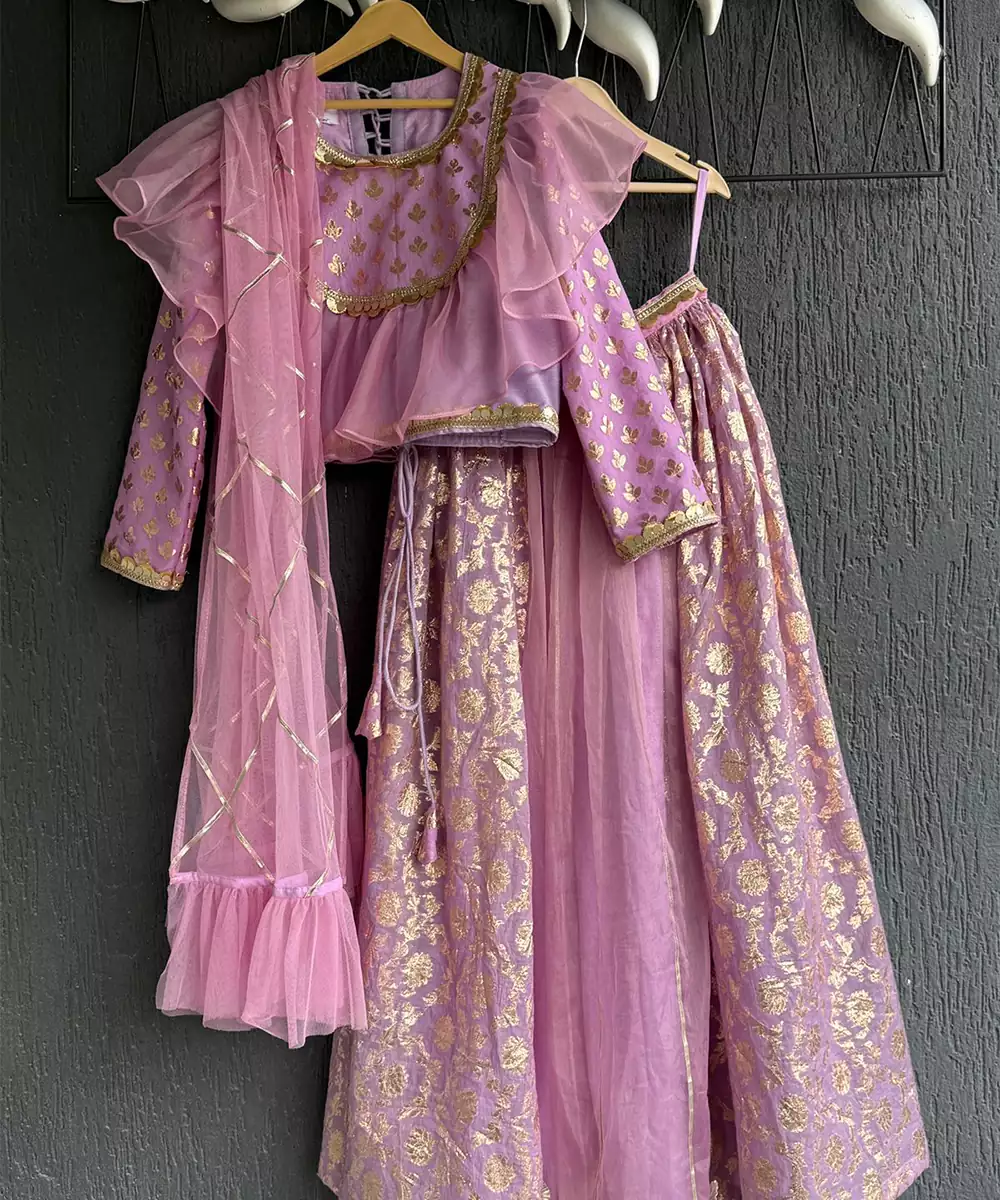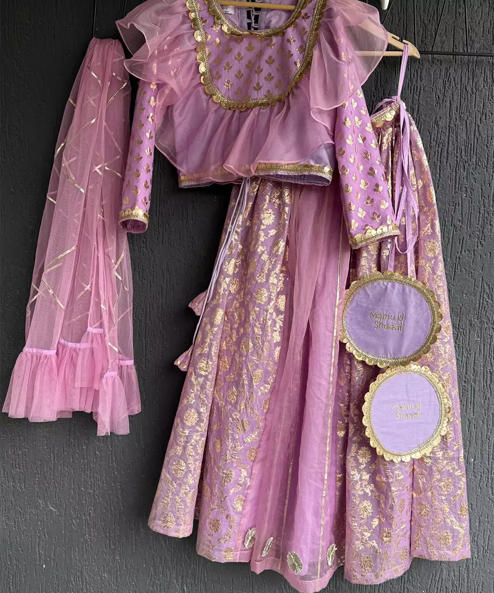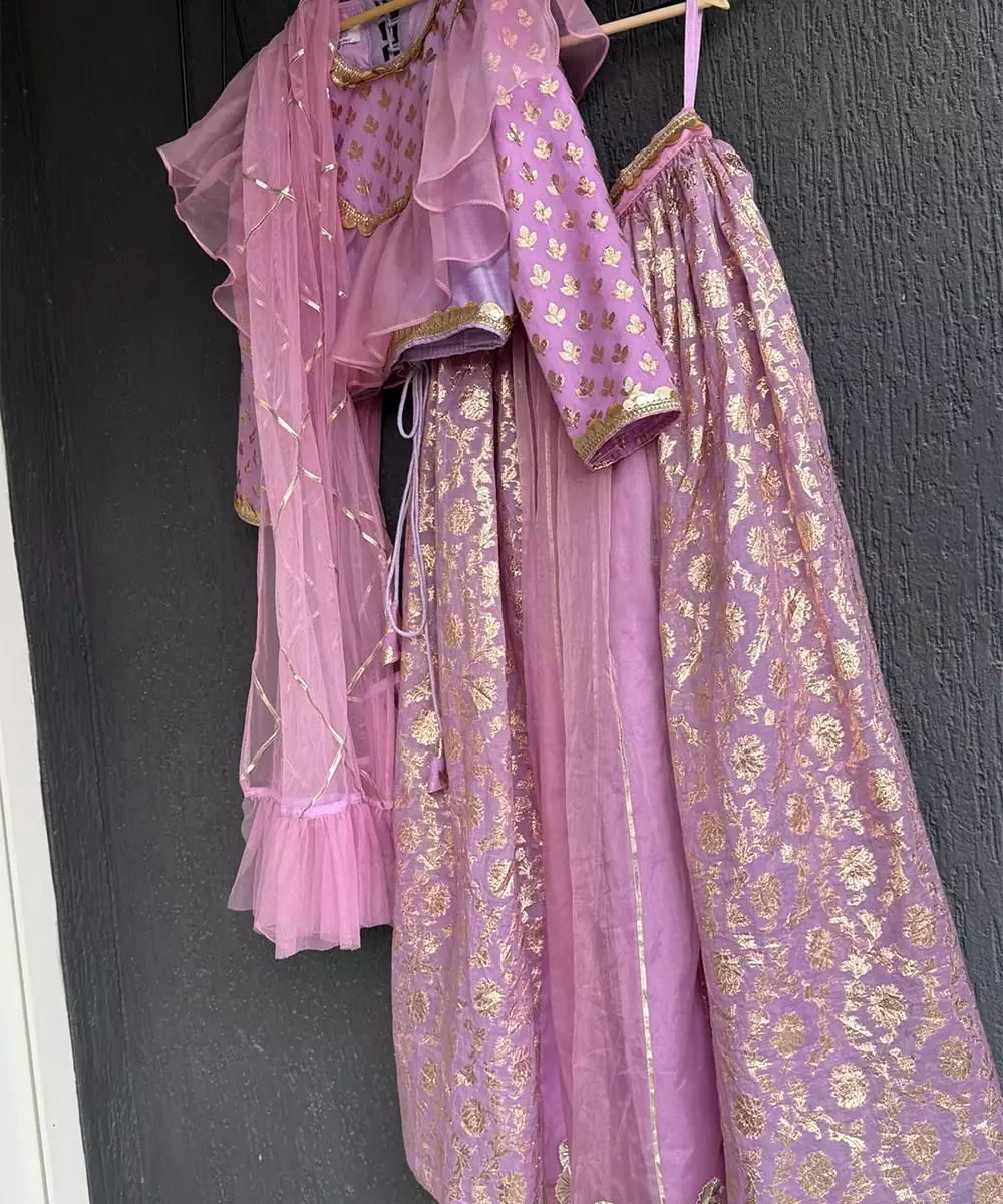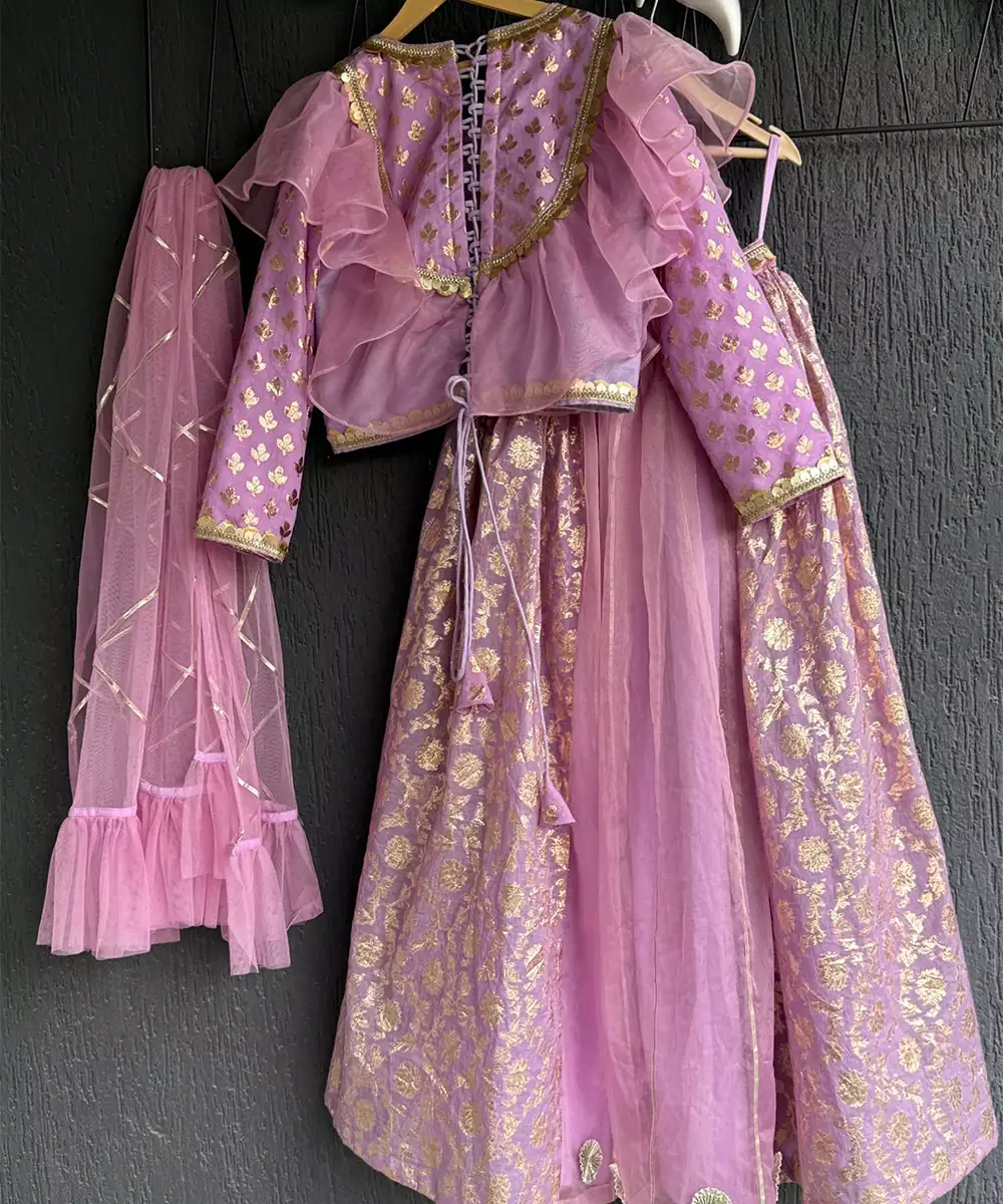 Lavender Silk Blouse And With Chanderi Yoke In The Front And Organza Frills On It And Lace Embellishment With Chnaderi Full Sleeves . Top With Back Opening . Blouse With Cotton Lining . Lehnga With Cotton Silk Gota Finihings Panel And Chanderi Panels With Embroidered Lace At The Belt . Lehnga With Adjustable Drawstrings For The Waist To Adjust . Lehnga Comes With Beautiful Printed Tassels . Dupatta In Soft Net With Gota Finishings On It.