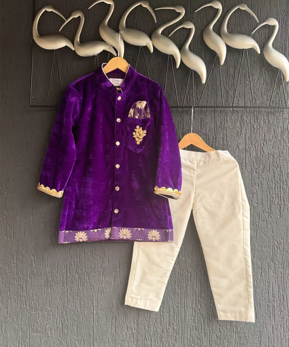 Purple Velvet One Side Chanderi Lotus Print Kurta With Mandarin Collar, Kurta With Side Slits And Lace Detailing Around The Button Placket And Sleeves Opening, Kurta With Gota Patchon The Pocket To Adorn The Look,Kurta With Fabric Covered Buttons And Hooks At The Front Opening,Pyjama With An Elasticated Waist.