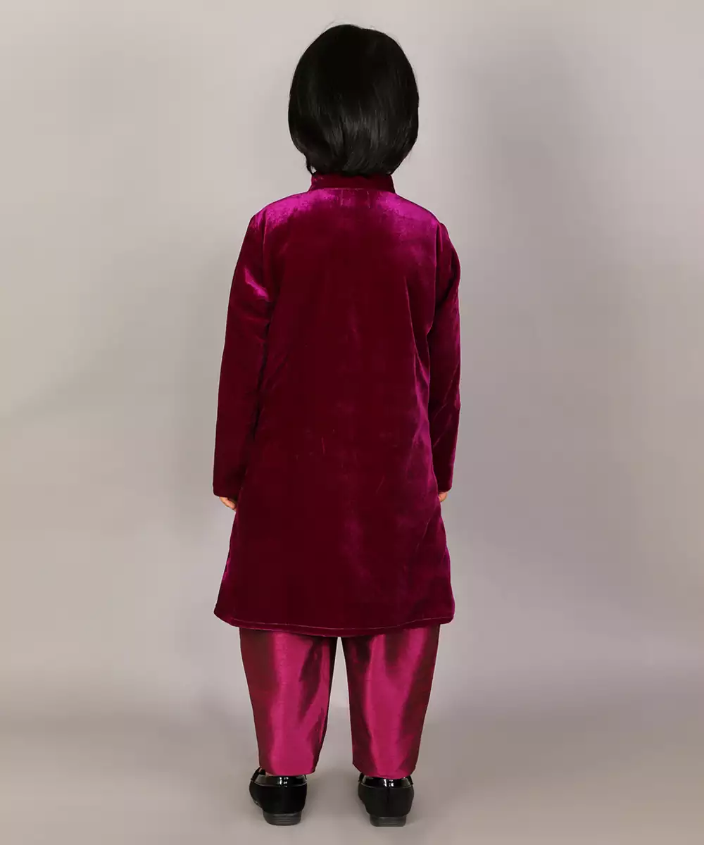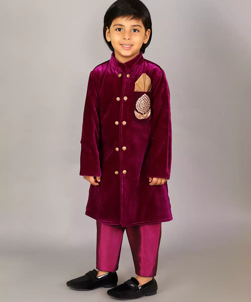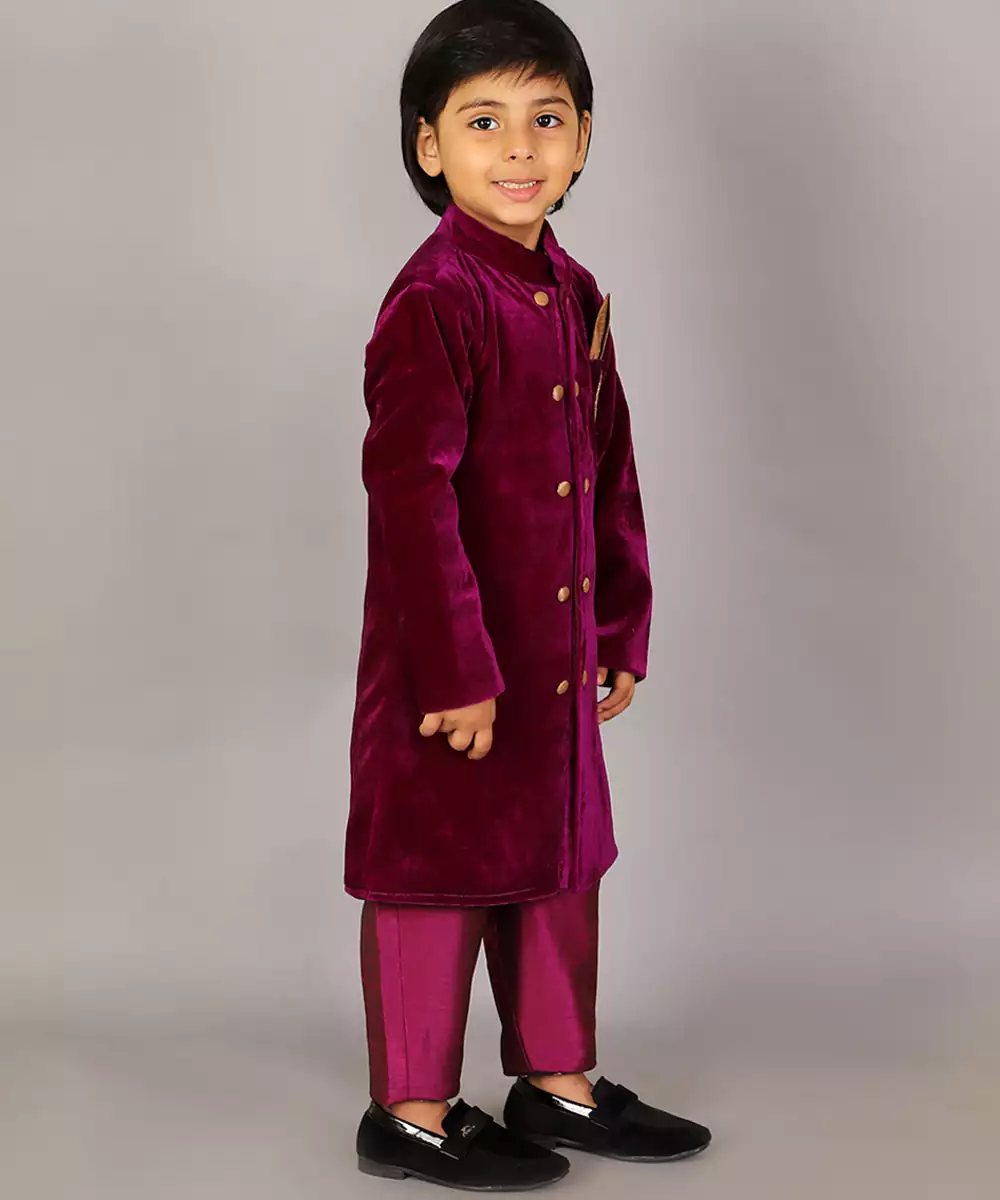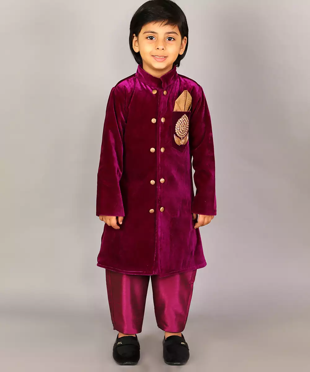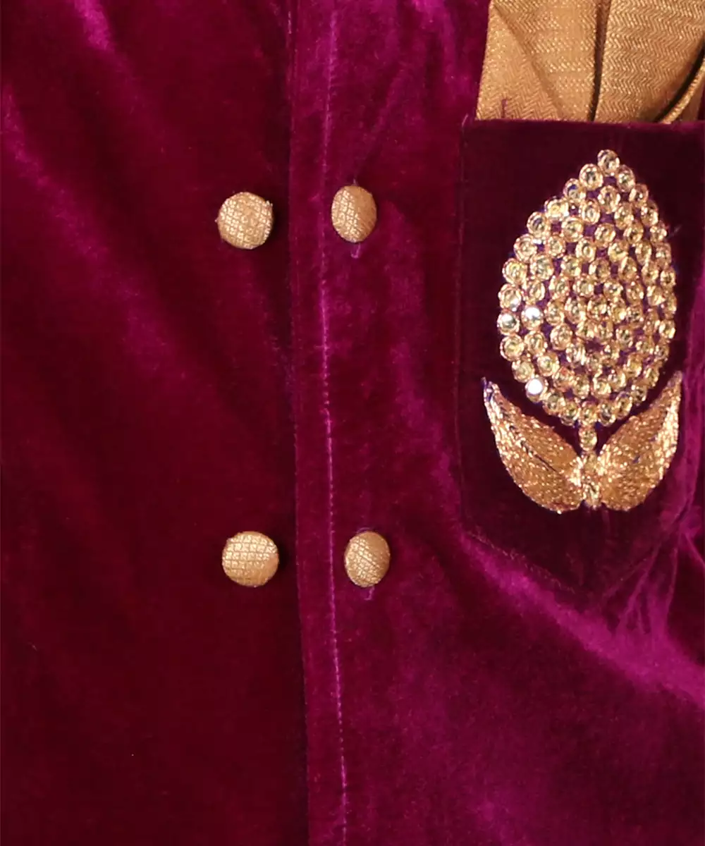 Purple Velvet Bandhgala With Contrast Brocade Buttons And Pocket Square . Bandhgala With Front Opening .Botton In Raw Silk Fabric With Cotton Lining..Bottom With Elasticated Waist