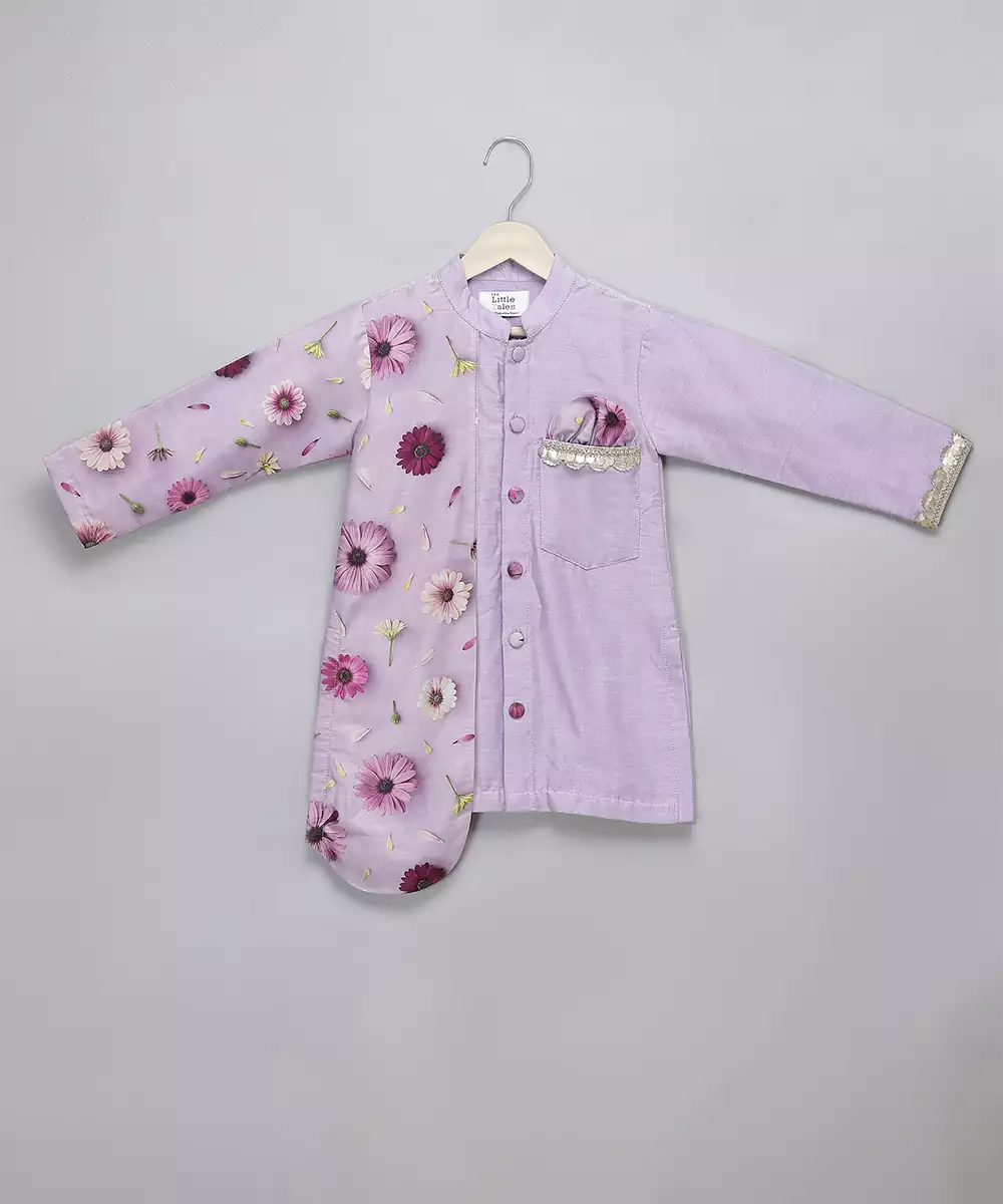 Lilac Coton Silk Kurta Set With Floral Printed High Low Panel On One Side With Printed Pocket Square On The Other Side And Lace Embelishments. Bottom With Elastic