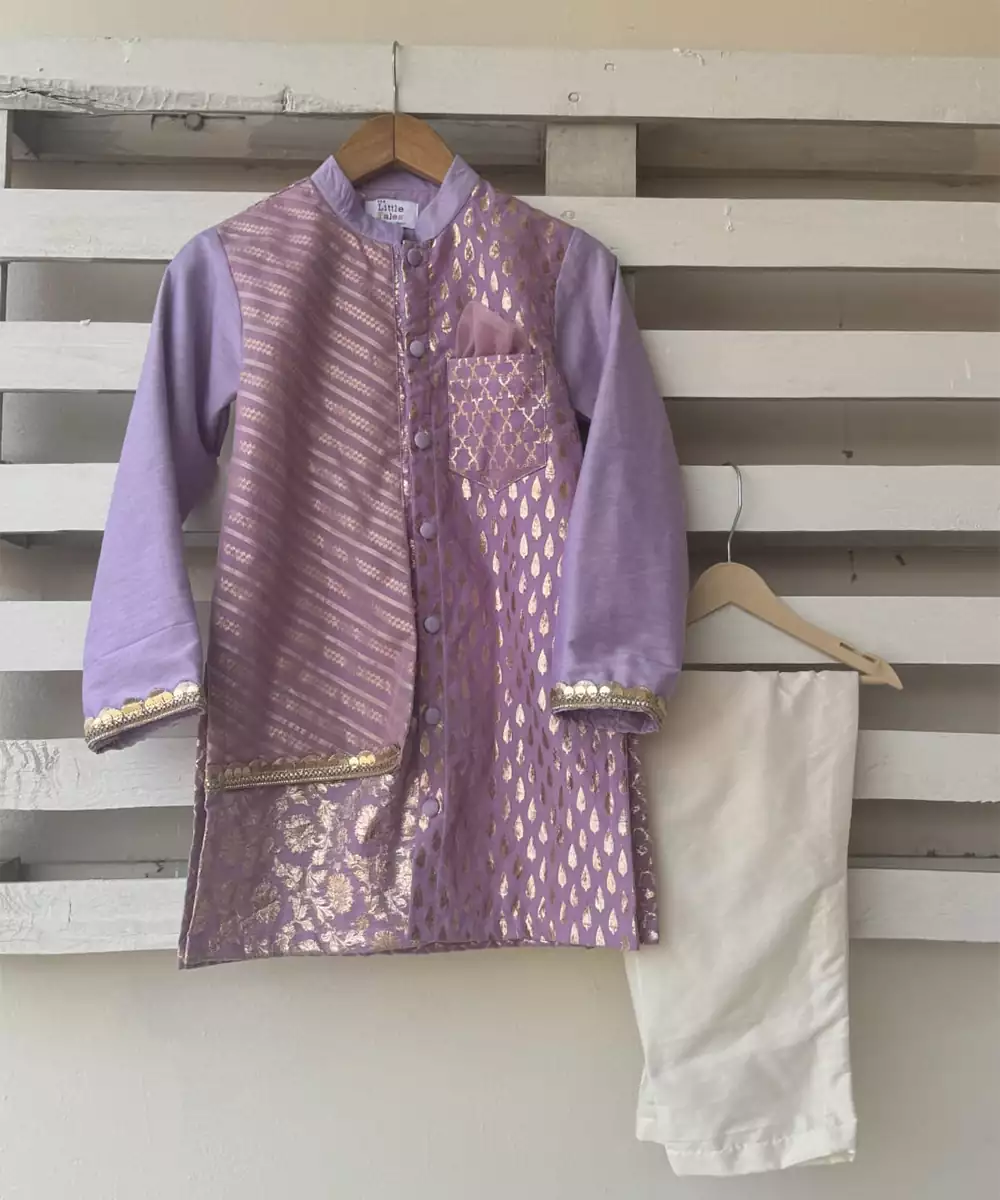 Pastel Purple Organza Kurta With Cotton Lining.Kurta With Front Opening. Attached Cotton Zari Panels On The Kurta .With Pocket .And Off White Pajama With Elastic.