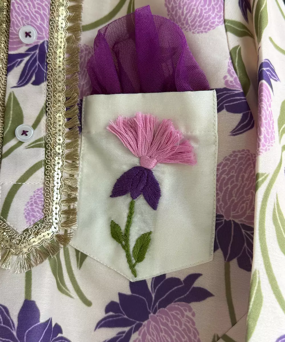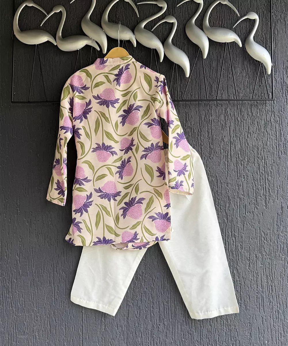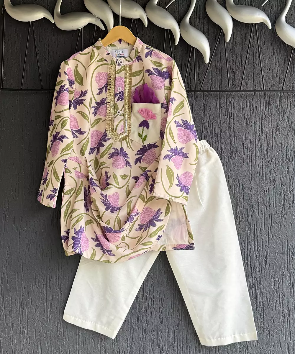 Off White Purple Cowl Digital Printed Kurta Set With Anchor Thread Embroidery Pocket.Lace Around The Neckline. Cotton Lining Inside The Kurta . Off White Or Floral Printed Pjama With Elasticated Waist .