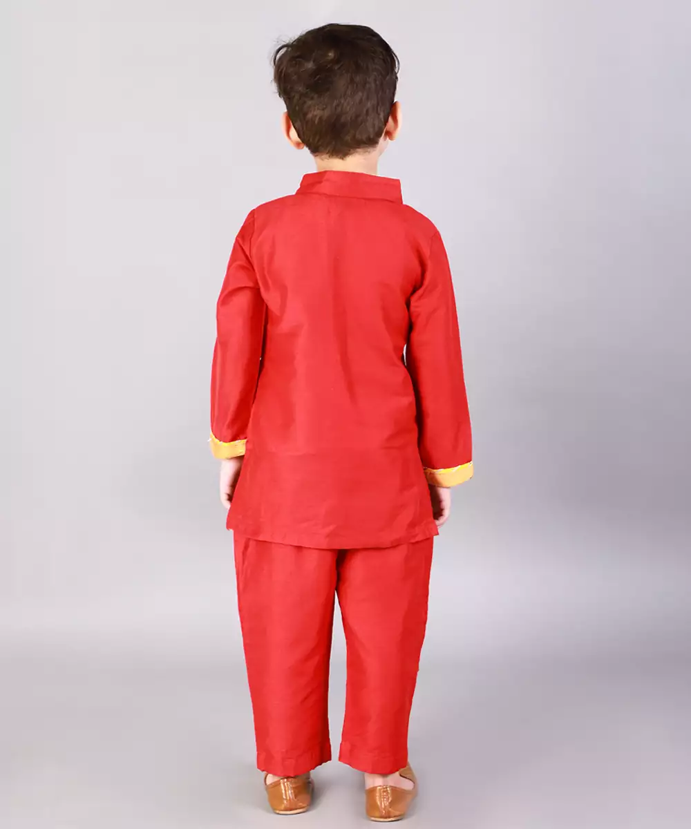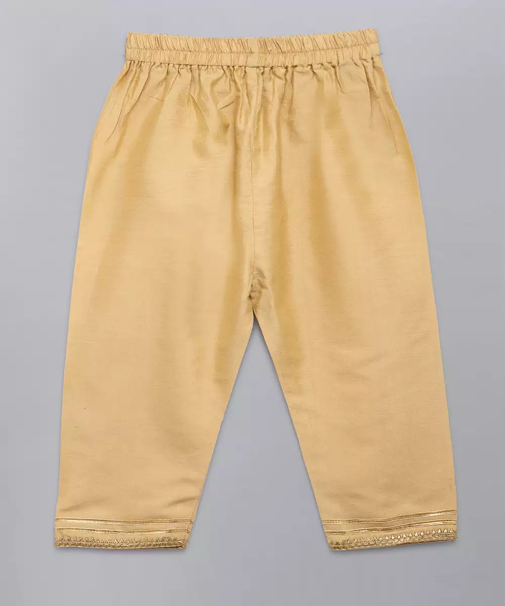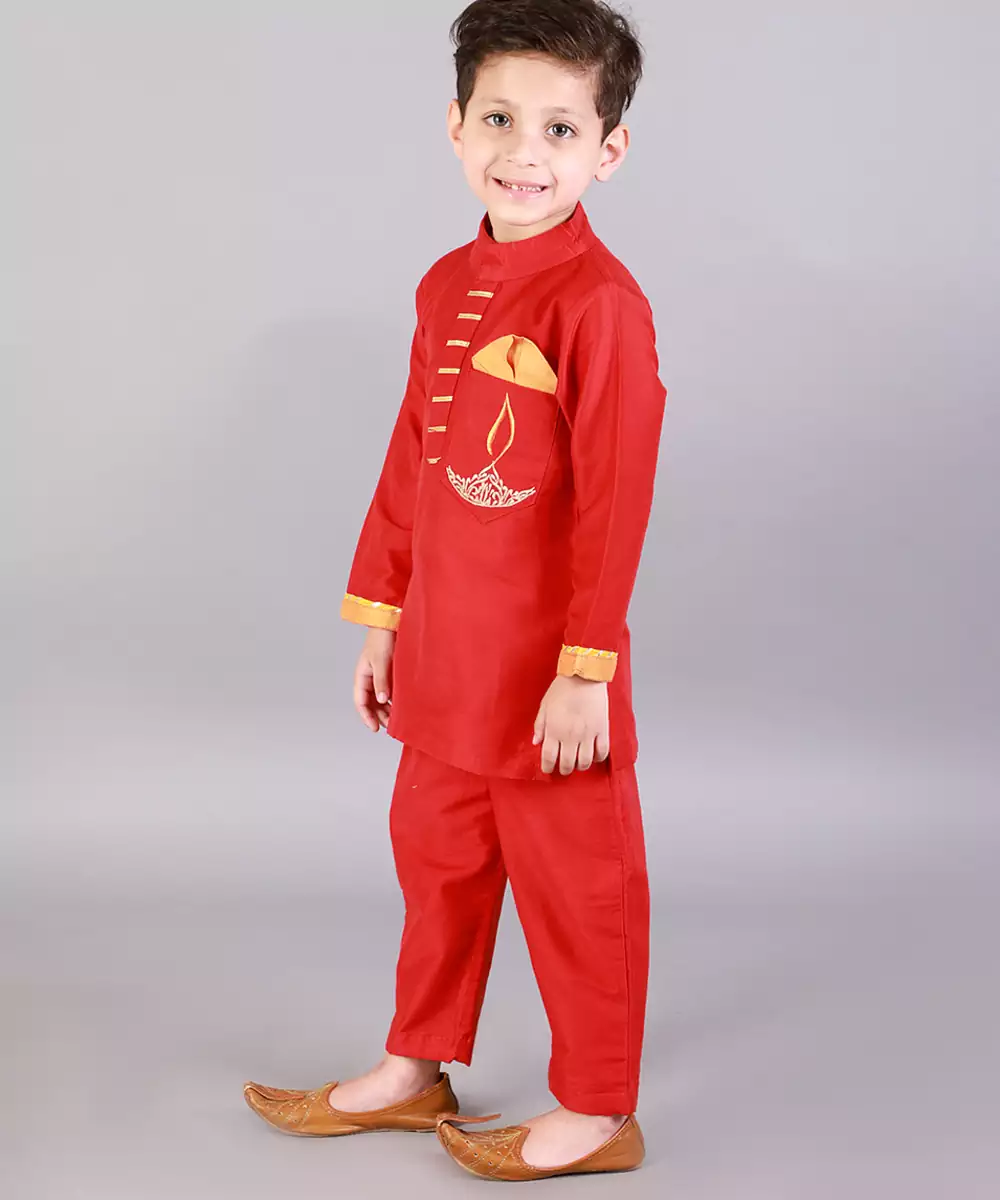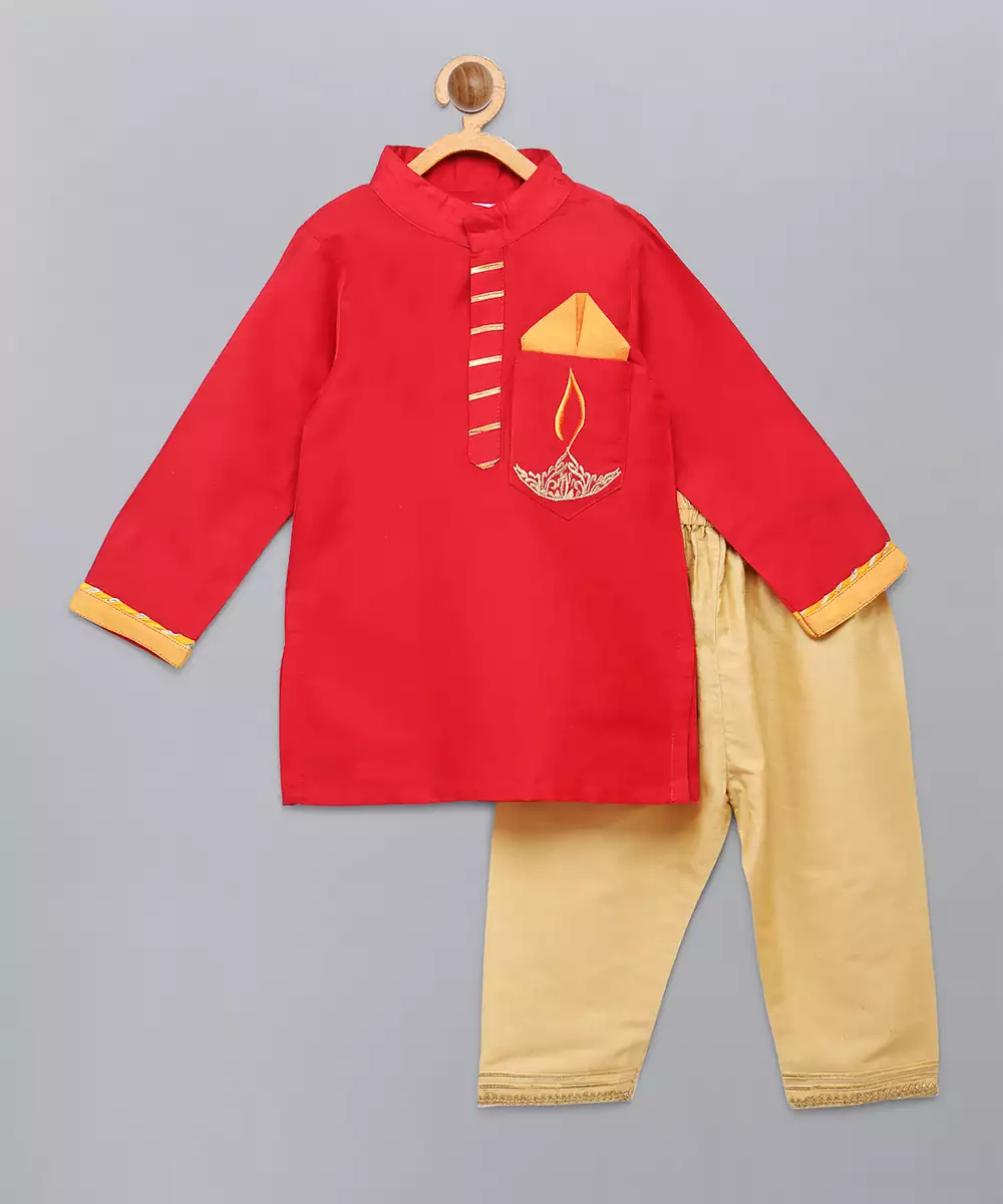 Red Firelamp Embroidered Pocket With Full Sleeves . Kurta With Front Opening . Kurta Placket With Gota Finishing . Beige Pyjamas With Lace Finishings . Bottom With Elasticated Waist .