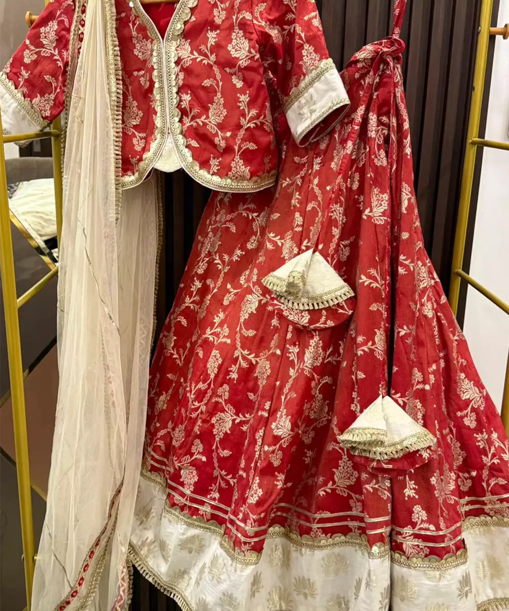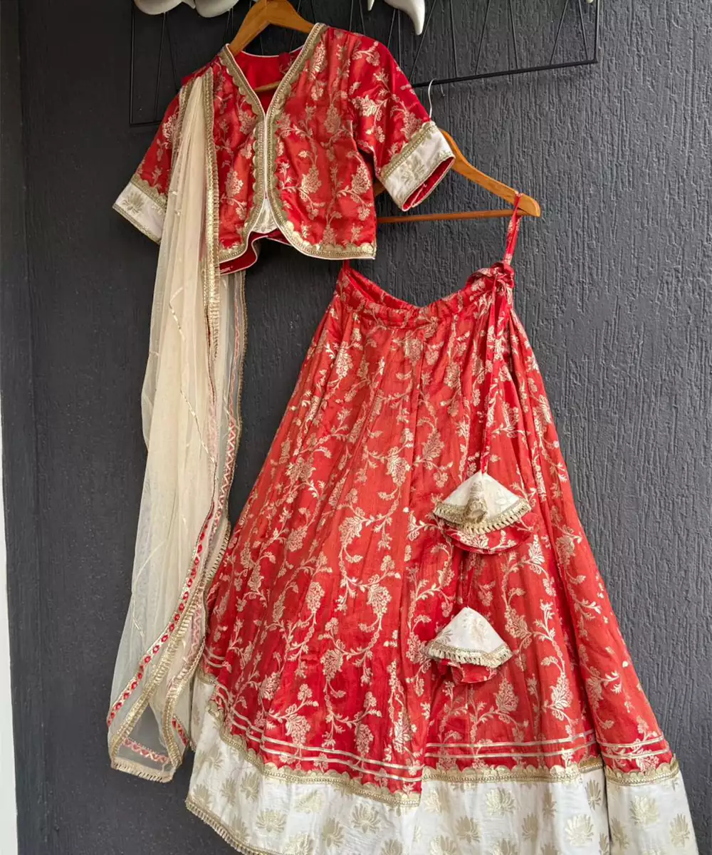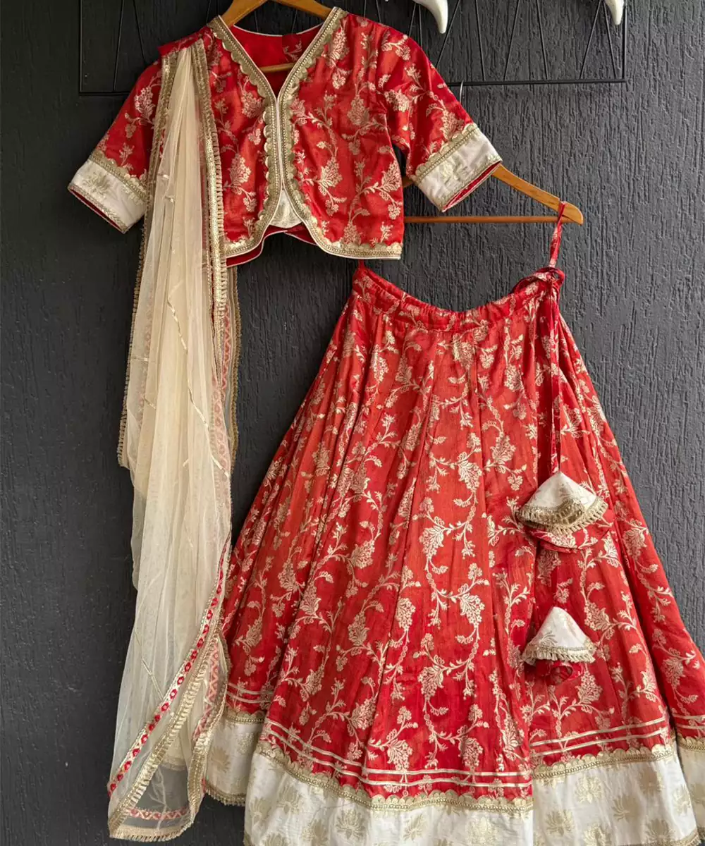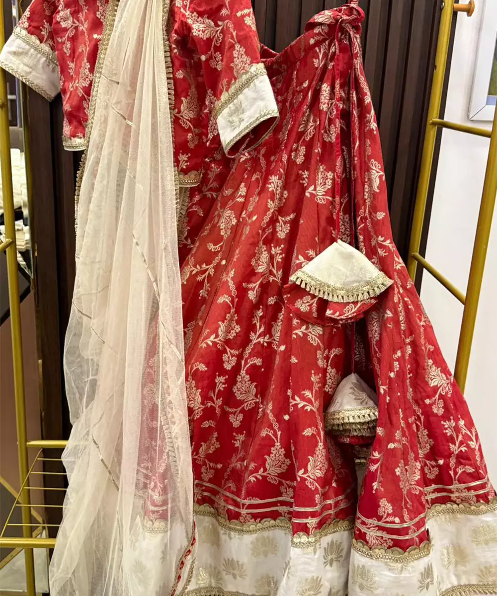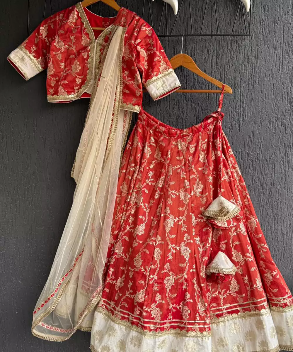 Red Ethnic Look Chnderi All Over Blouse And Lehnga With Lotus Chanderi Finishings. Top Comes With Lace Enahnacements And Back Opening Dupatta Comes In Soft Net Pre Pleated Look And Ready To Wear Lehnga Comes With Beautiful Tassels. Lehnga Doesnt Comes Wih Can Can(If Needed Will Be Extra Chargeabe ).For Any Cusotmisations Contact Us On 9389741726.